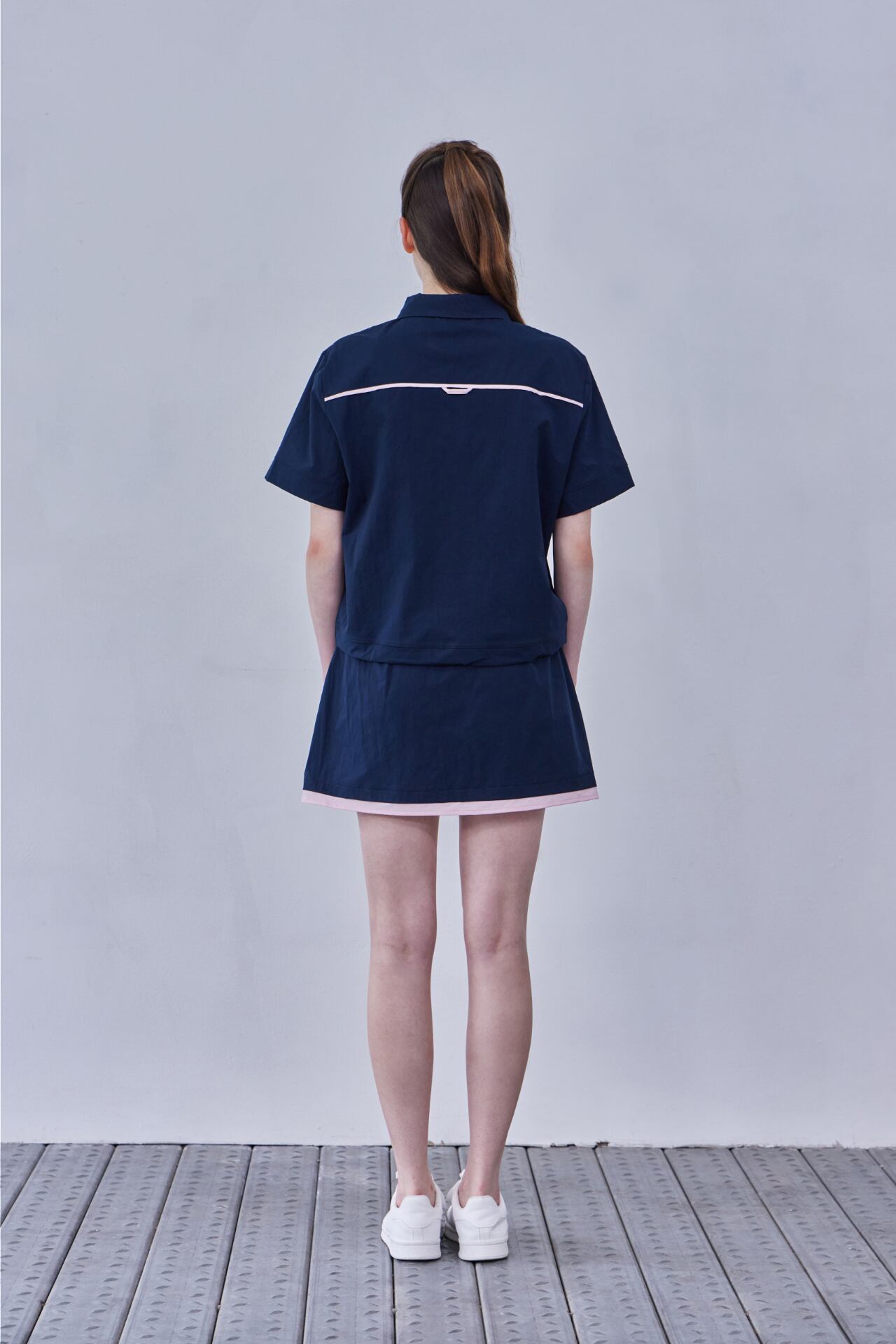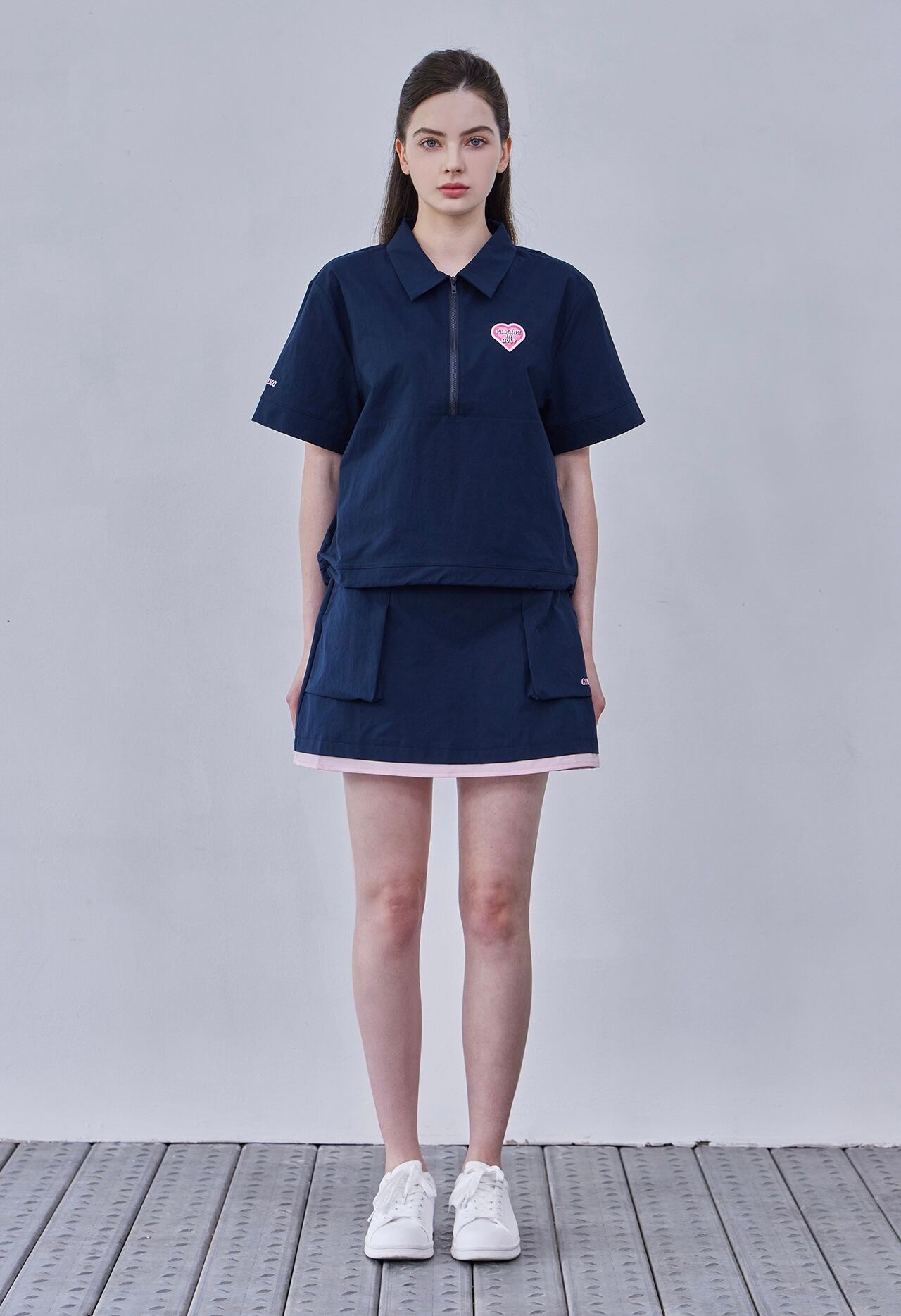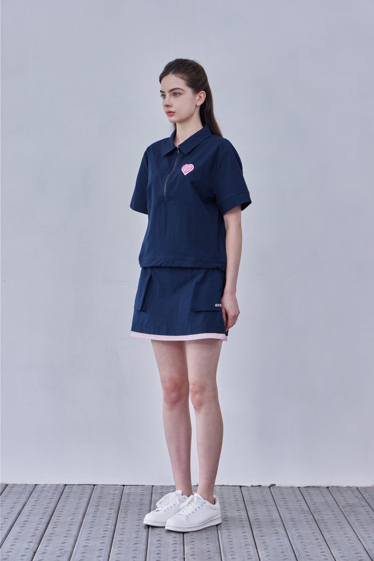 カラーネックハーフジップアップトップと立体ポケットスカートで構成された機能性ツーピースです。