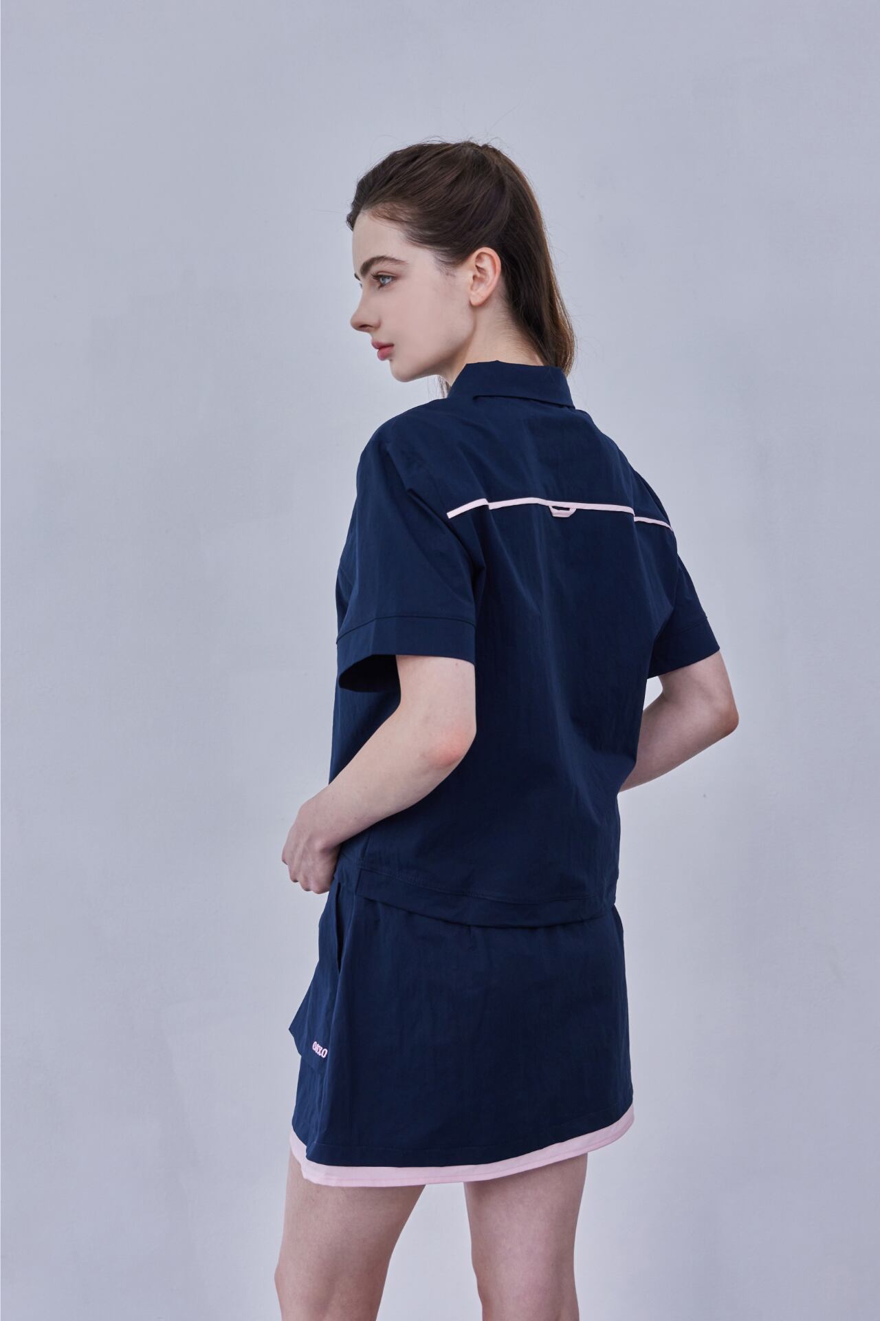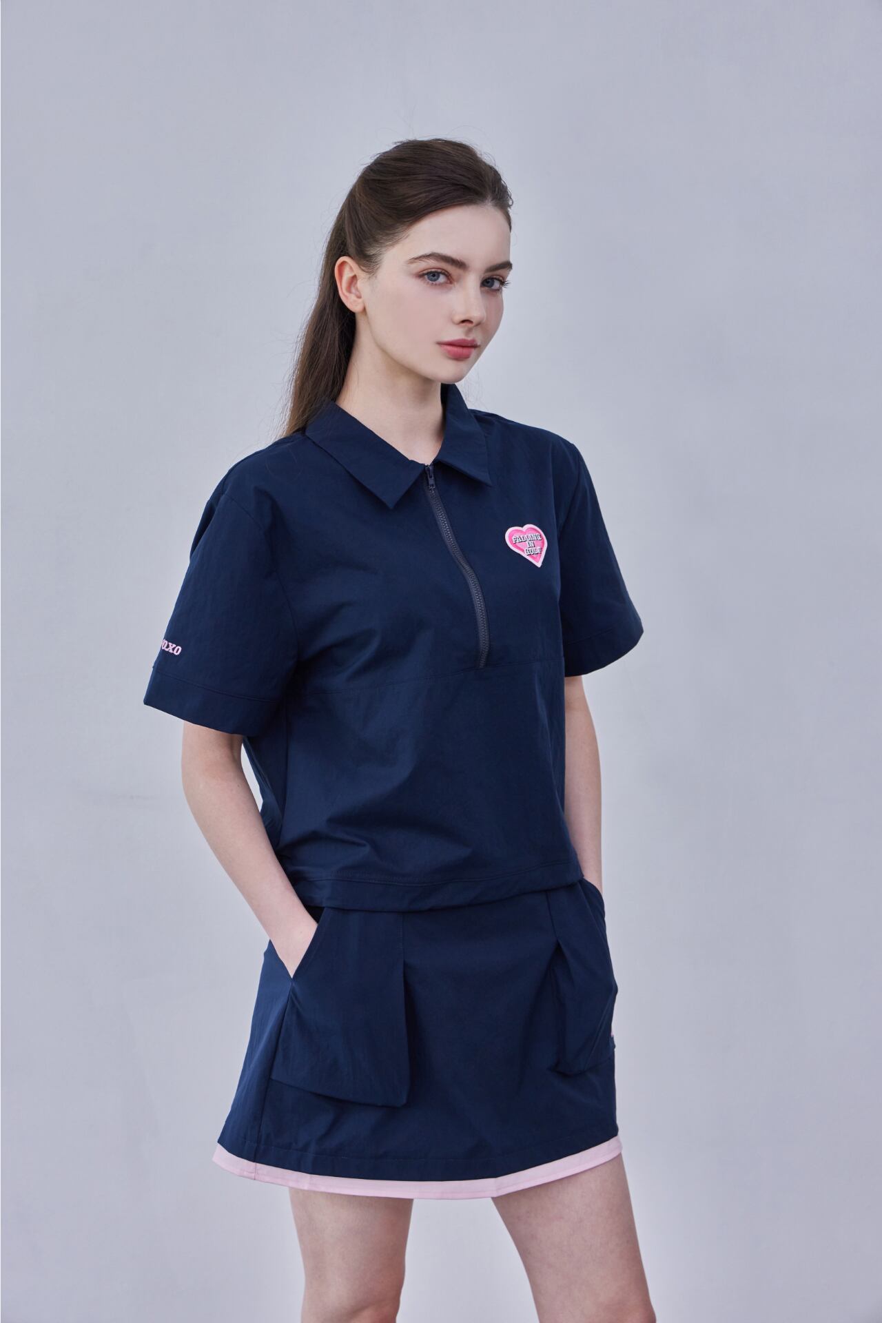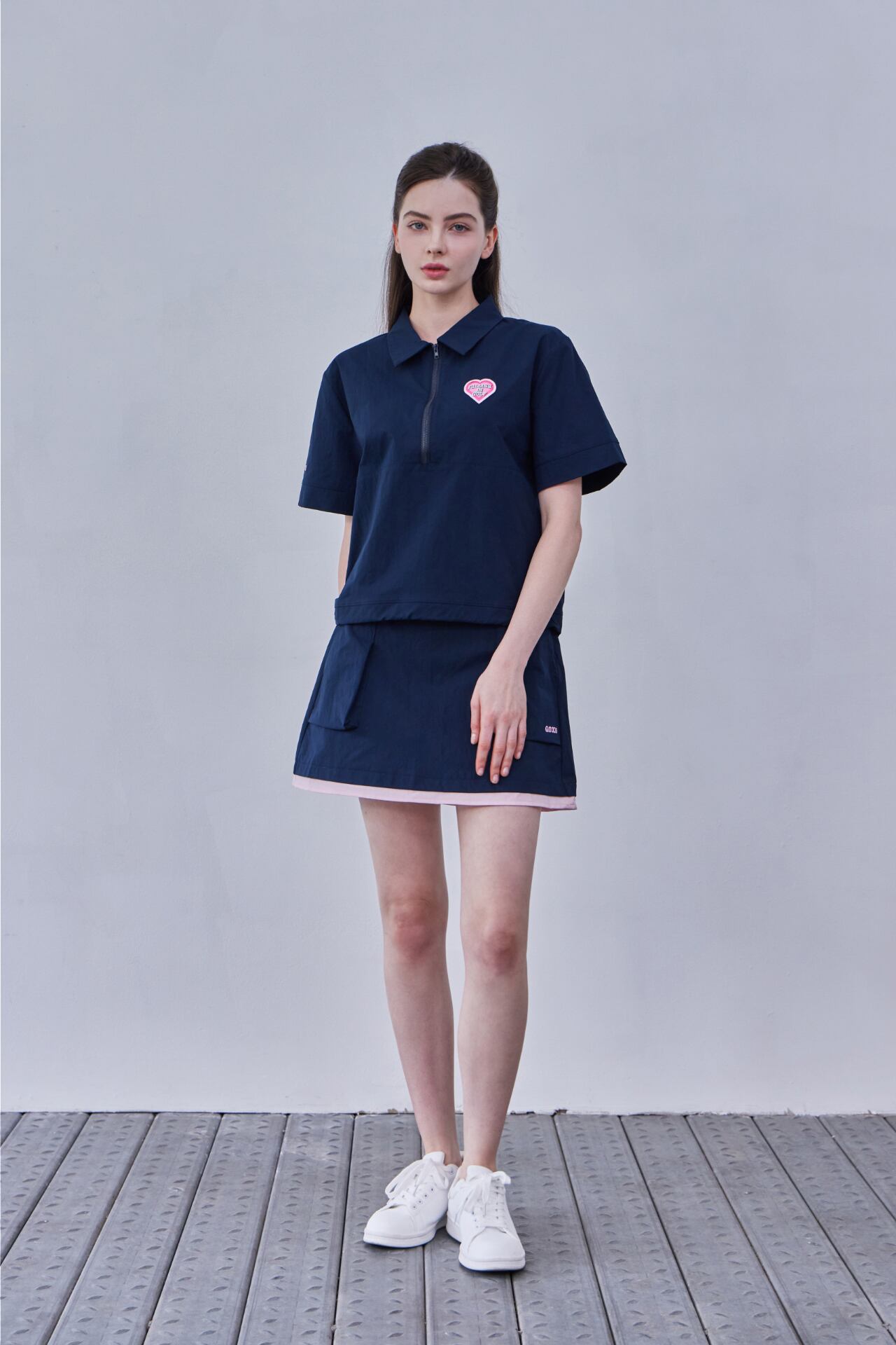 カラーネックハーフジップアップトップと立体ポケットスカートで構成された機能性ツーピースです。