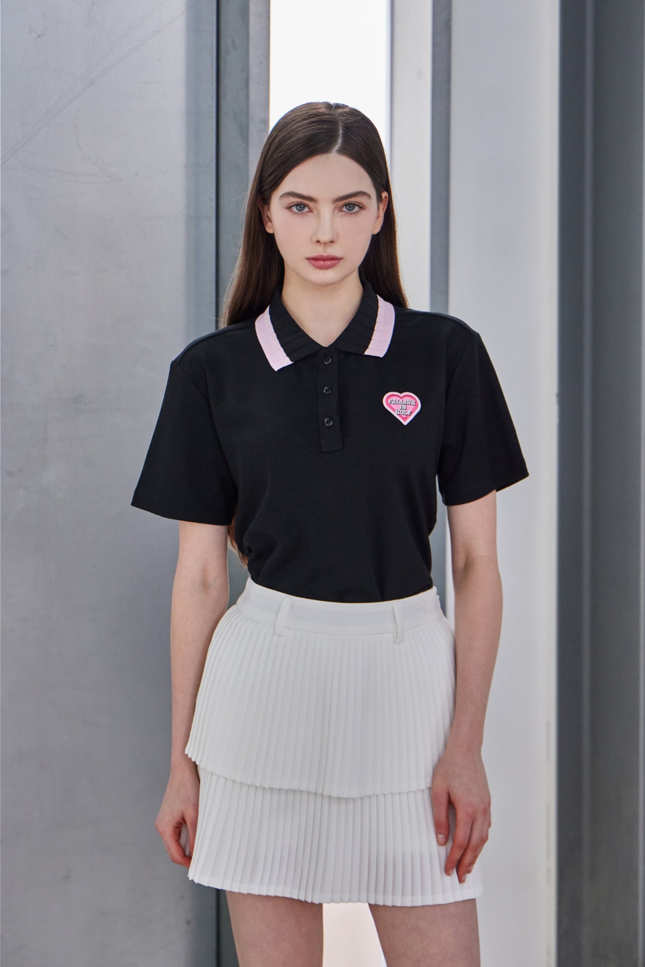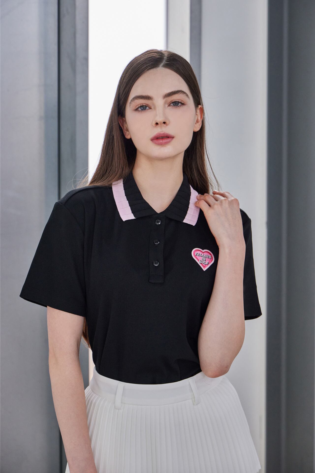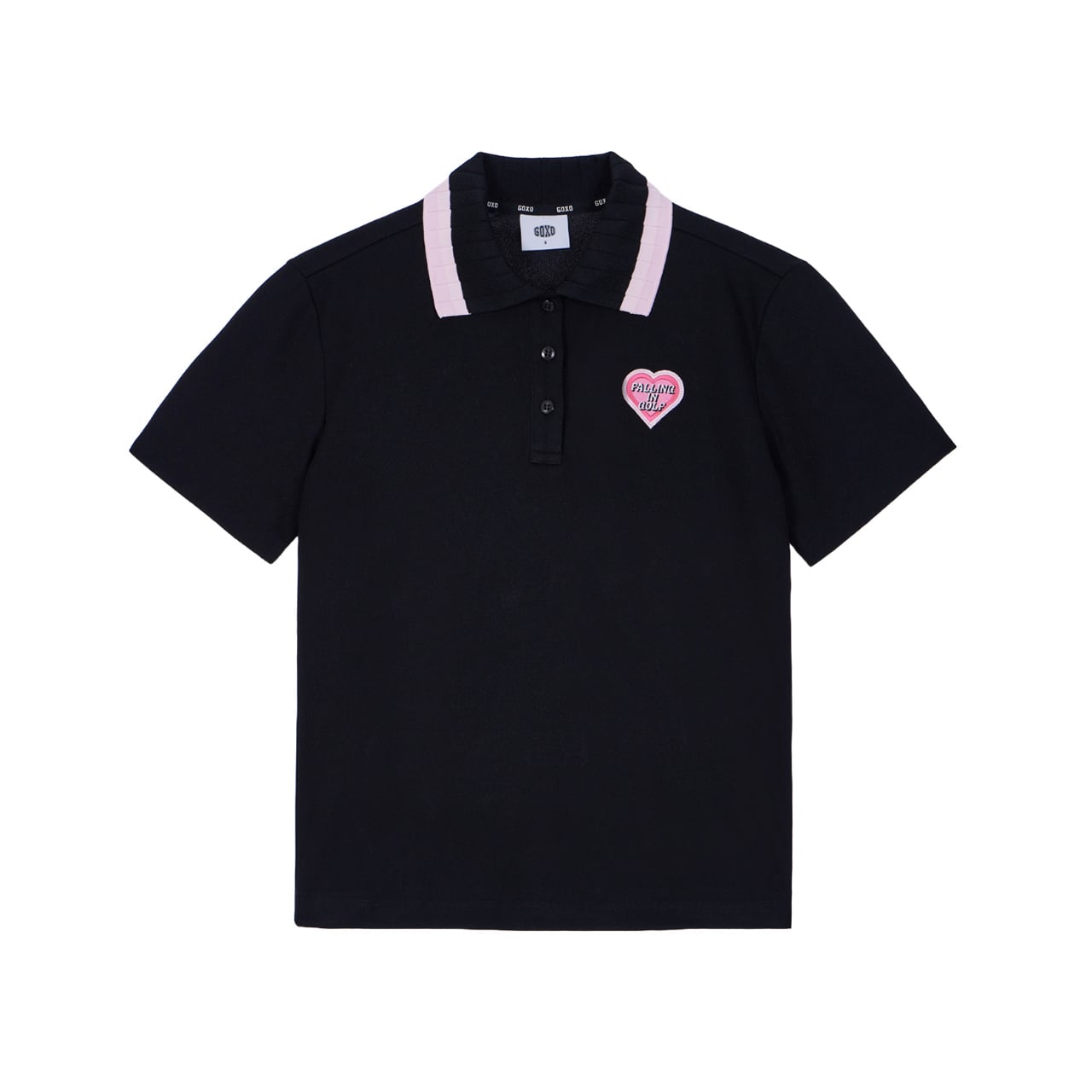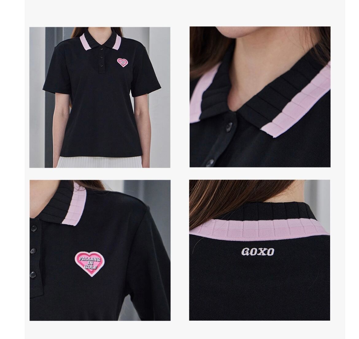ピンク配色の襟とハートロゴのディテールでラブリーなムードを加えた半袖ポロトップです。