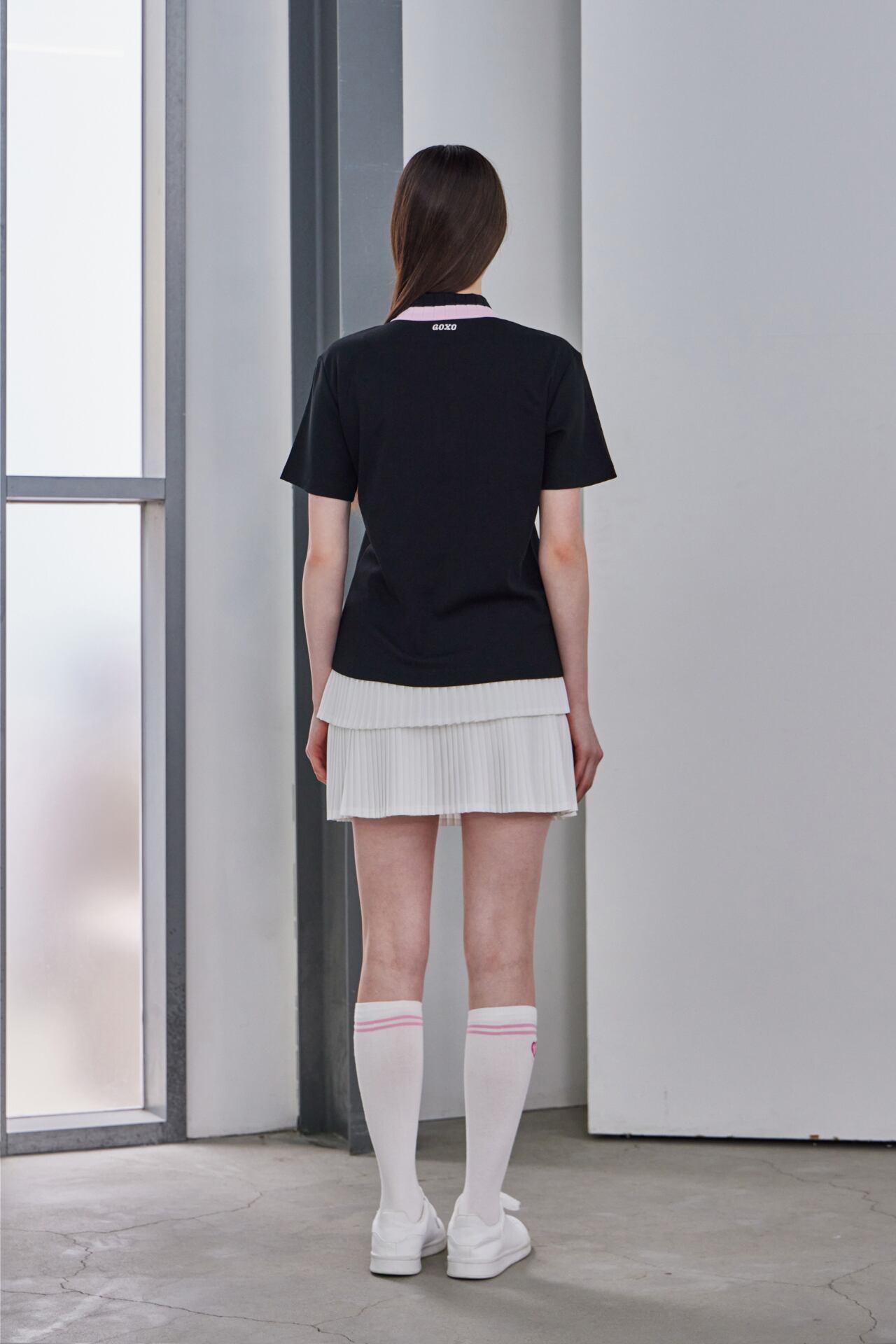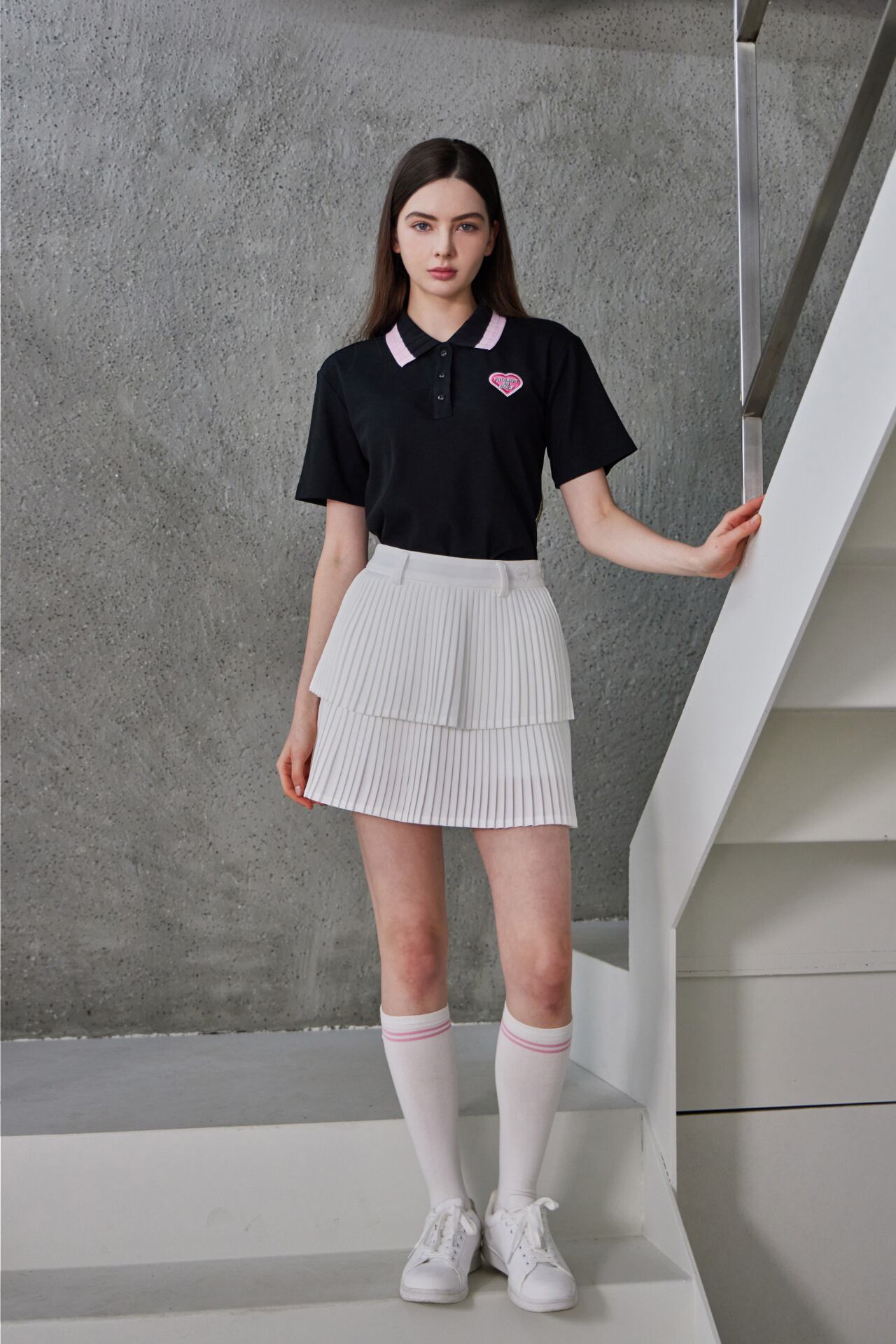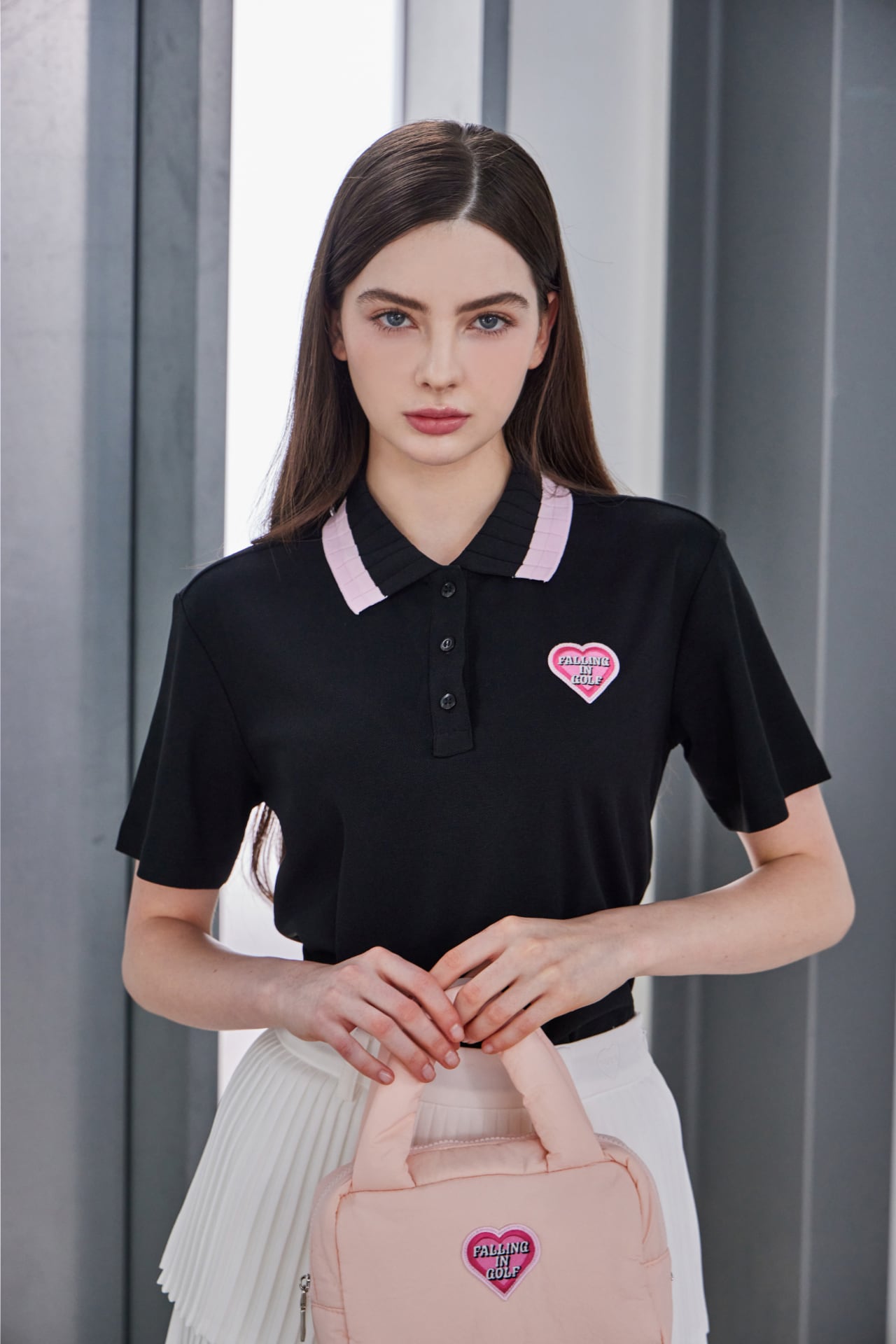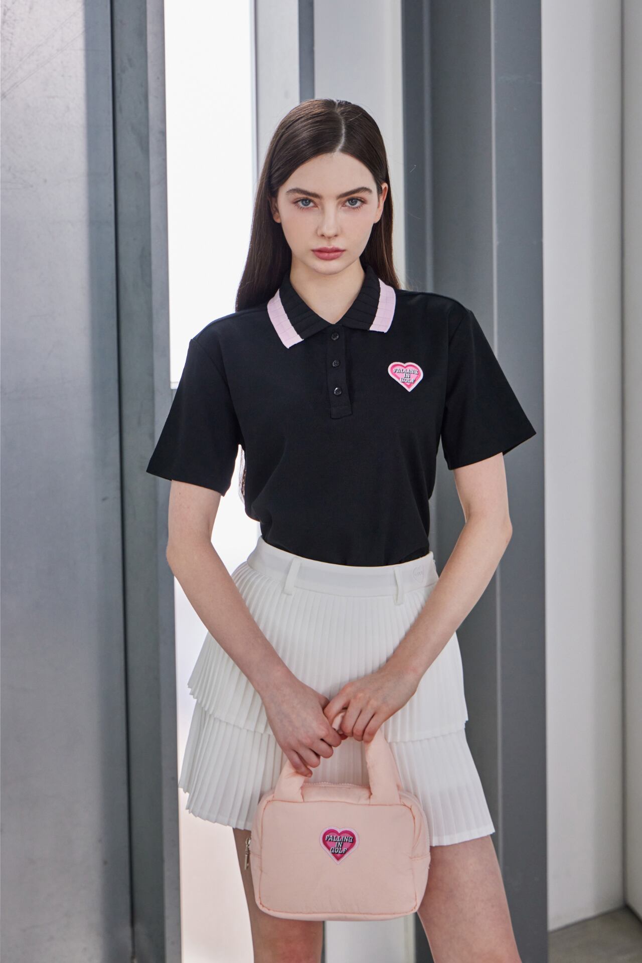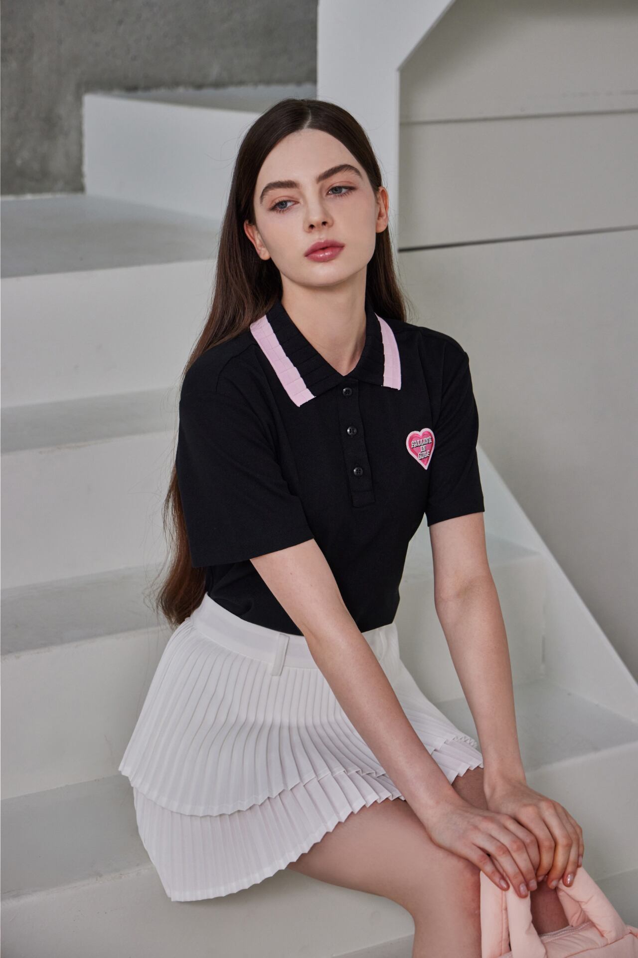 ピンク配色の襟とハートロゴのディテールでラブリーなムードを加えた半袖ポロトップです。