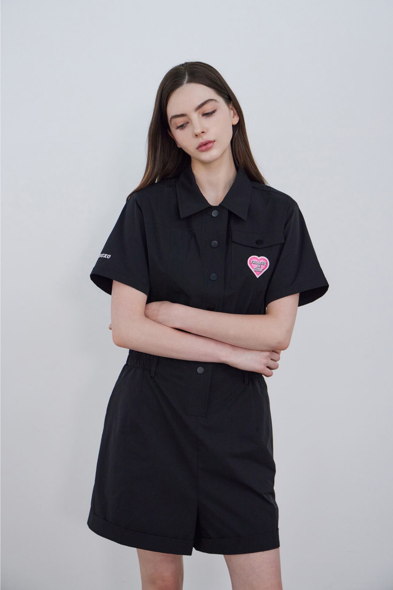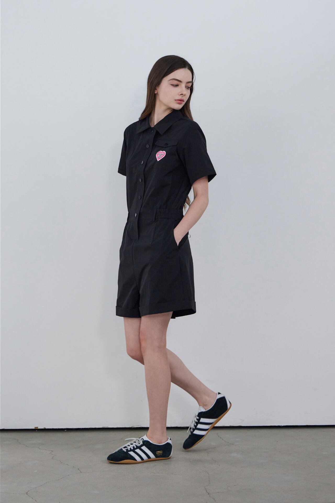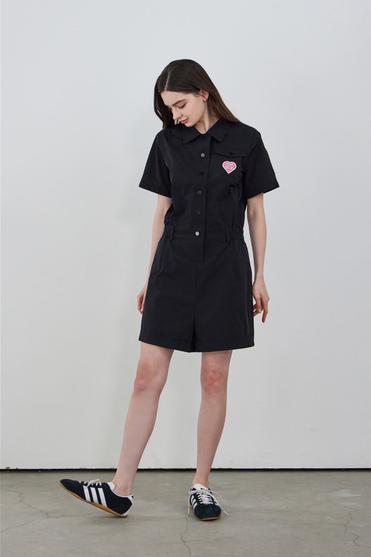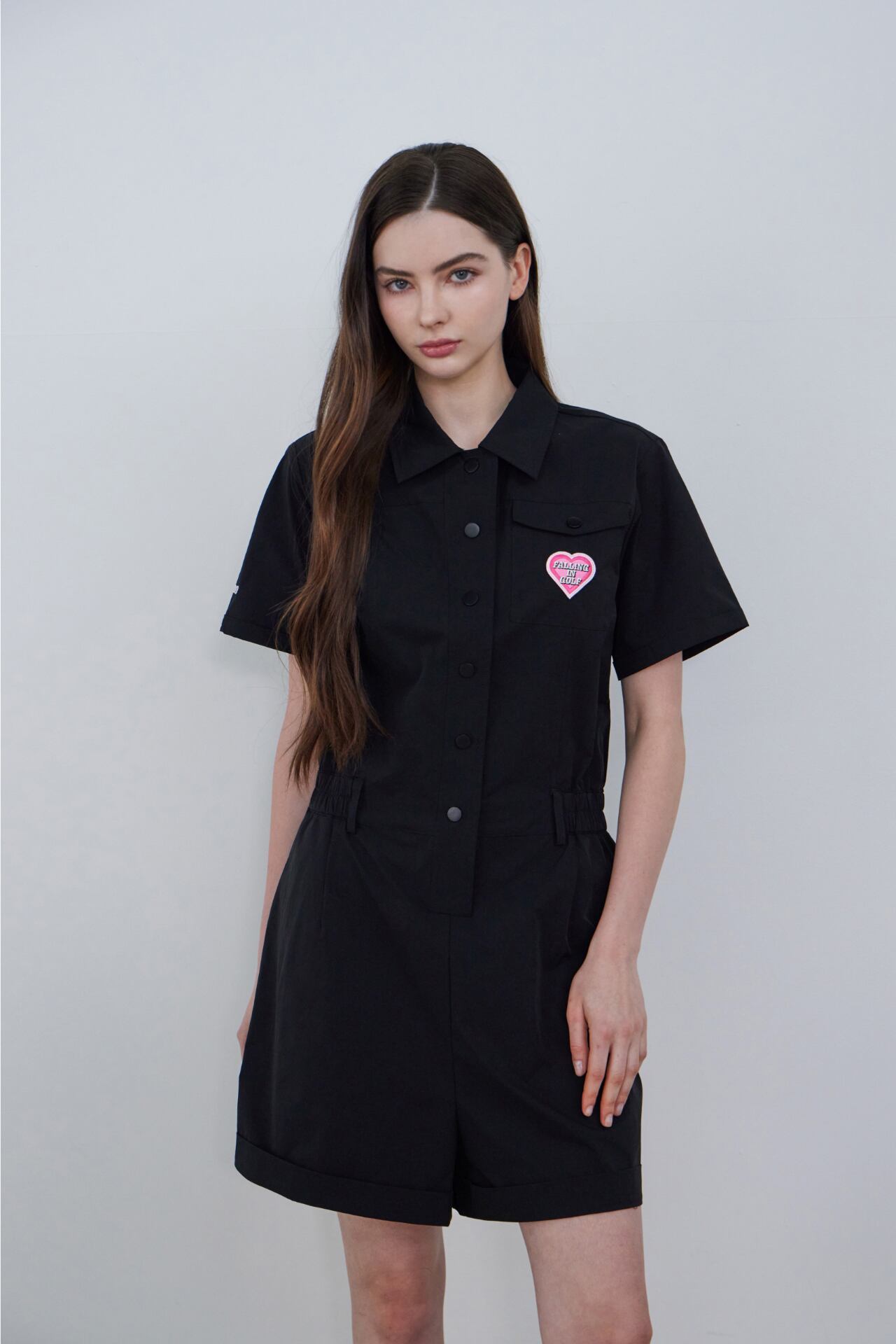 襟ネックとフロントボタンのディテールで端正なムードを加えたハーフスリーブジャンプスーツです。