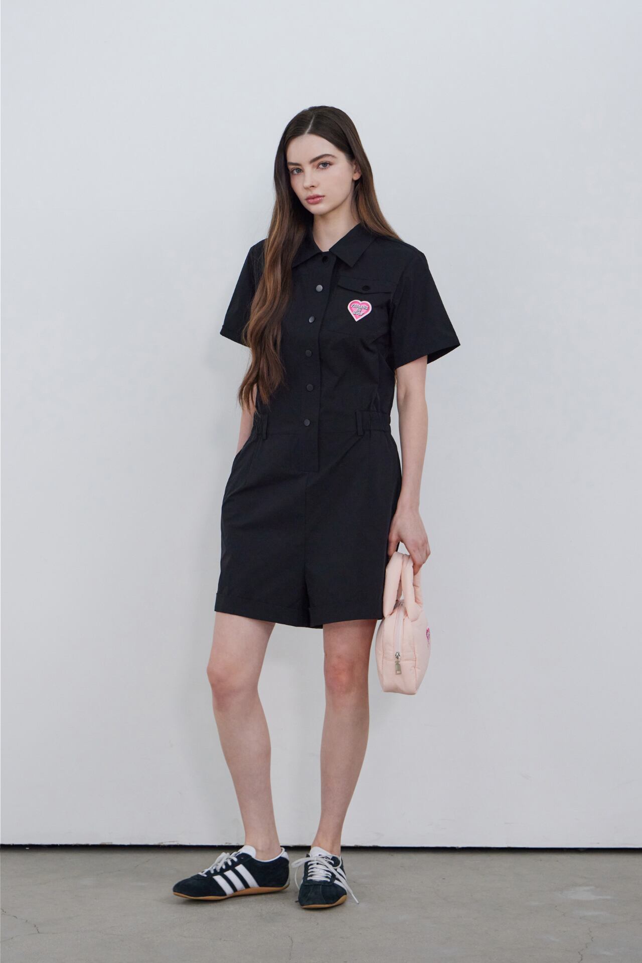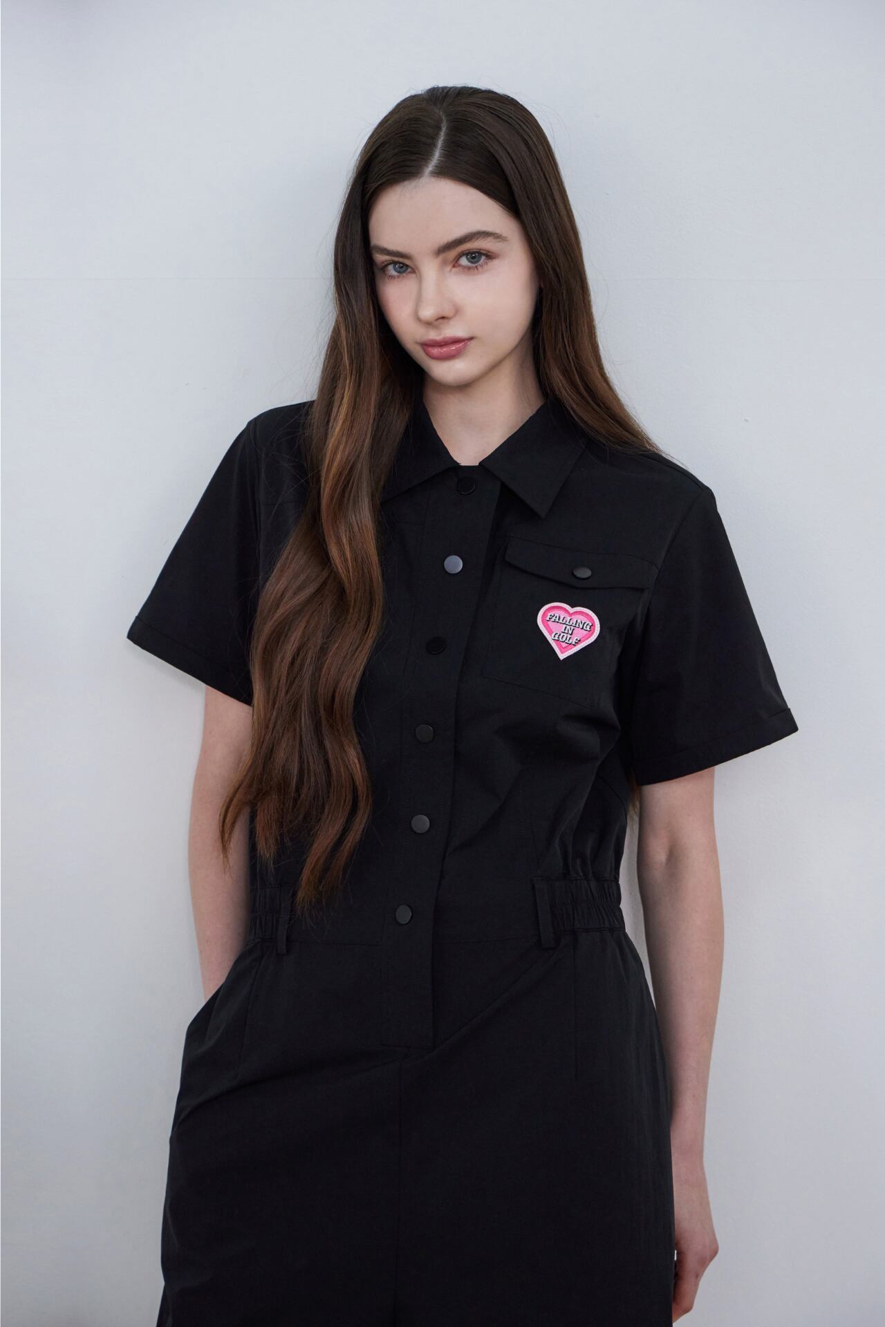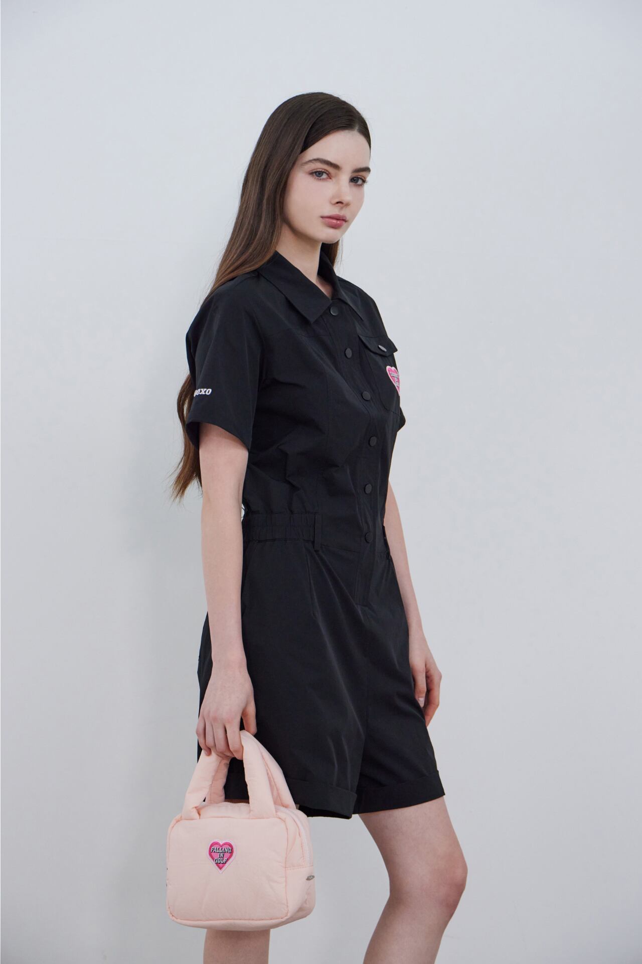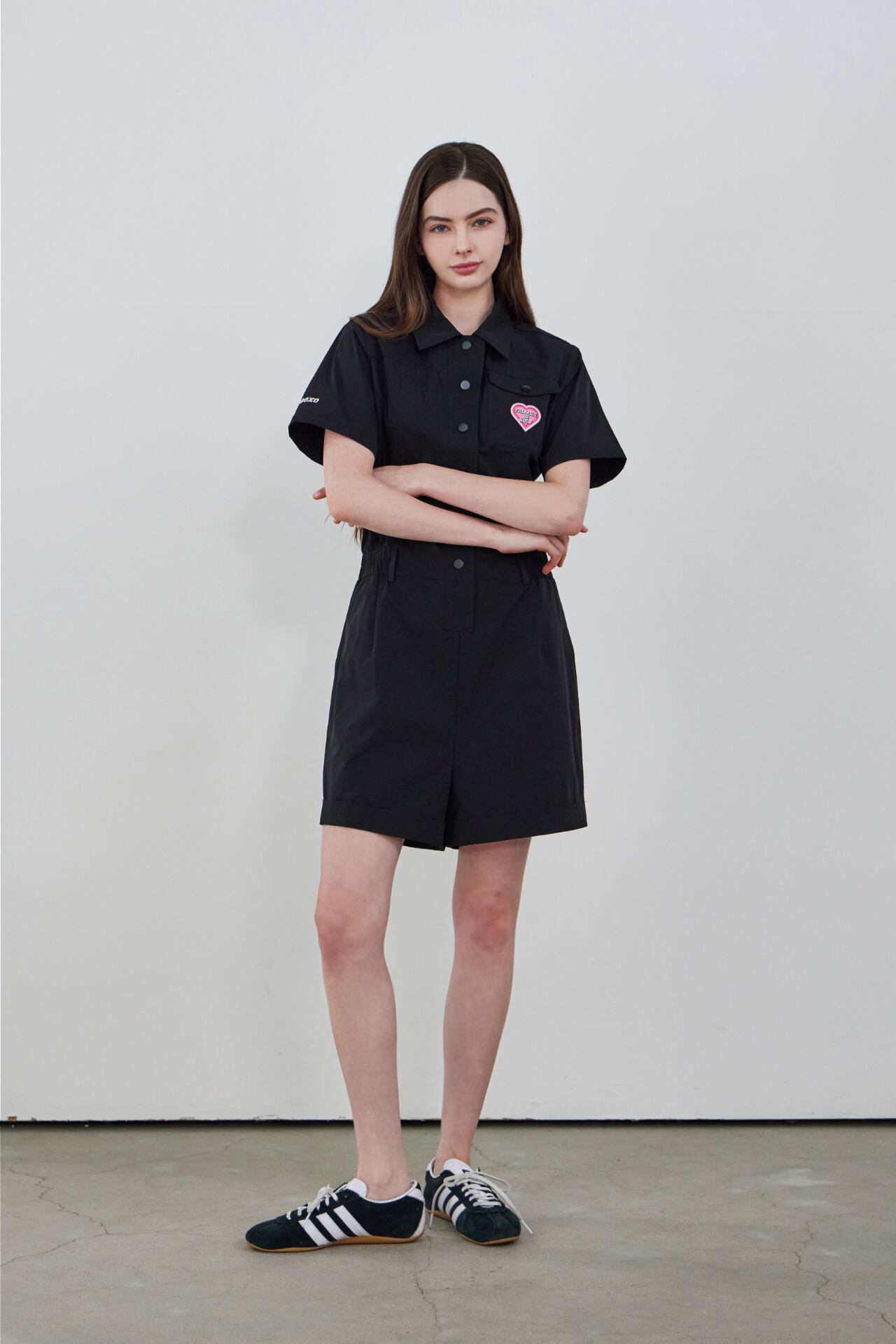 襟ネックとフロントボタンのディテールで端正なムードを加えたハーフスリーブジャンプスーツです。