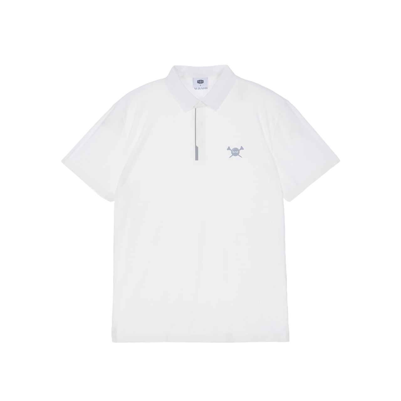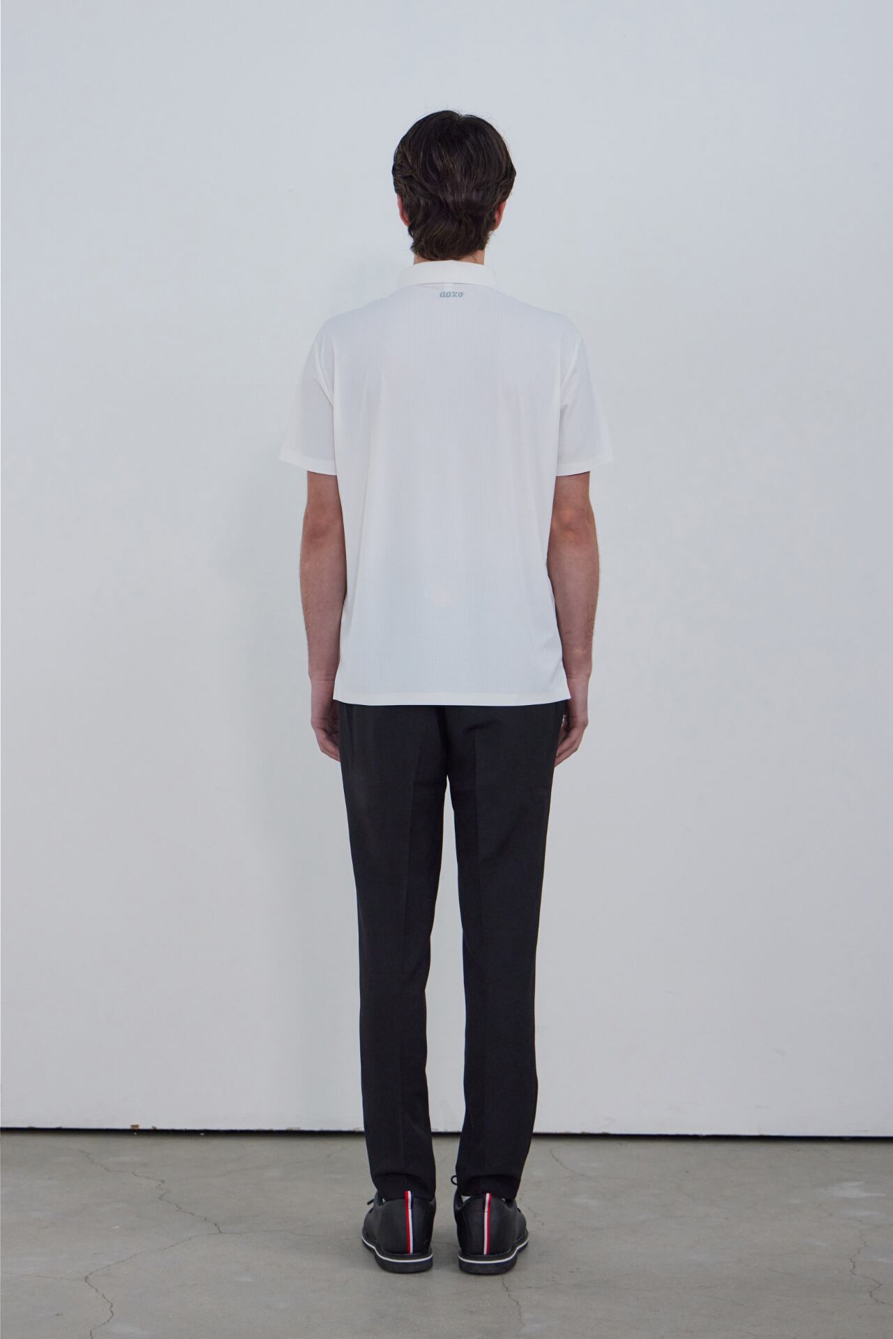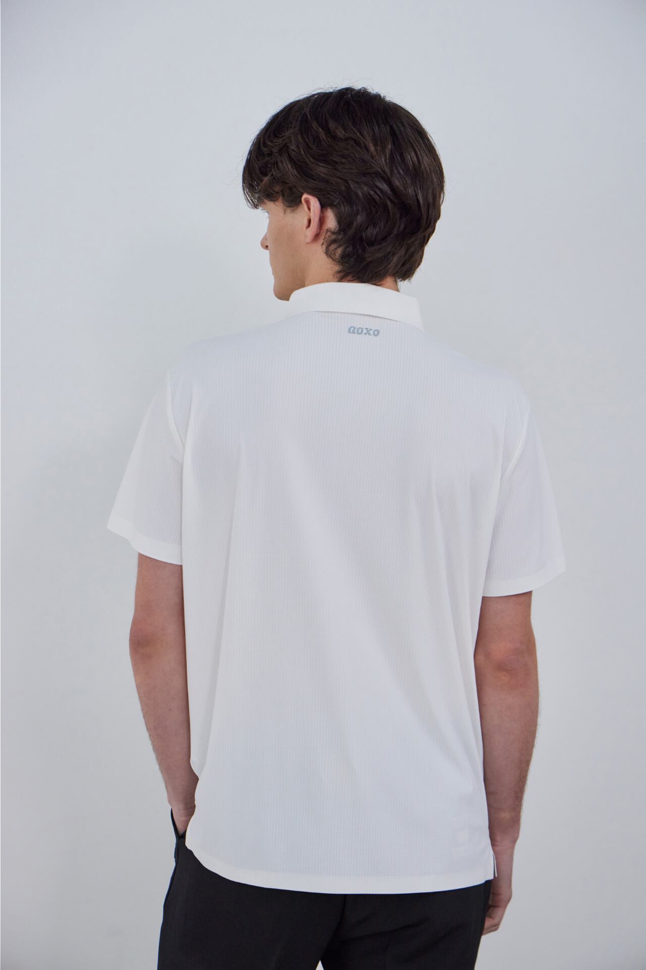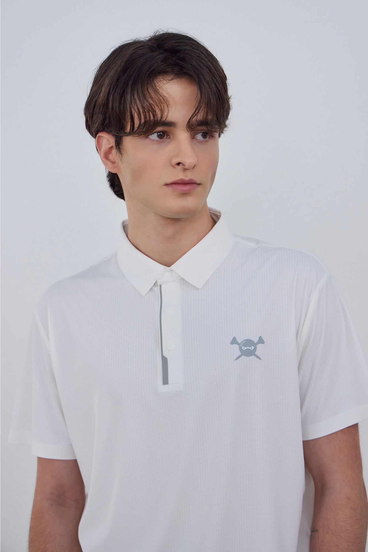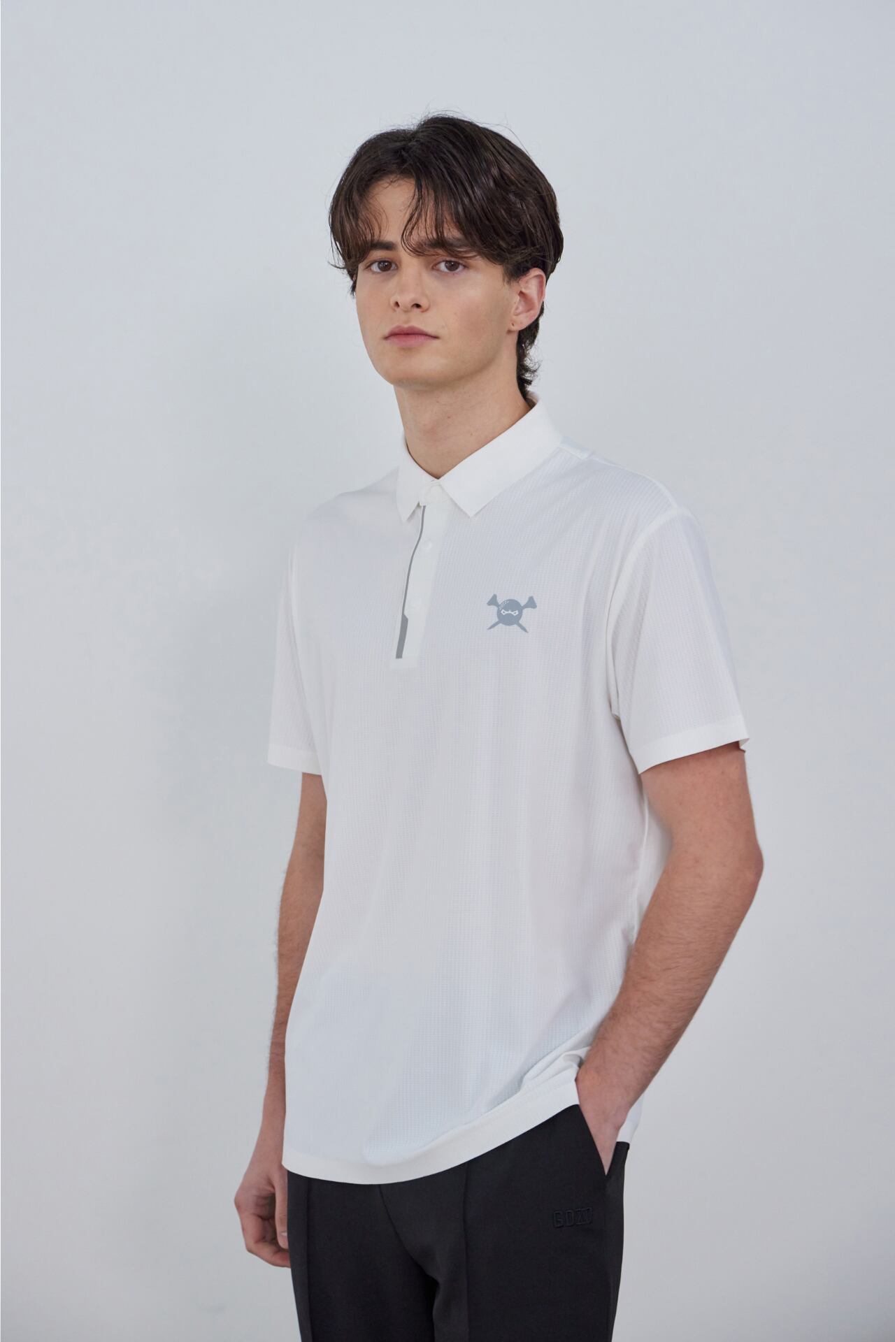 配色ボタンクロージングと節制されたシルエットが特徴の機能性半袖襟Tシャツです。