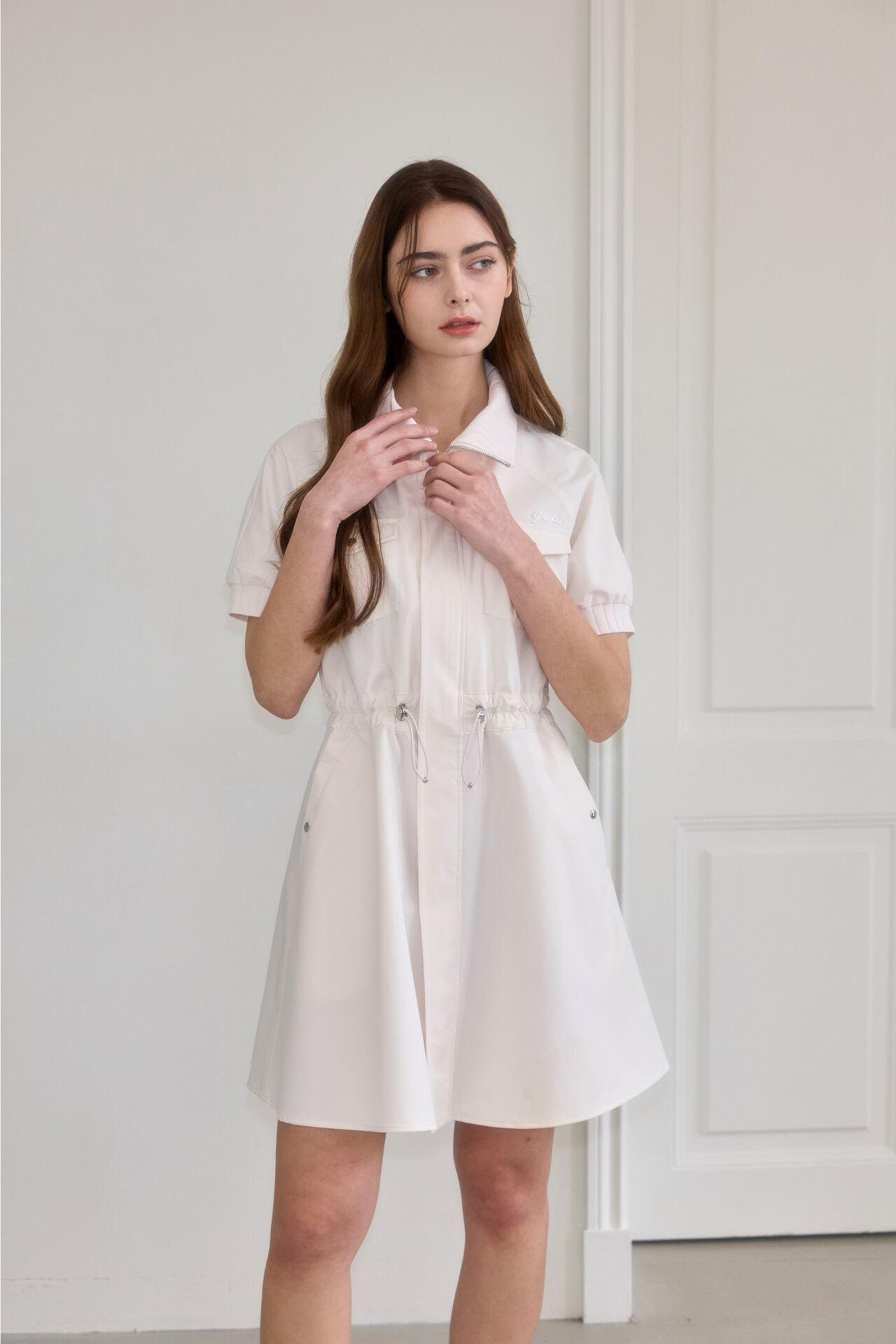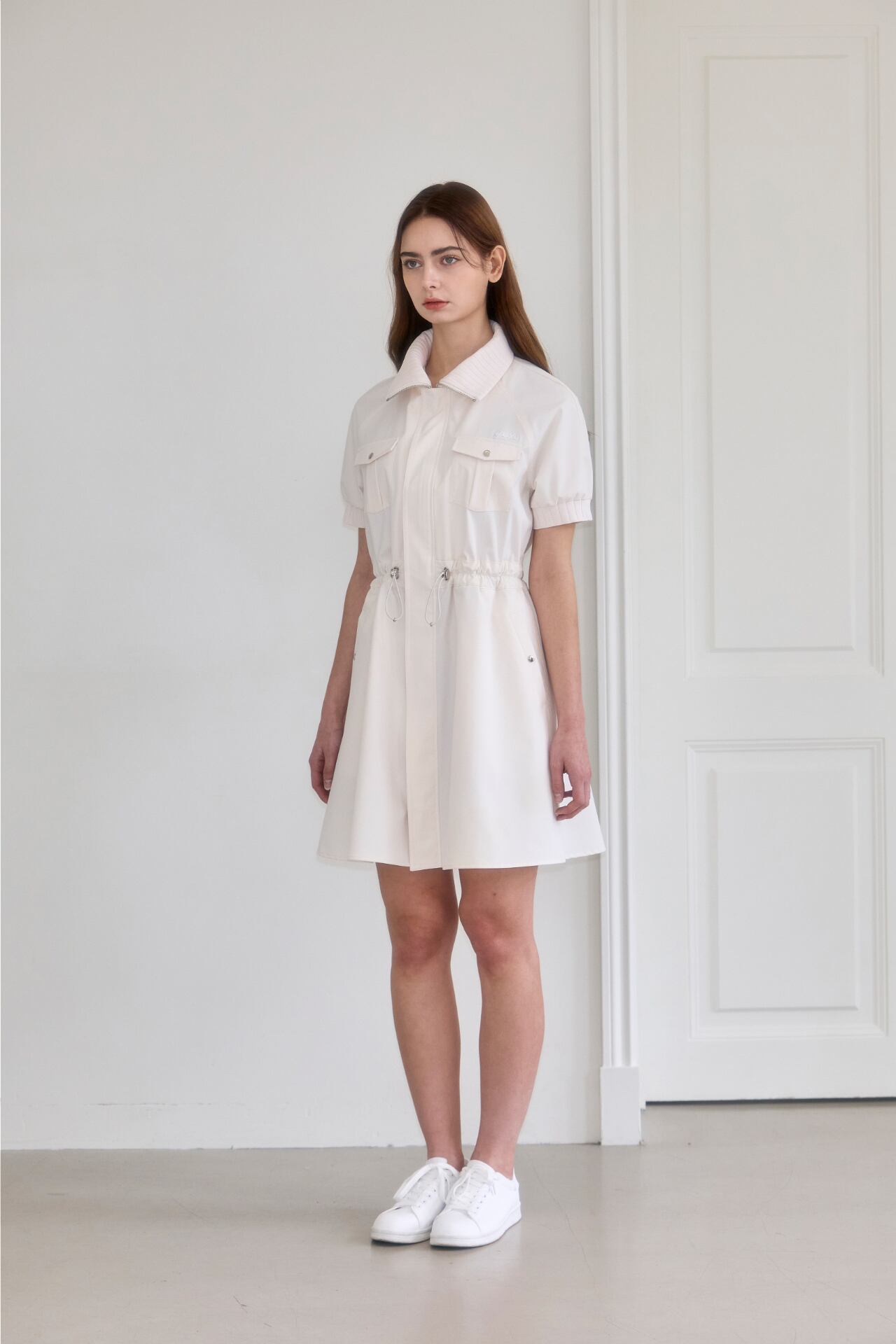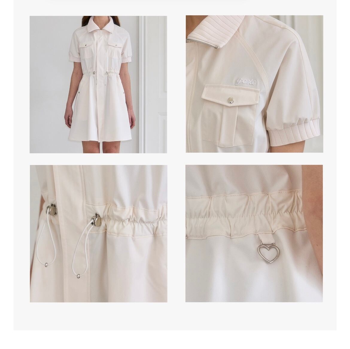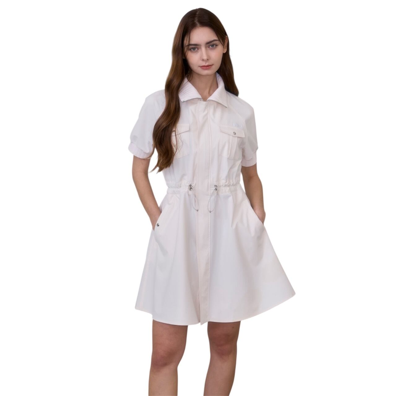 2wayジッパーで簡単に着用でき、アウターで演出または、ウエストストリングで調節してワンピースとしても着られる2wayスタイルのワンピースです。