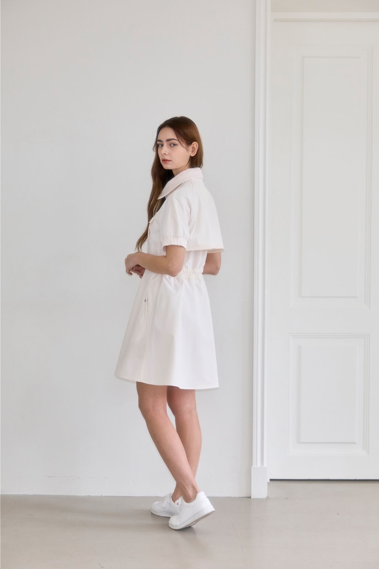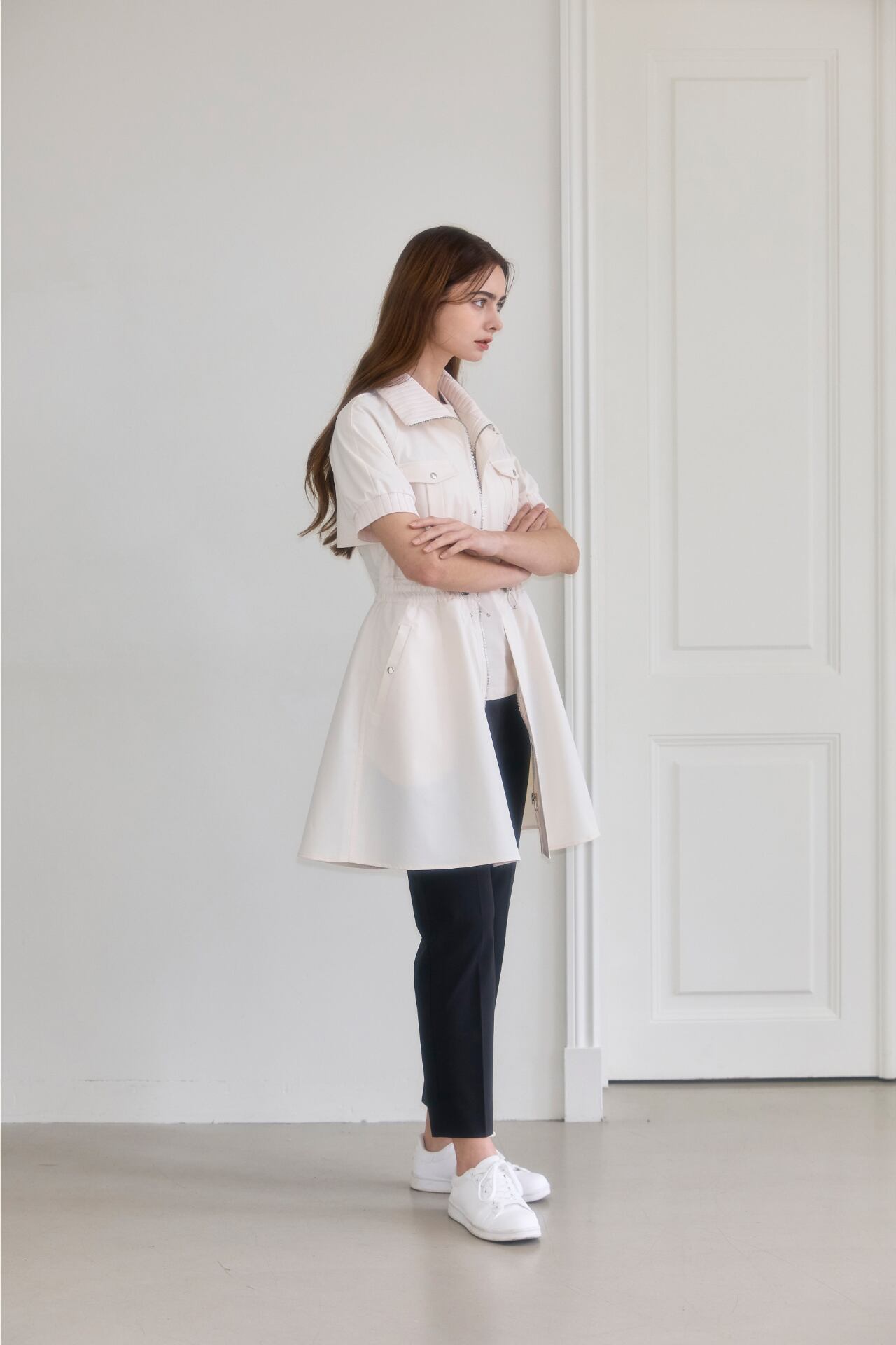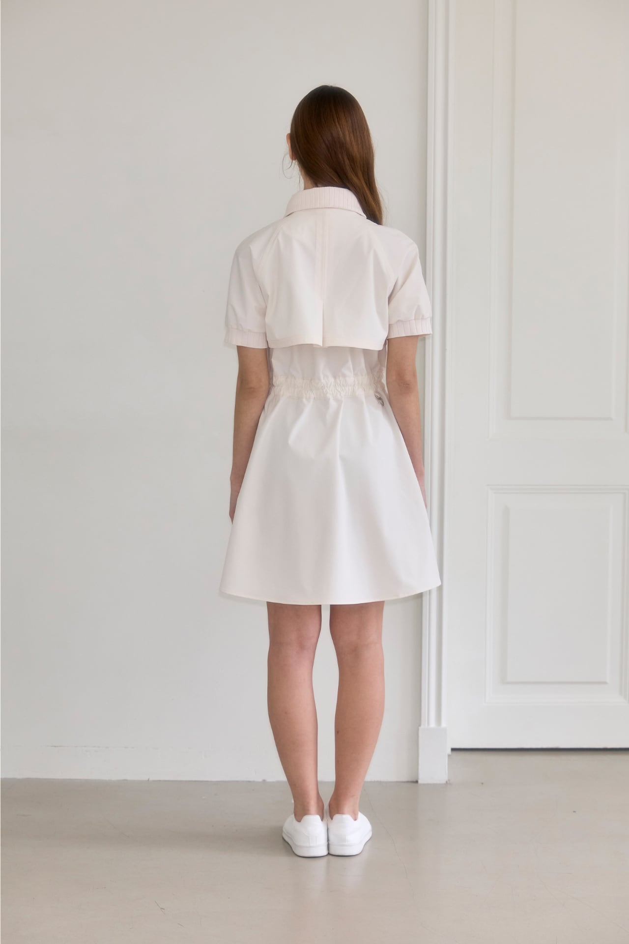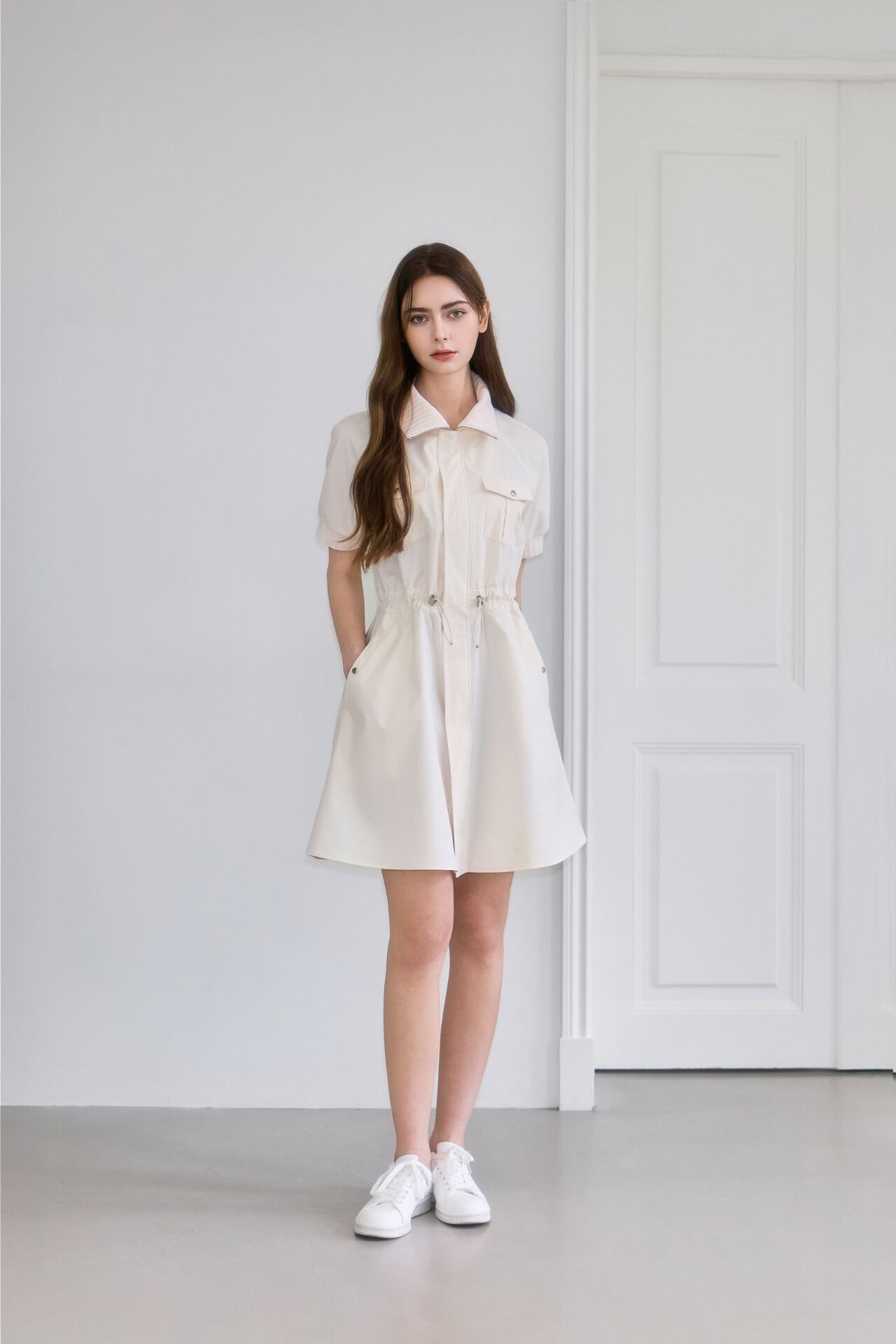 2wayジッパーで簡単に着用でき、アウターで演出または、ウエストストリングで調節してワンピースとしても着られる2wayスタイルのワンピースです。