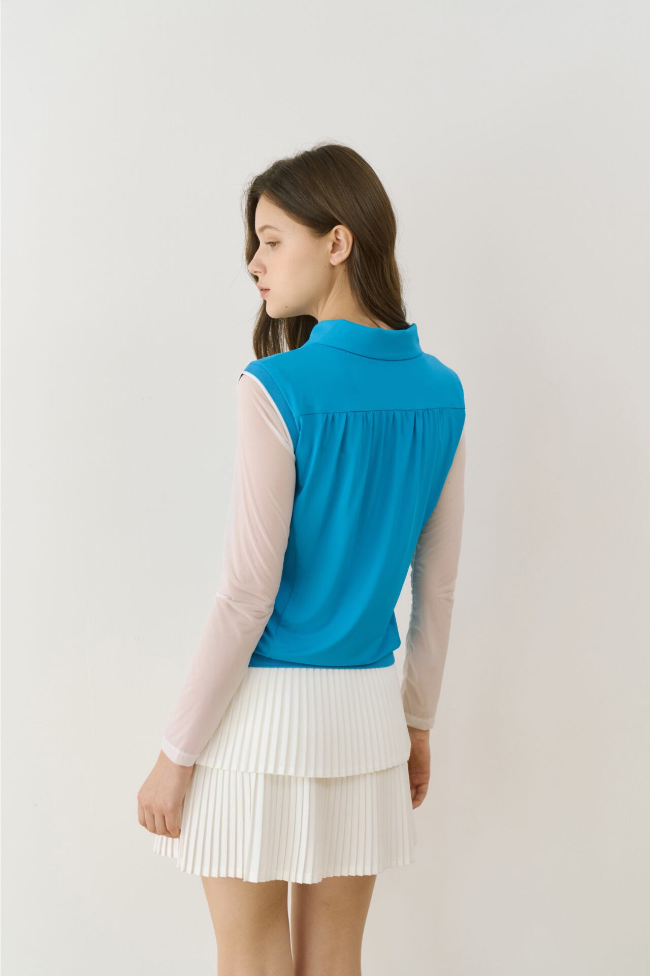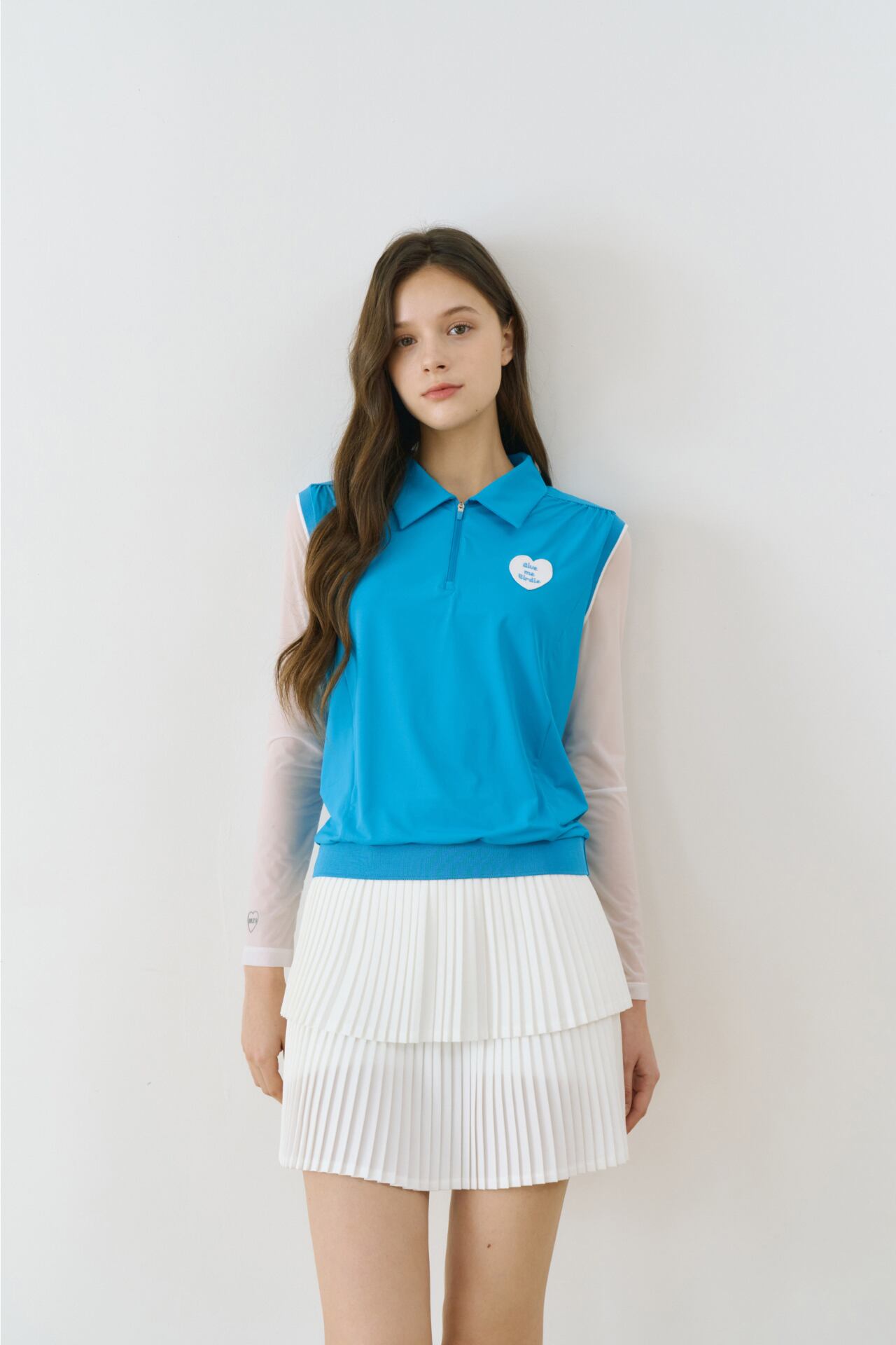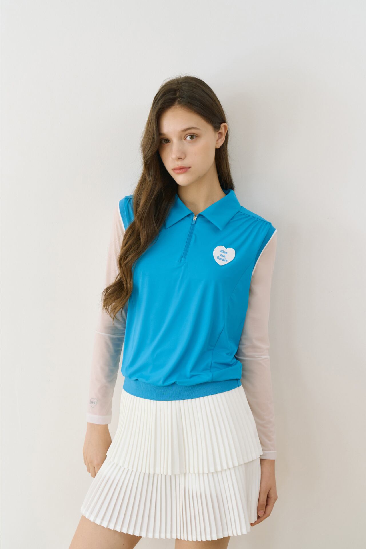 ロゴ刺繍アートワークがポイントになるスリーブレスハーフジップアップTシャツです。
