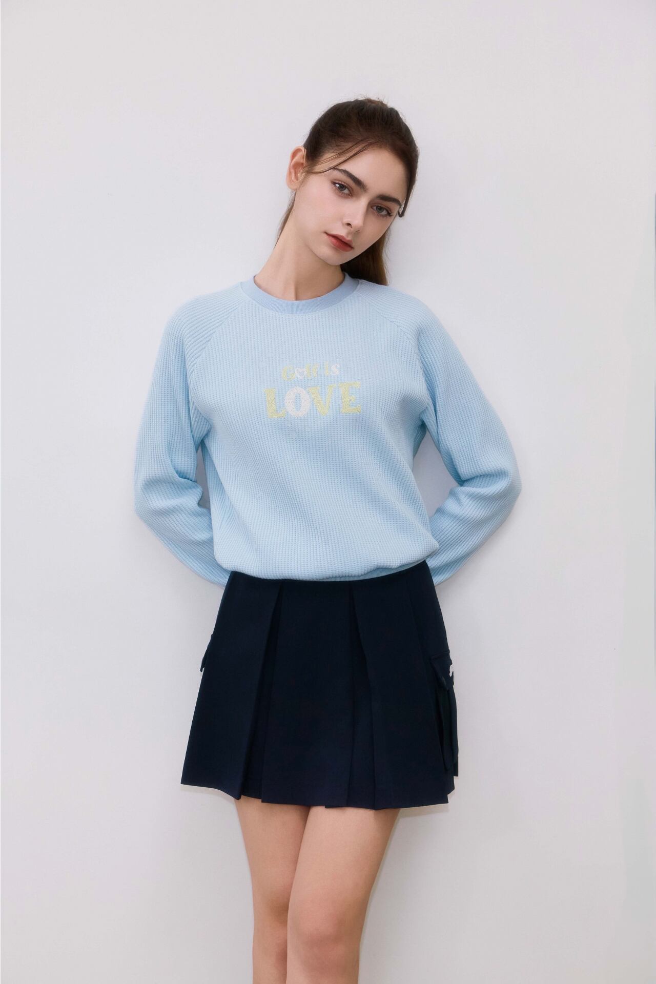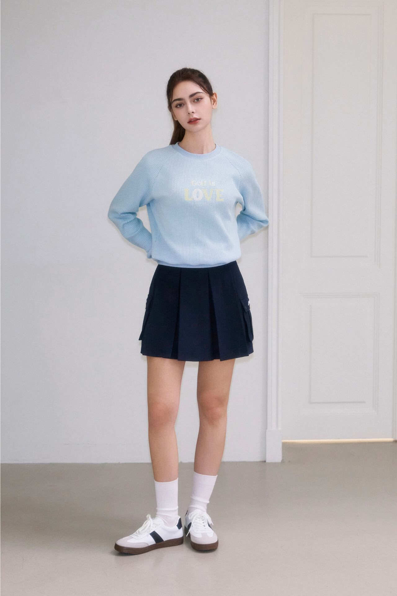 伸縮性のあるスパン混紡素材を使って楽な着用感を伝えてくれるプリーツスカートです。
