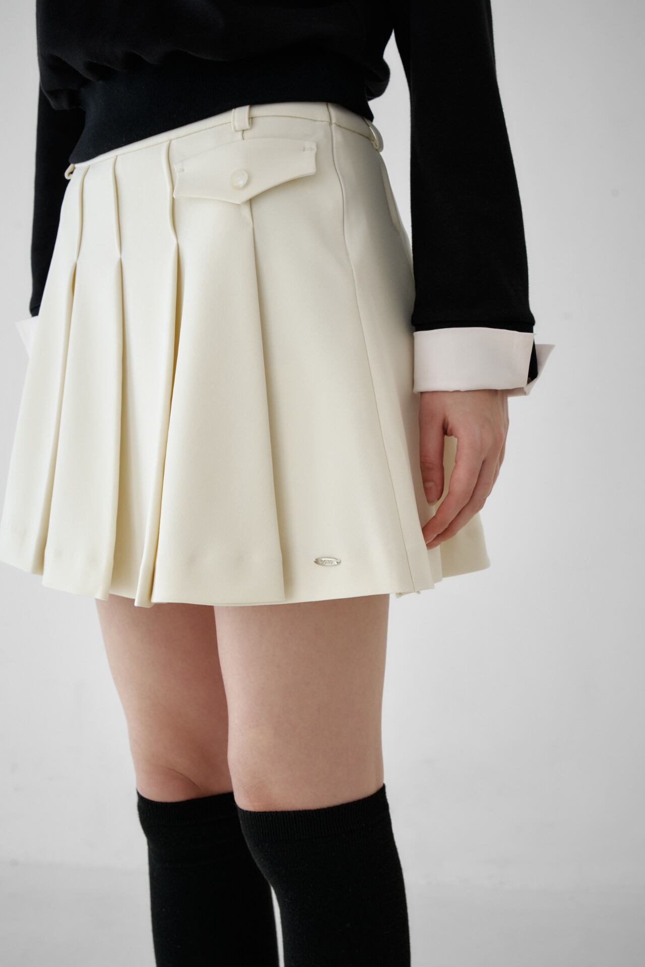 メタルロゴフラッププリーツスカート。