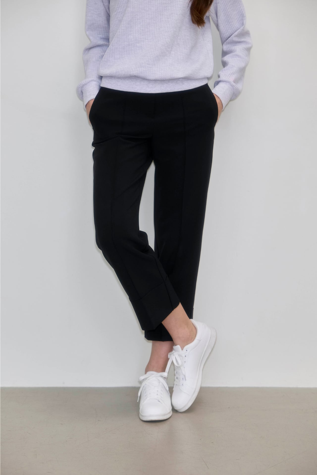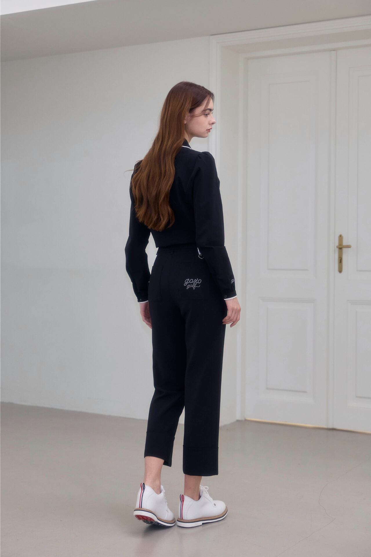 セミワイドフィットの裾のカブラディテールでポイントを与え、腰のストレッチサイドバンドで活動性を高めました。