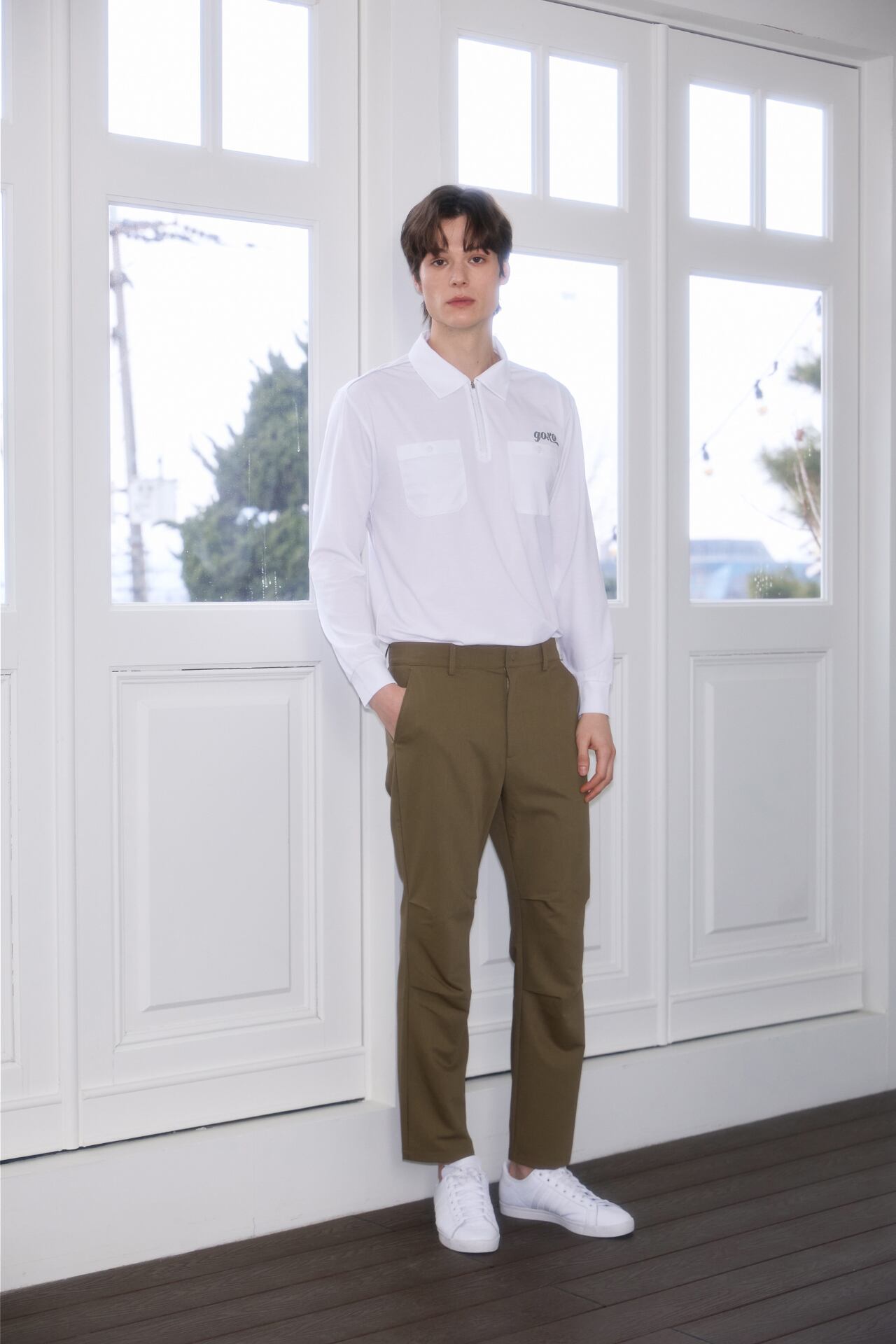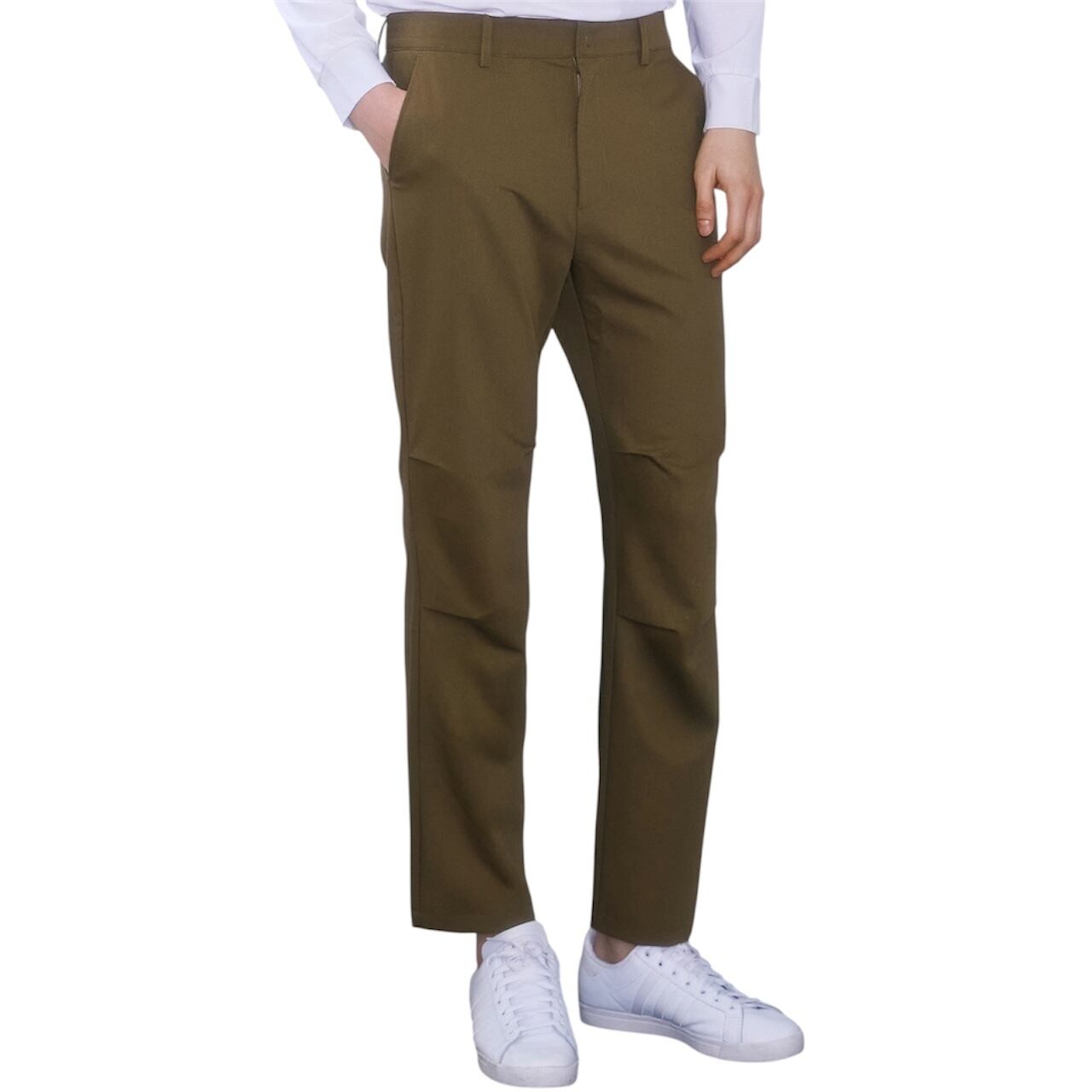 膝に顎を握って活動性を強調したテーパードフィットゴルフパンツです。