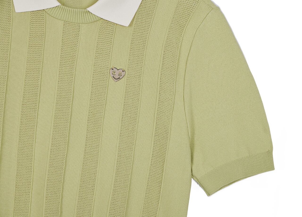 本商品のニットに取り付けられた金属ロゴ装飾は手作業取り付け(Hand Attach)方式で両側が固定されていて、構造上少し上に持ち上げることができます。