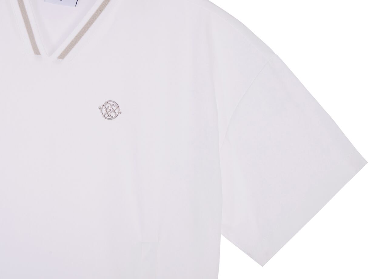 フロントに加えられたメタルロゴ装飾がほのかにポイントになって洗練されたムードを完成させるVネックTシャツです。