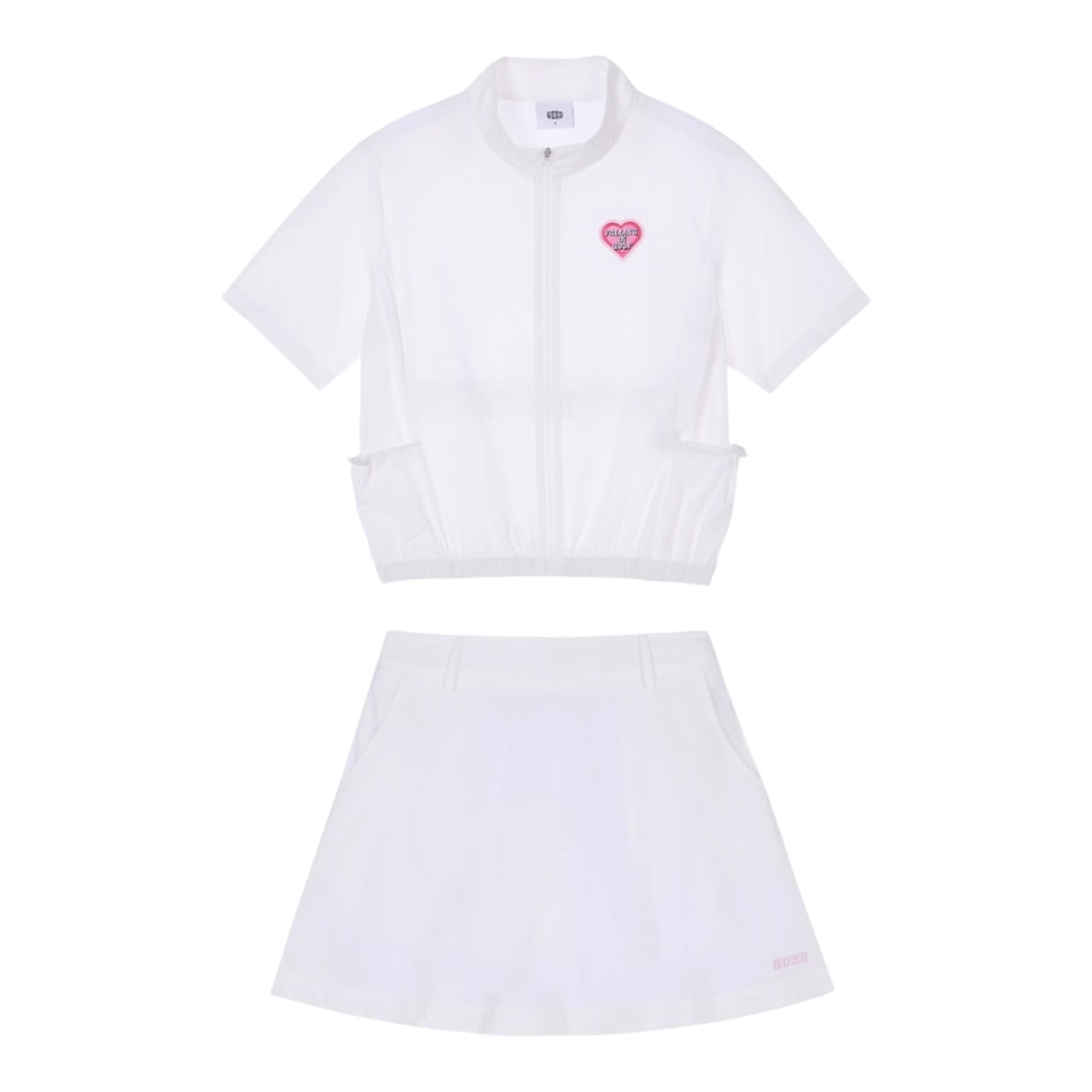 フォーリングインゴルフ刺繍とワッペンでポイントを与えたプルジップアップ上着とフレアラインのスカートで構成された女性専用セットアップです。