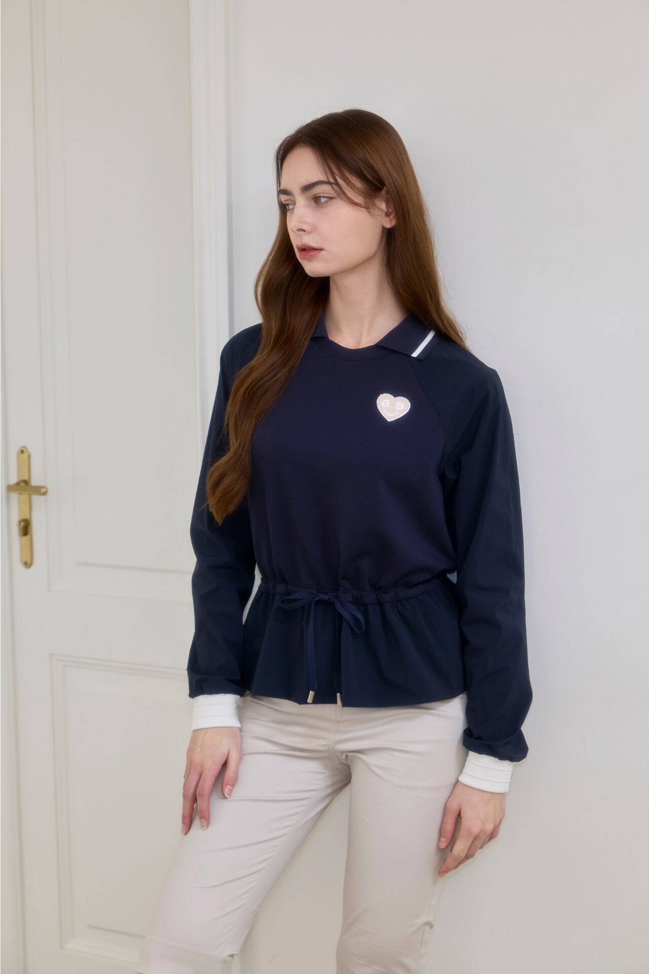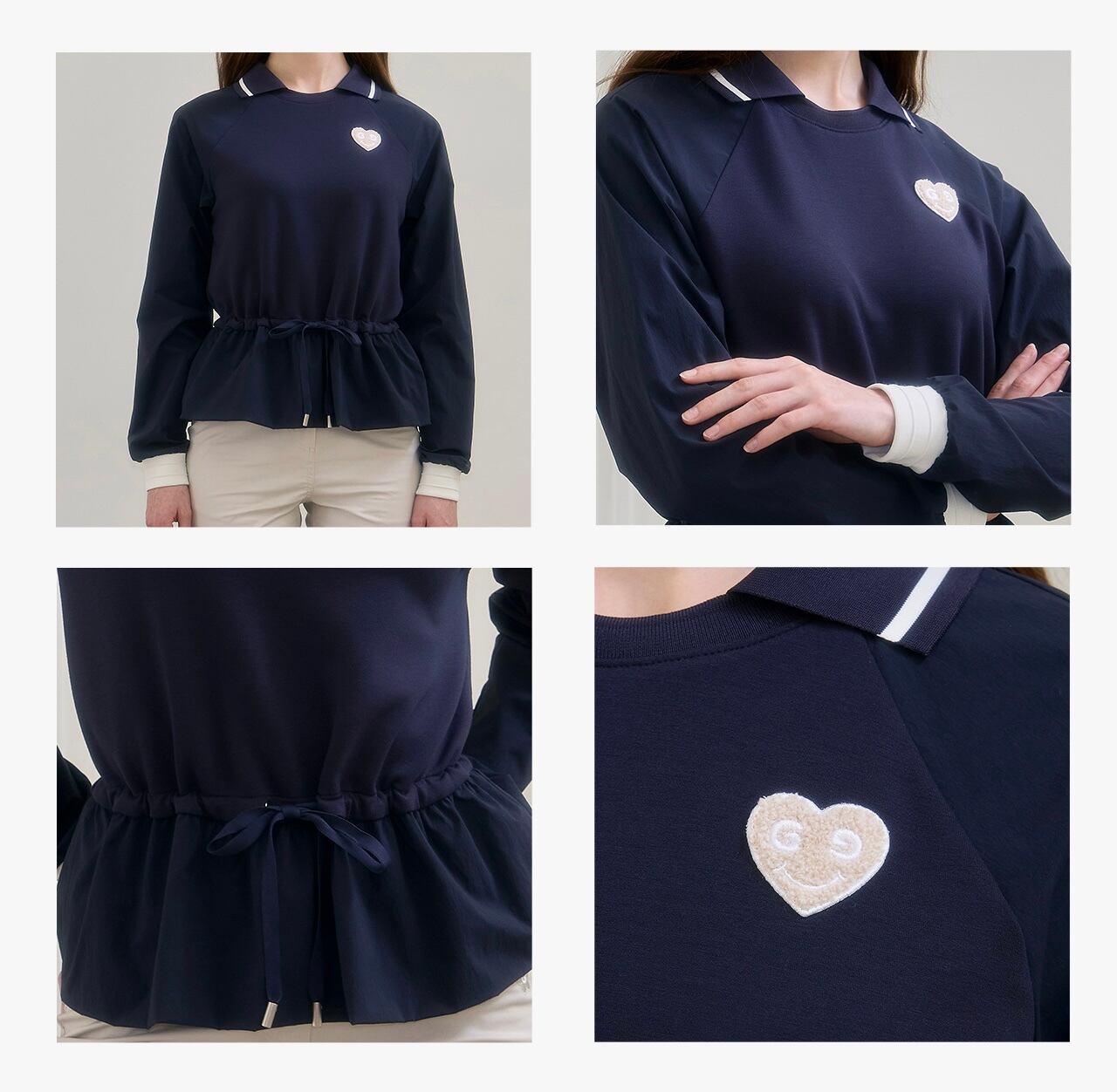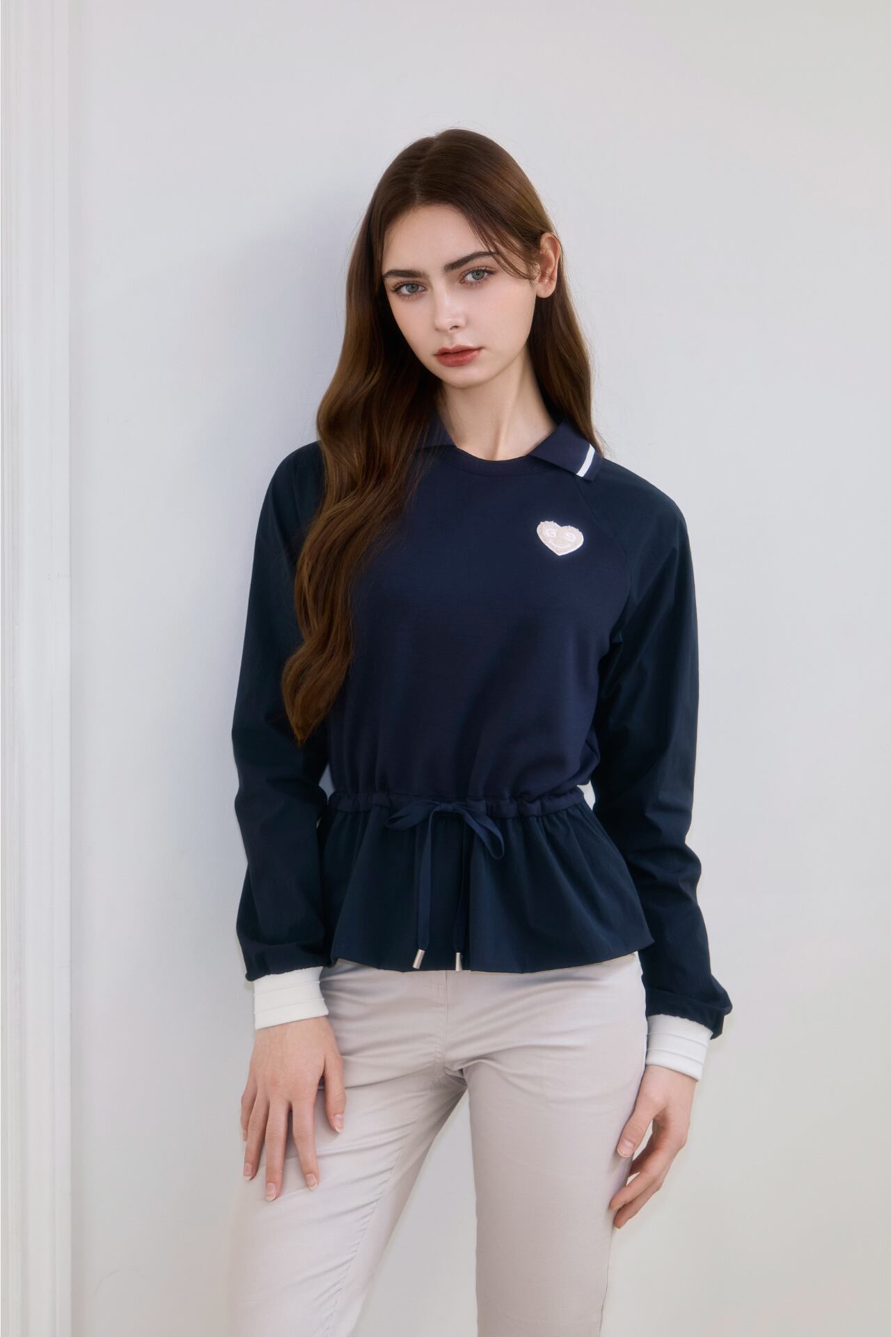 ウエストラインの内部に加えられたドローストリングを締めてよりスリムなラインを強調することができ、紐で様々なスタイリングが可能で女性らしいフレアデザインと襟配色ポイントで感覚的なスタイルで演出が可能です。