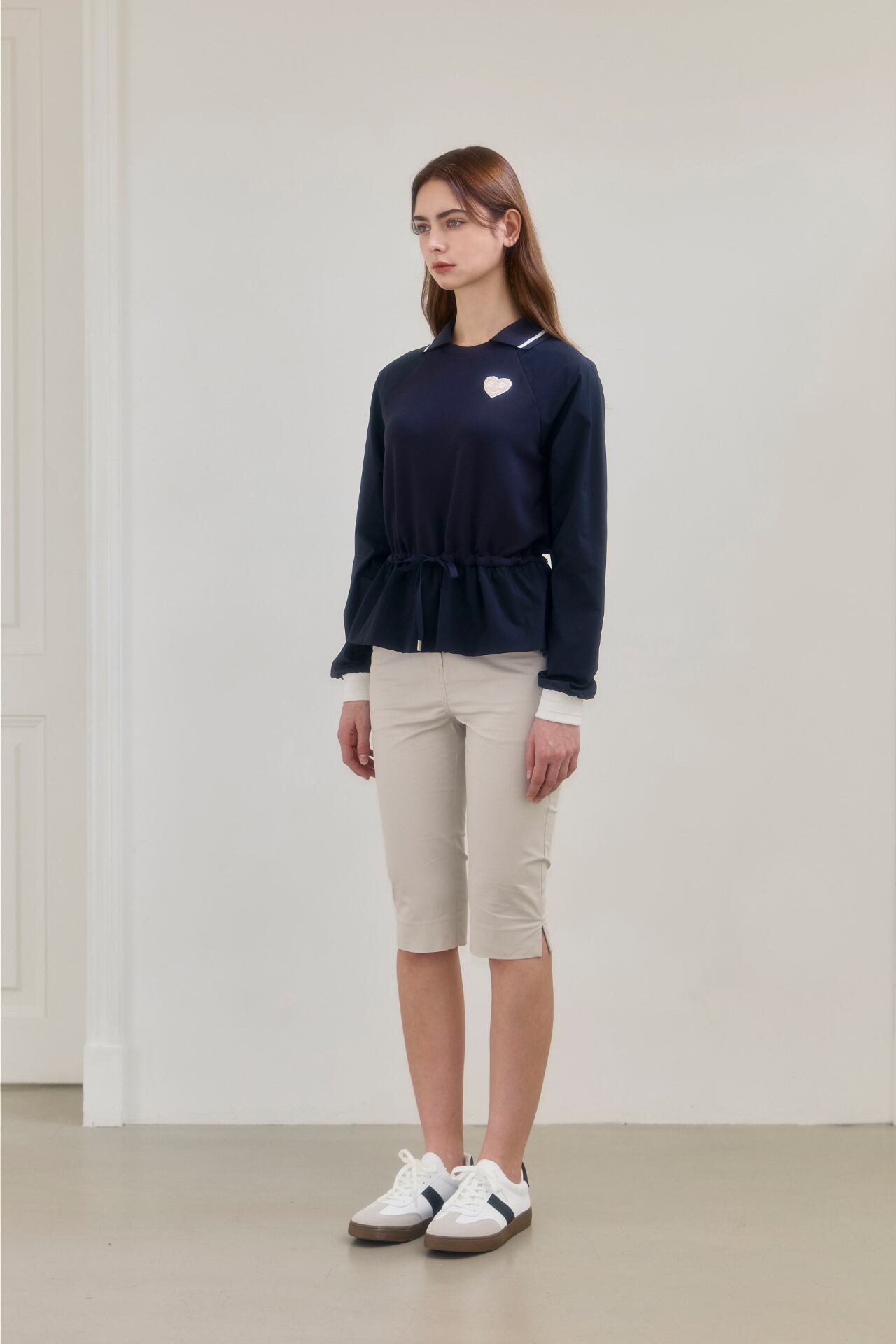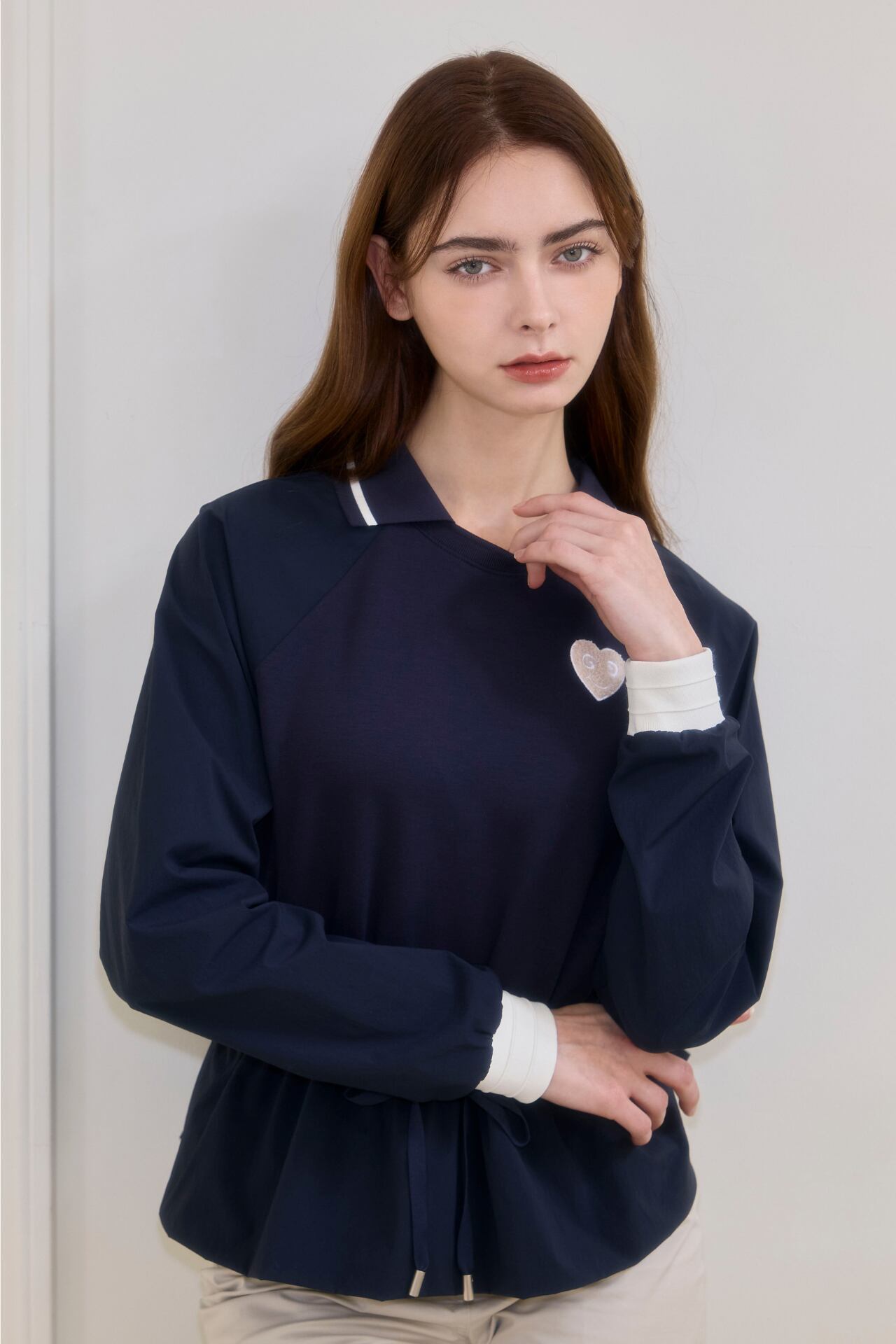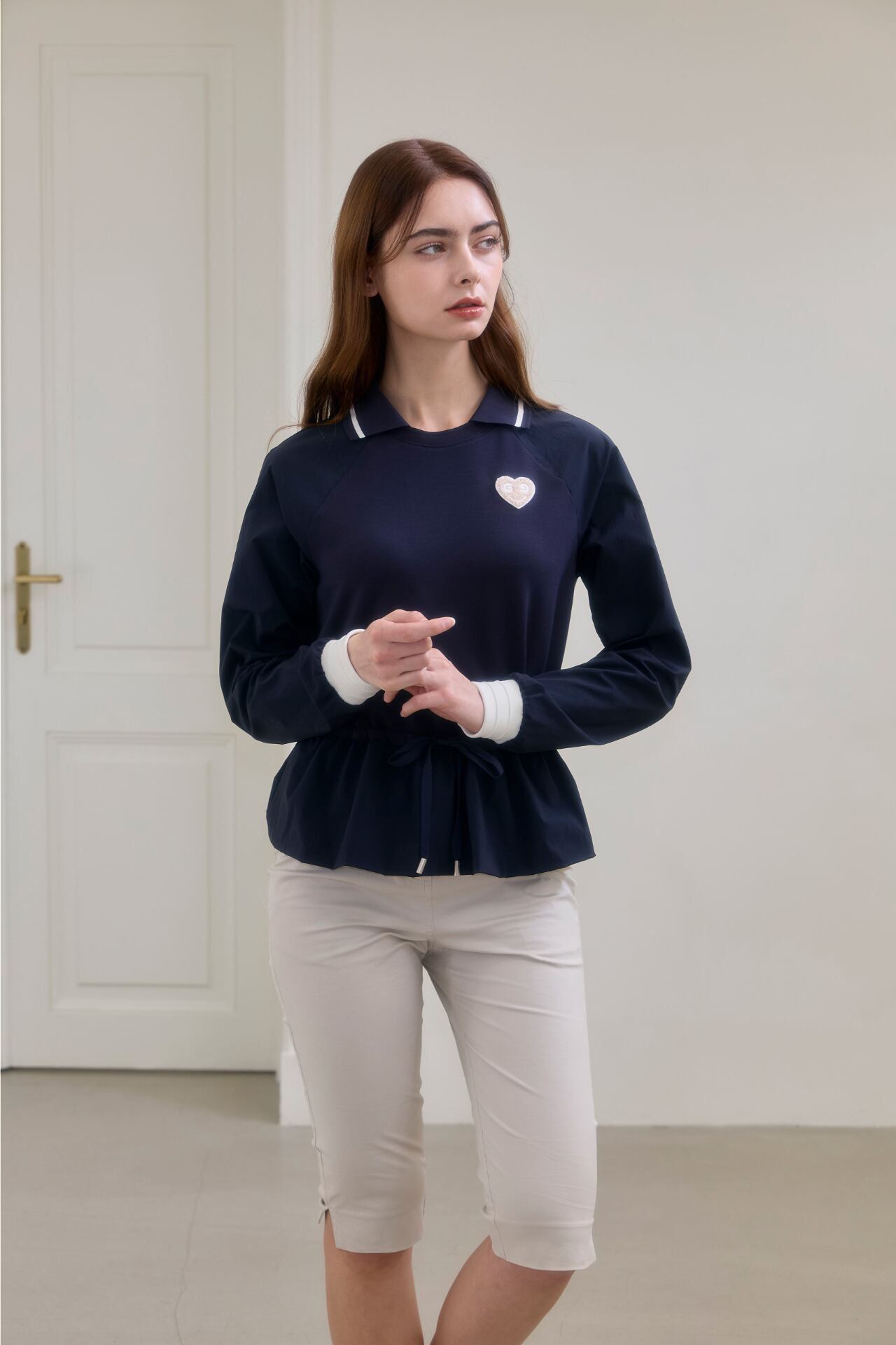 ウエストラインの内部に加えられたドローストリングを締めてよりスリムなラインを強調することができ、紐で様々なスタイリングが可能で女性らしいフレアデザインと襟配色ポイントで感覚的なスタイルで演出が可能です。