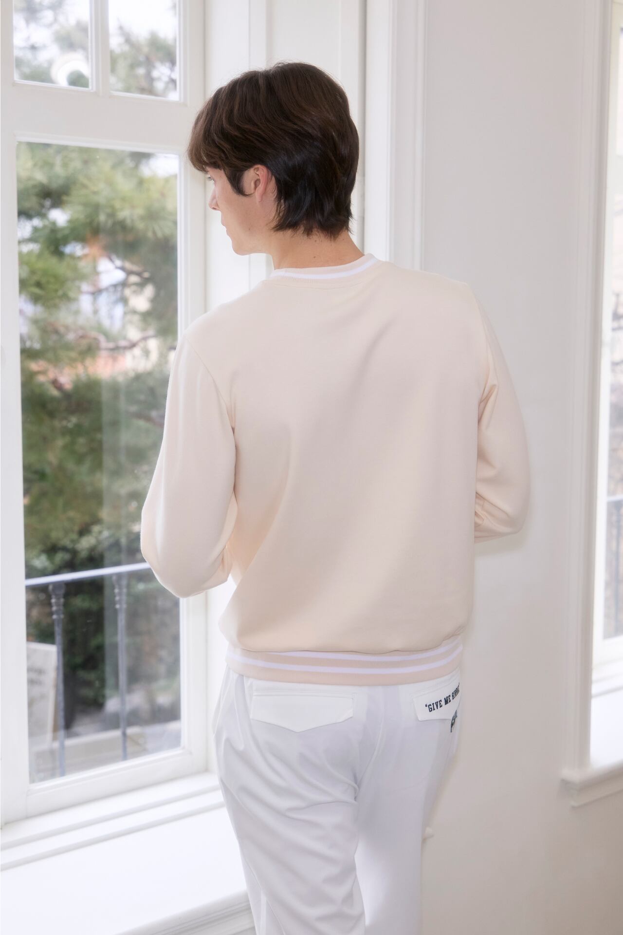 優れたテンションのジャージ素材を使って軽くて楽に着用できるマンツーマンです。