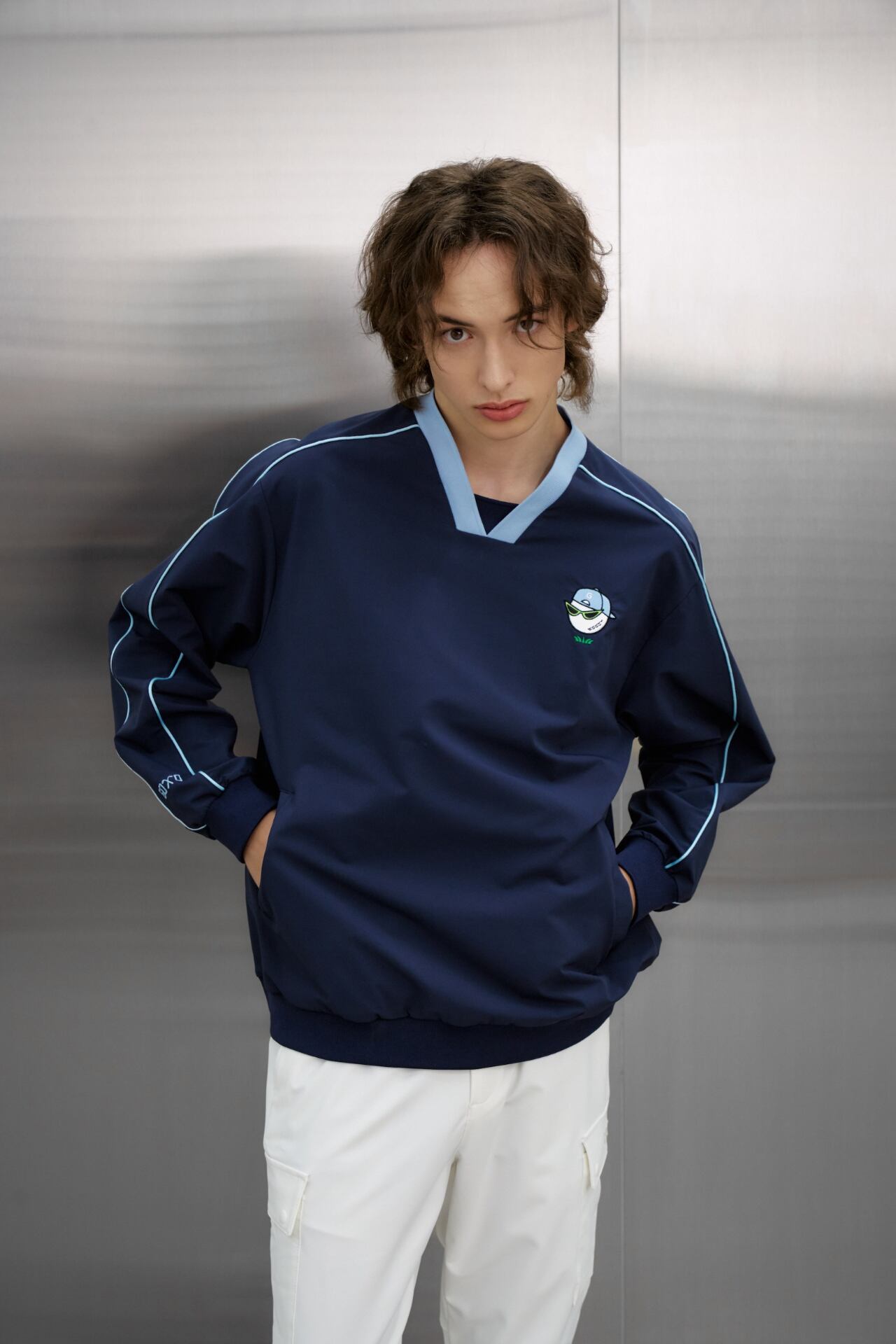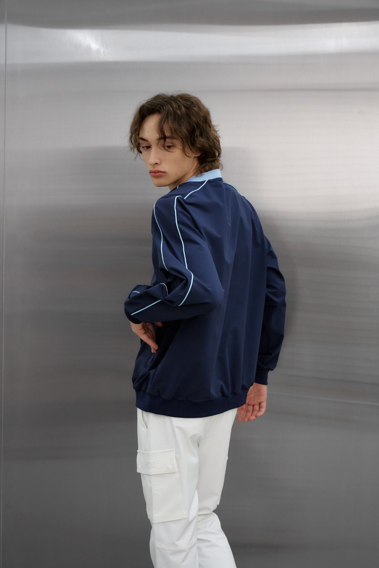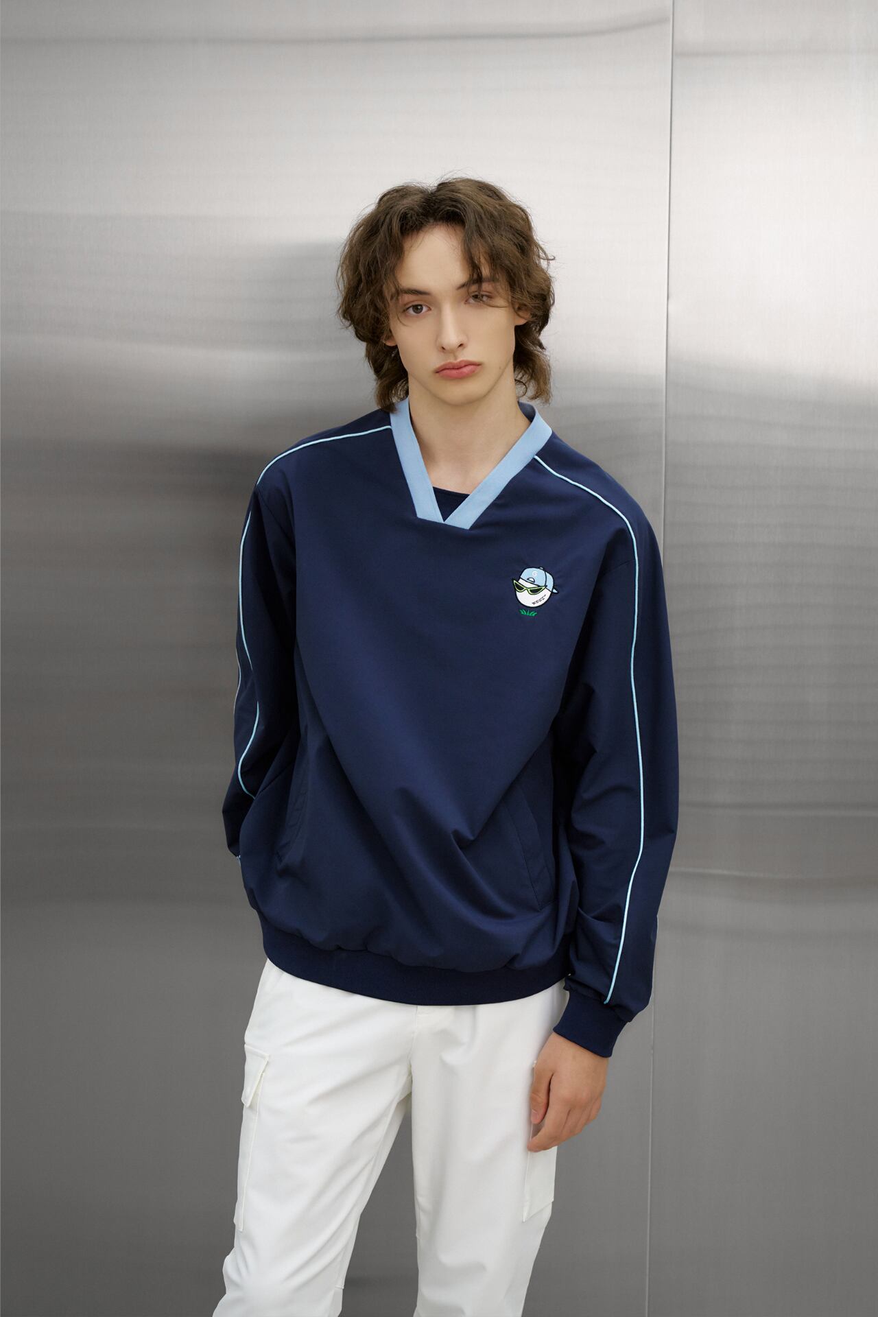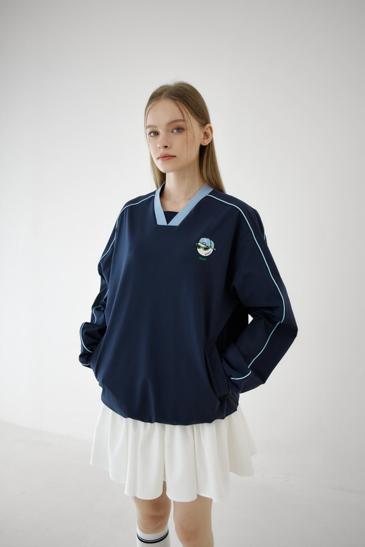 Vネックネックラインと袖にパイピングディテールでカラーポイントを与えてカジュアルなムードを表現し、前側にポケットで実用性を加えました。
