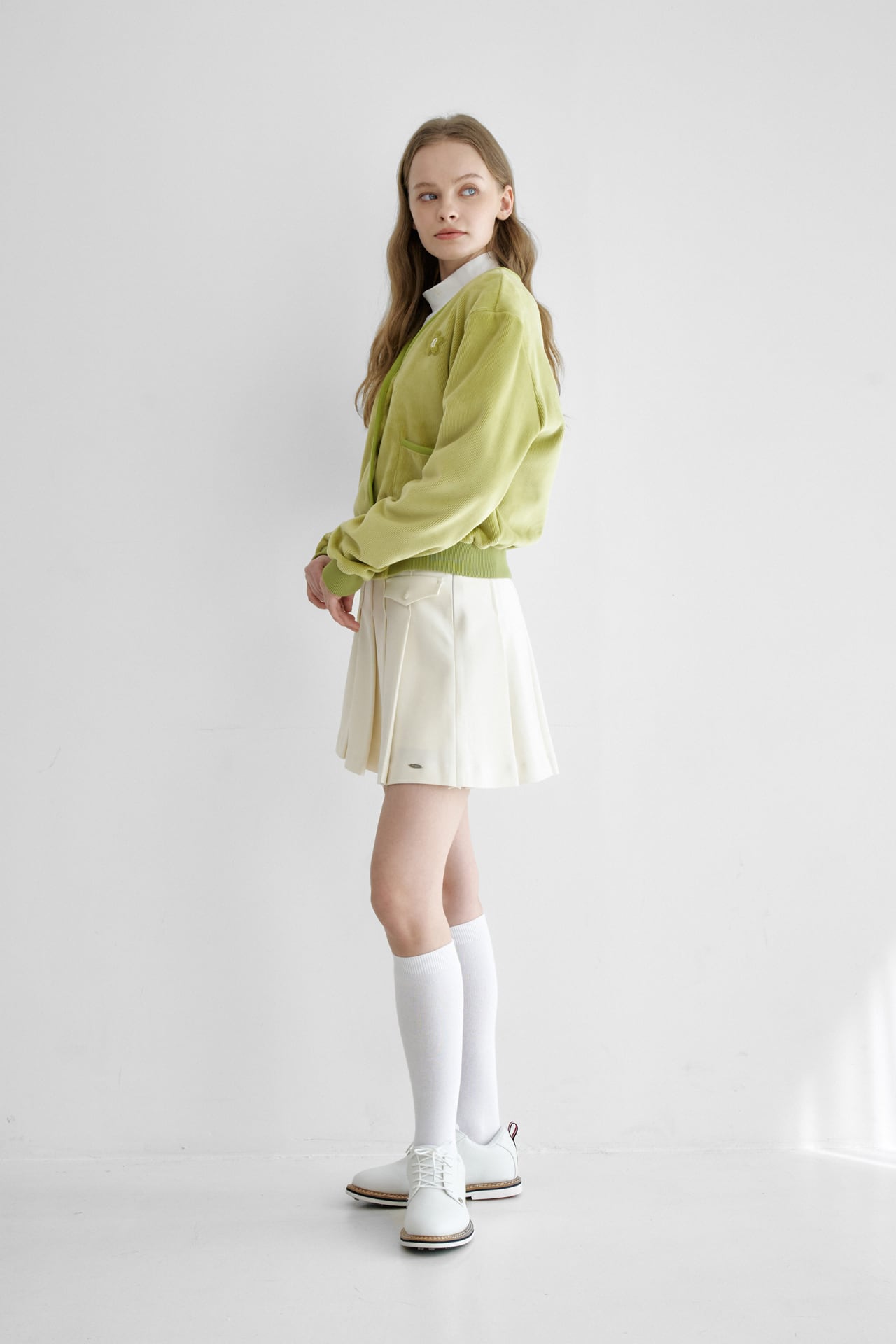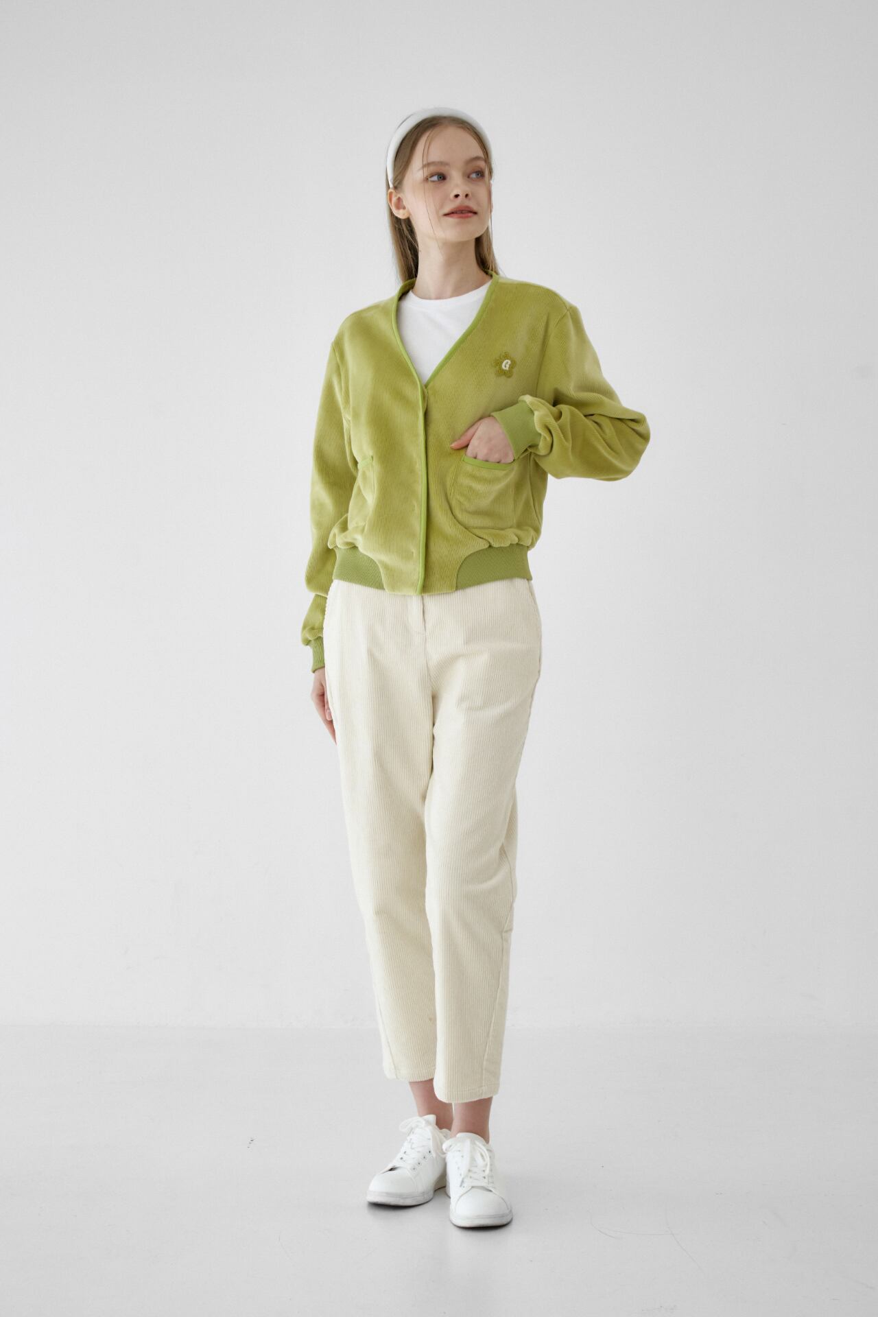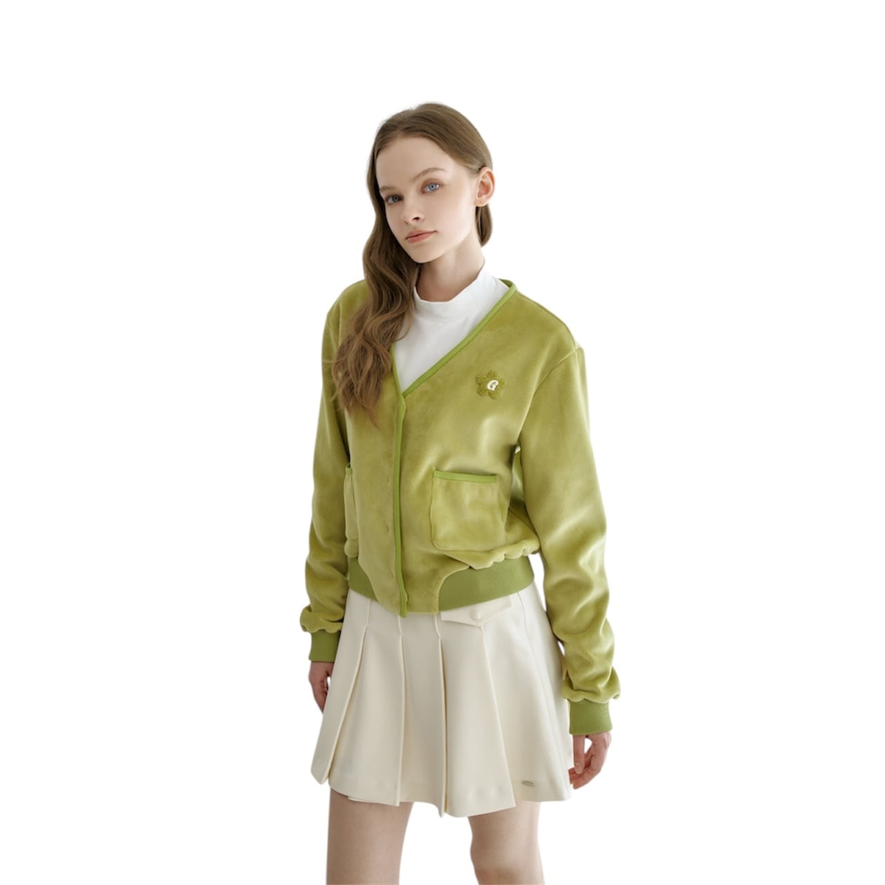 ベーシックなVネックネックデザインとボタンでオープンクロージングが可能で、アウトポケットデザインとバックルチェーンのディテールでカジュアルなムードを演出できます。