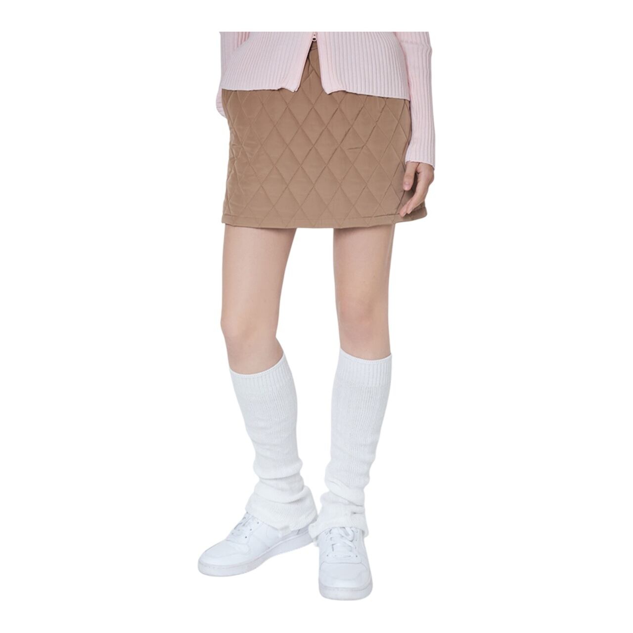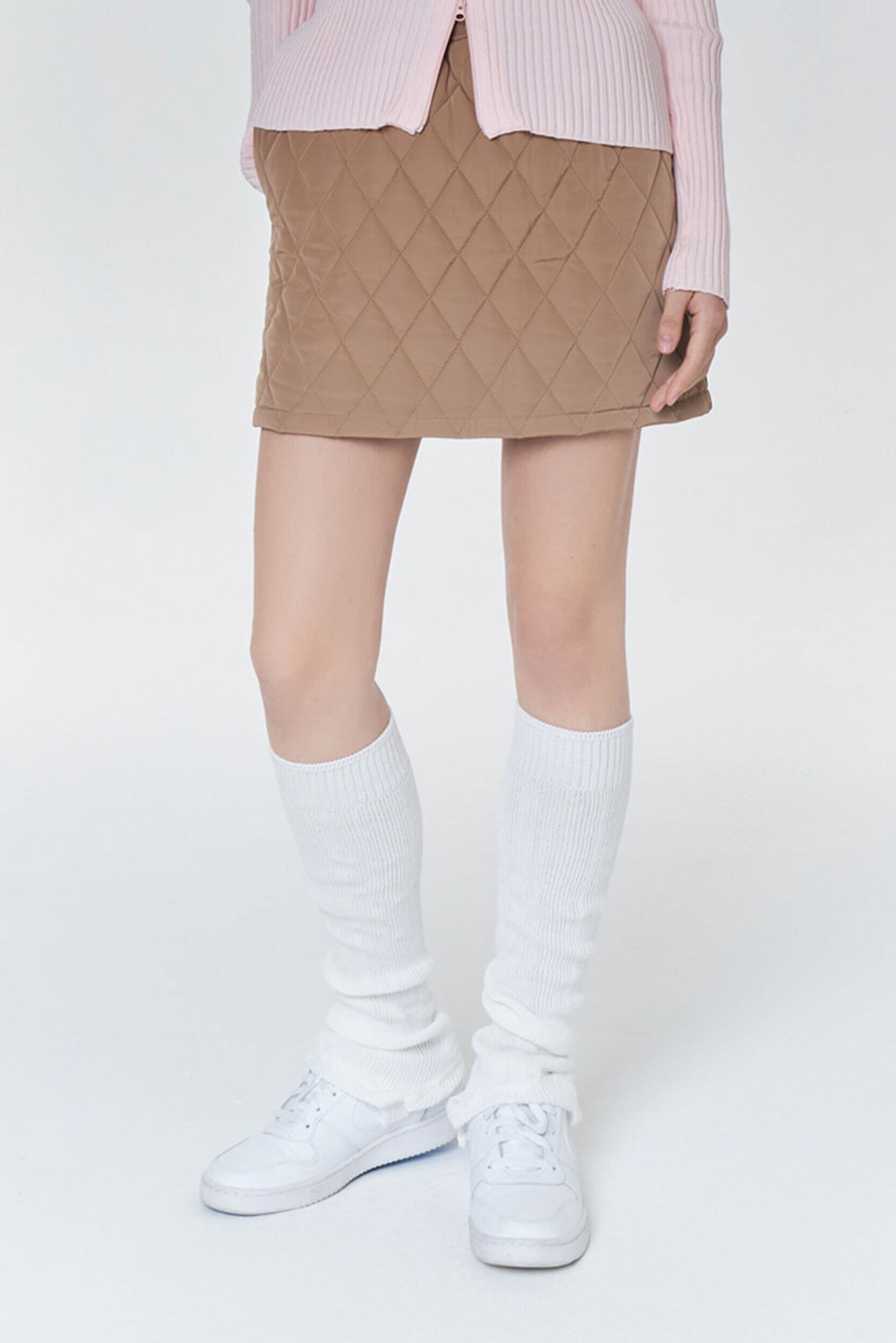 高級なダイヤモンドパターンのヌビムディテールと洗練されたカラーで流行なくコーディネート可能なキルティングミニスカートです。