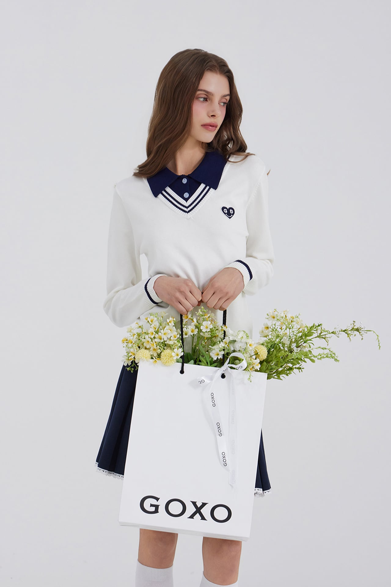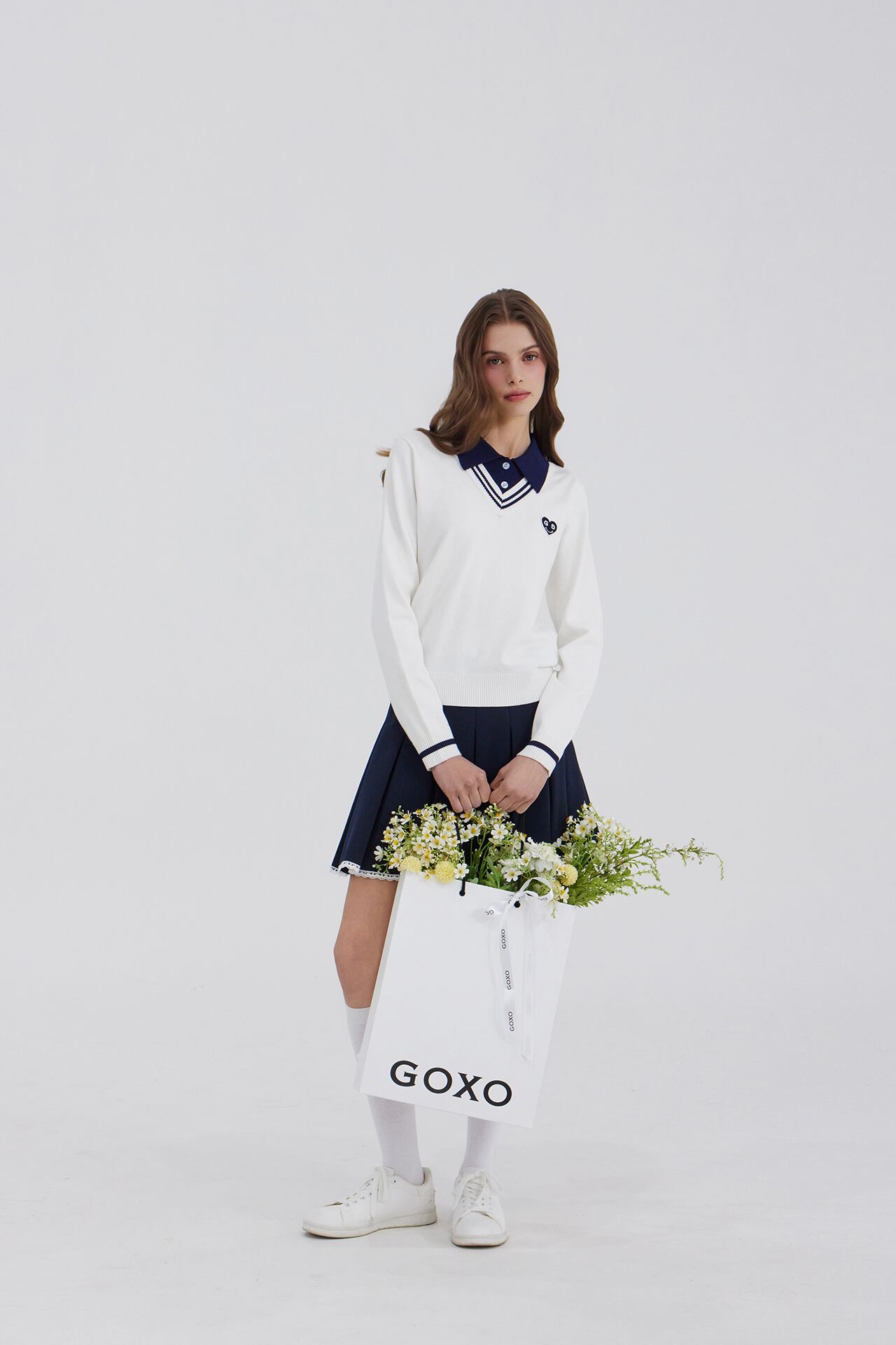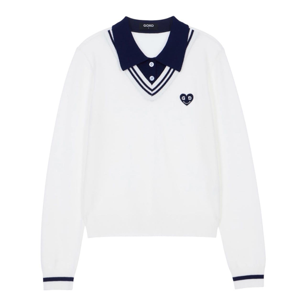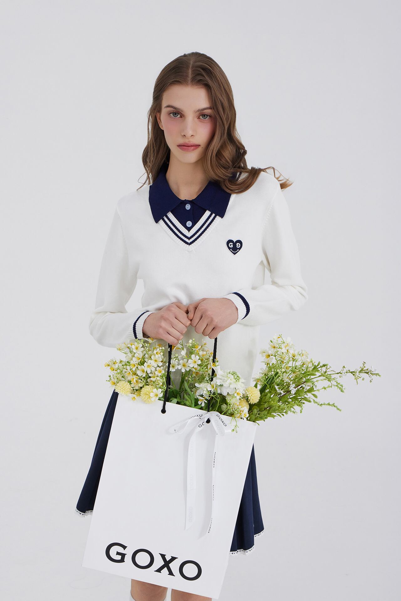 GOXO ゴーエックスオー スマイルハート Vネック 配色 ニット ホワイト