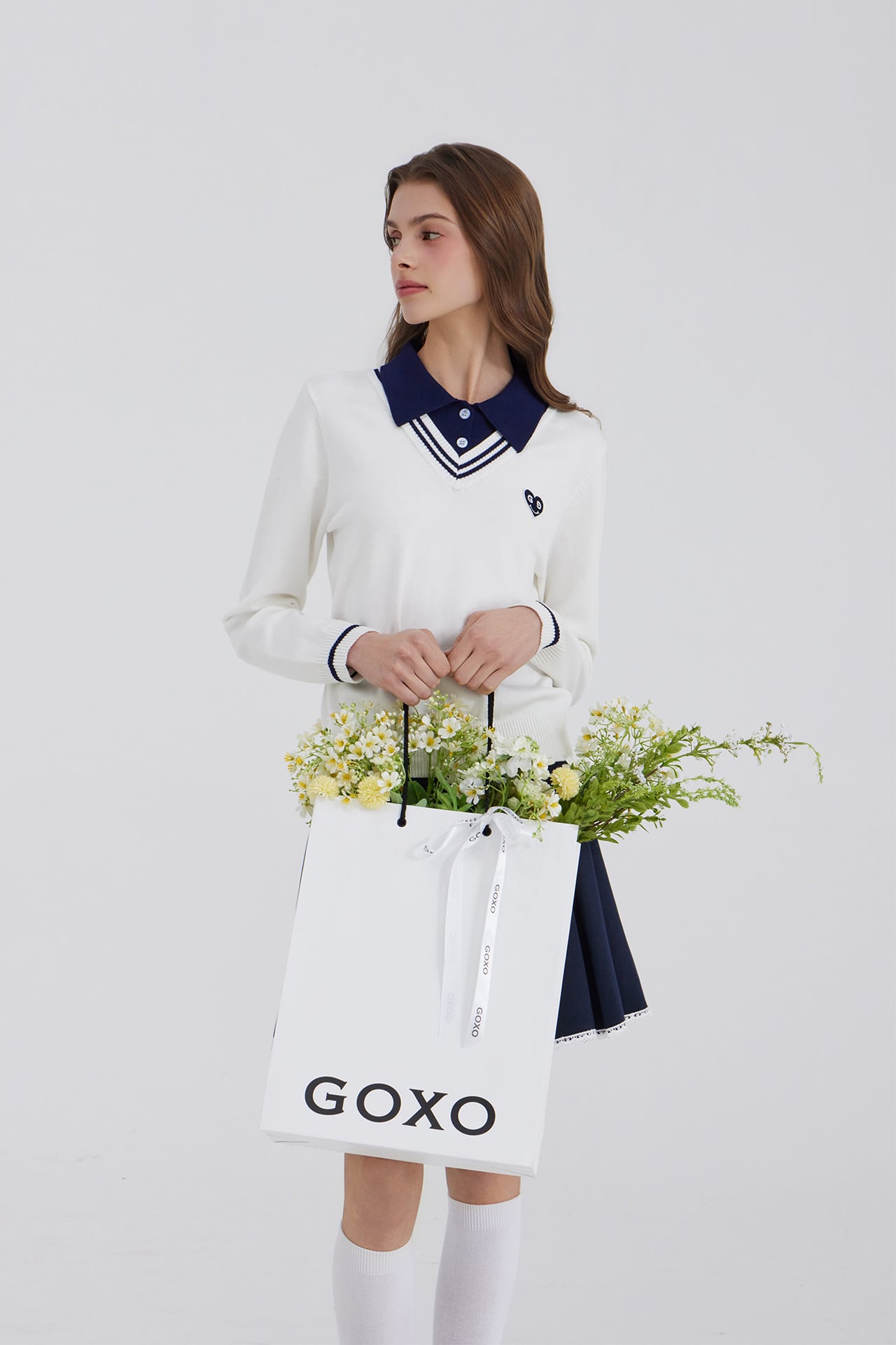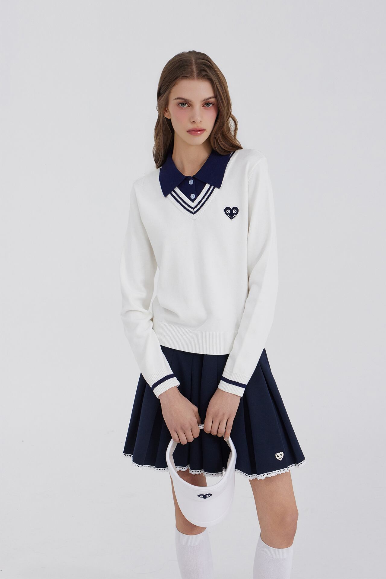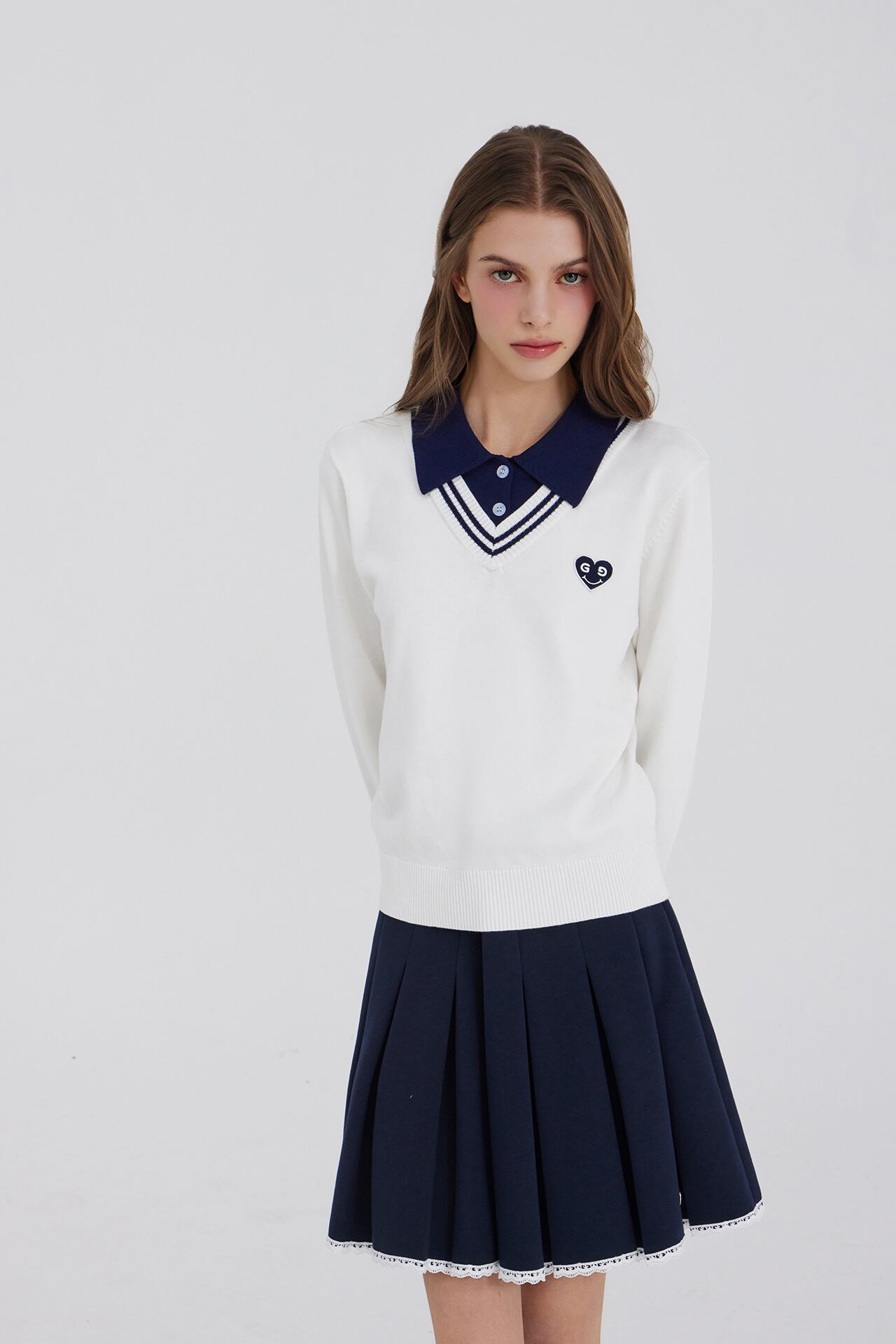 GOXO ゴーエックスオー スマイルハート Vネック 配色 ニット ホワイト