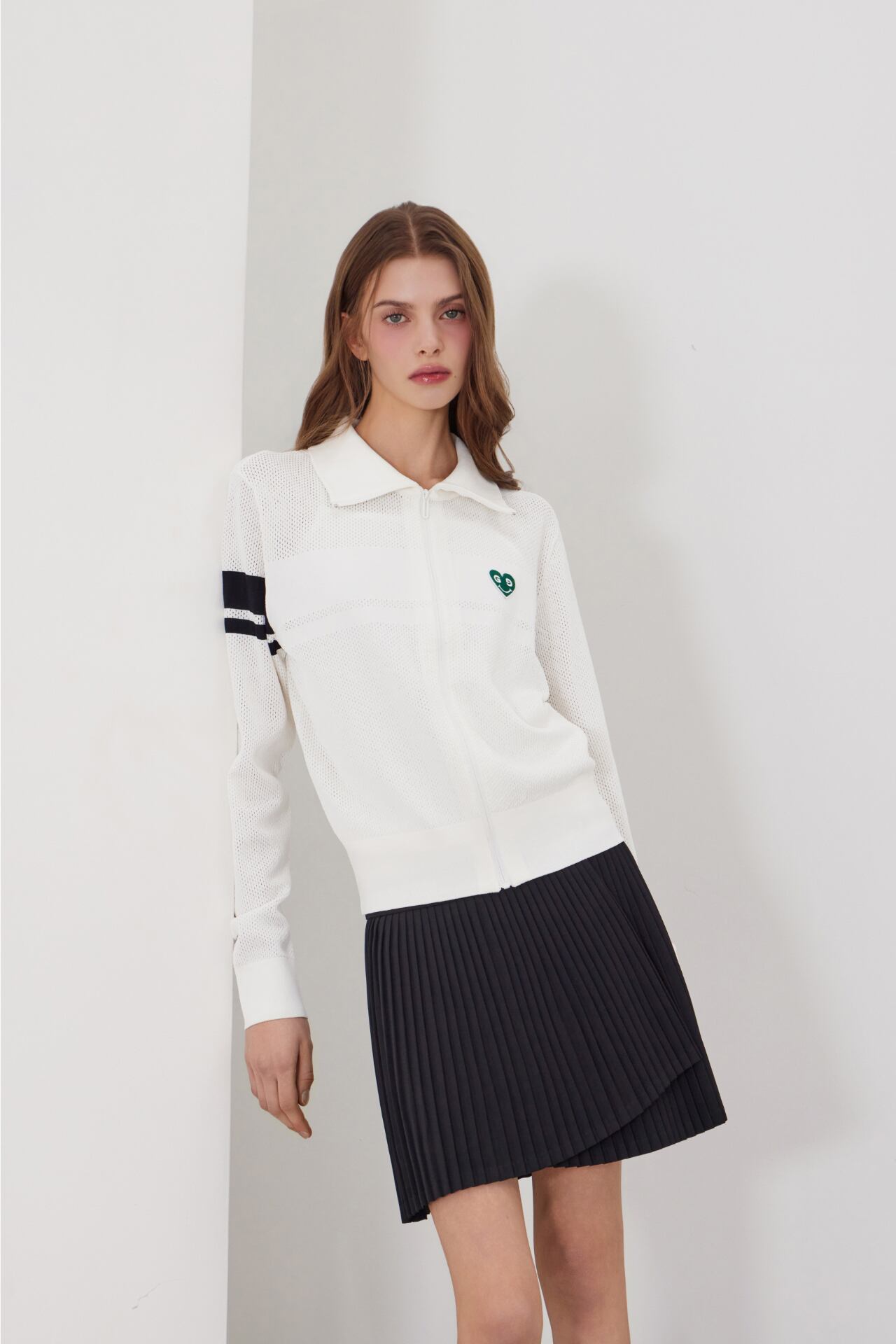組織感が生きているニットジップアップで、ボディ全体に部分的にメッシュ組織を適用したデザインです。