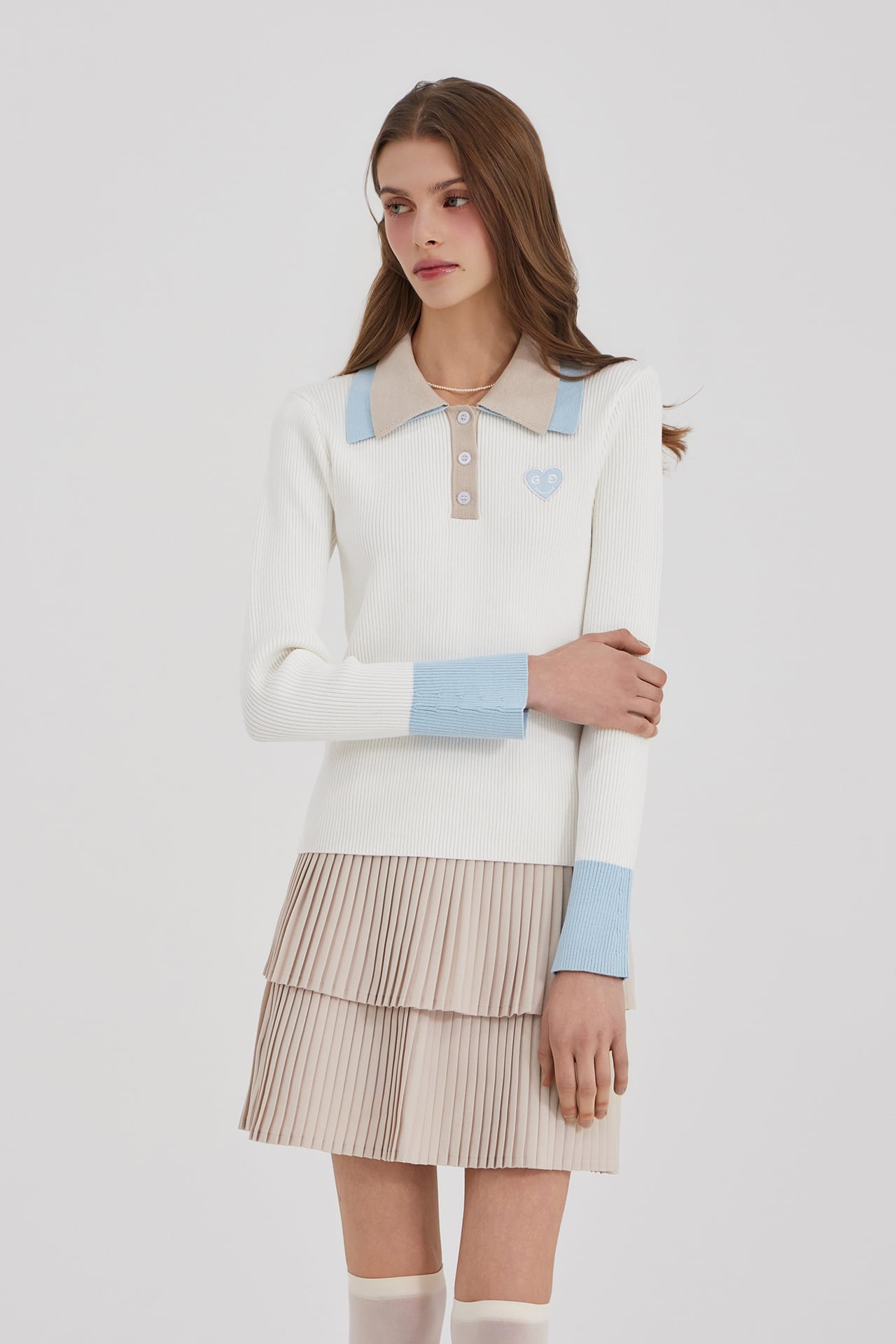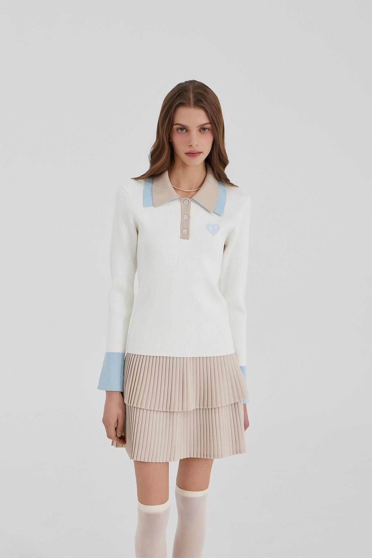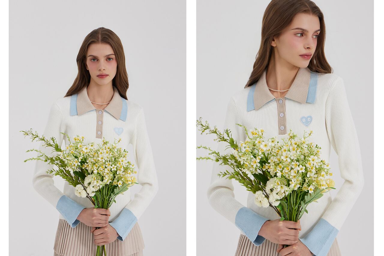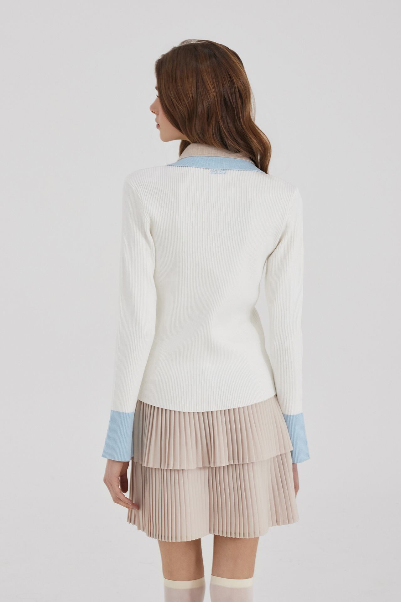 2段の襟の配色がクラシックなムードを自然に完成させ、縦のリブ構造で着用時にシルエットが安定して捉えられます。