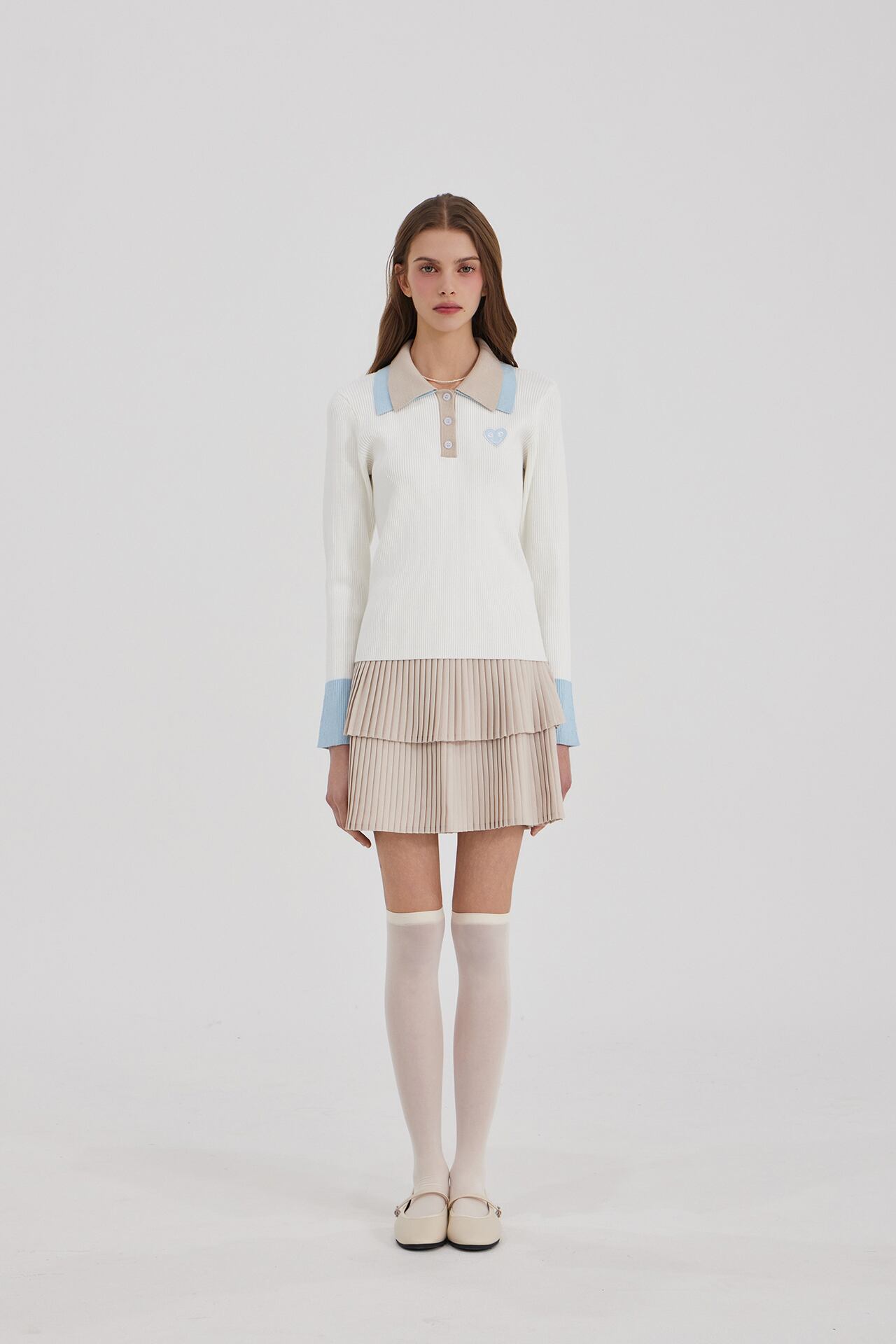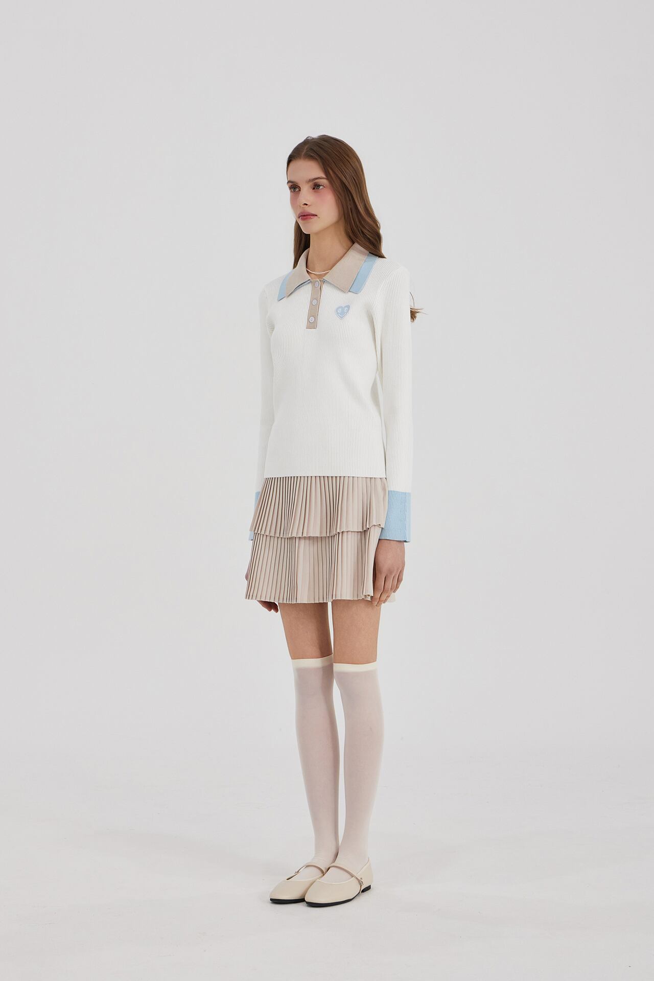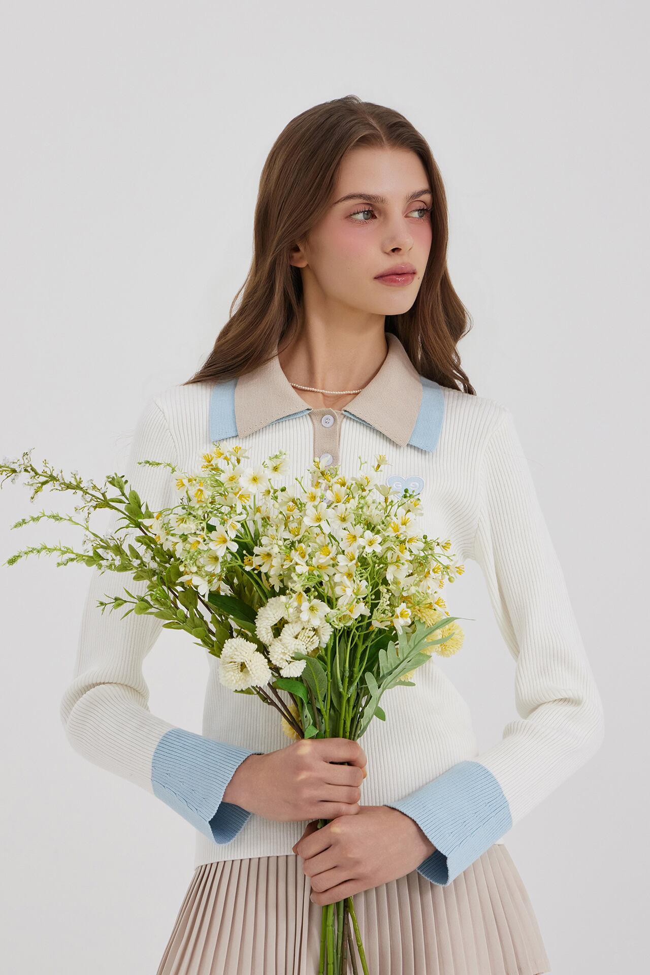 2段の襟の配色がクラシックなムードを自然に完成させ、縦のリブ構造で着用時にシルエットが安定して捉えられます。