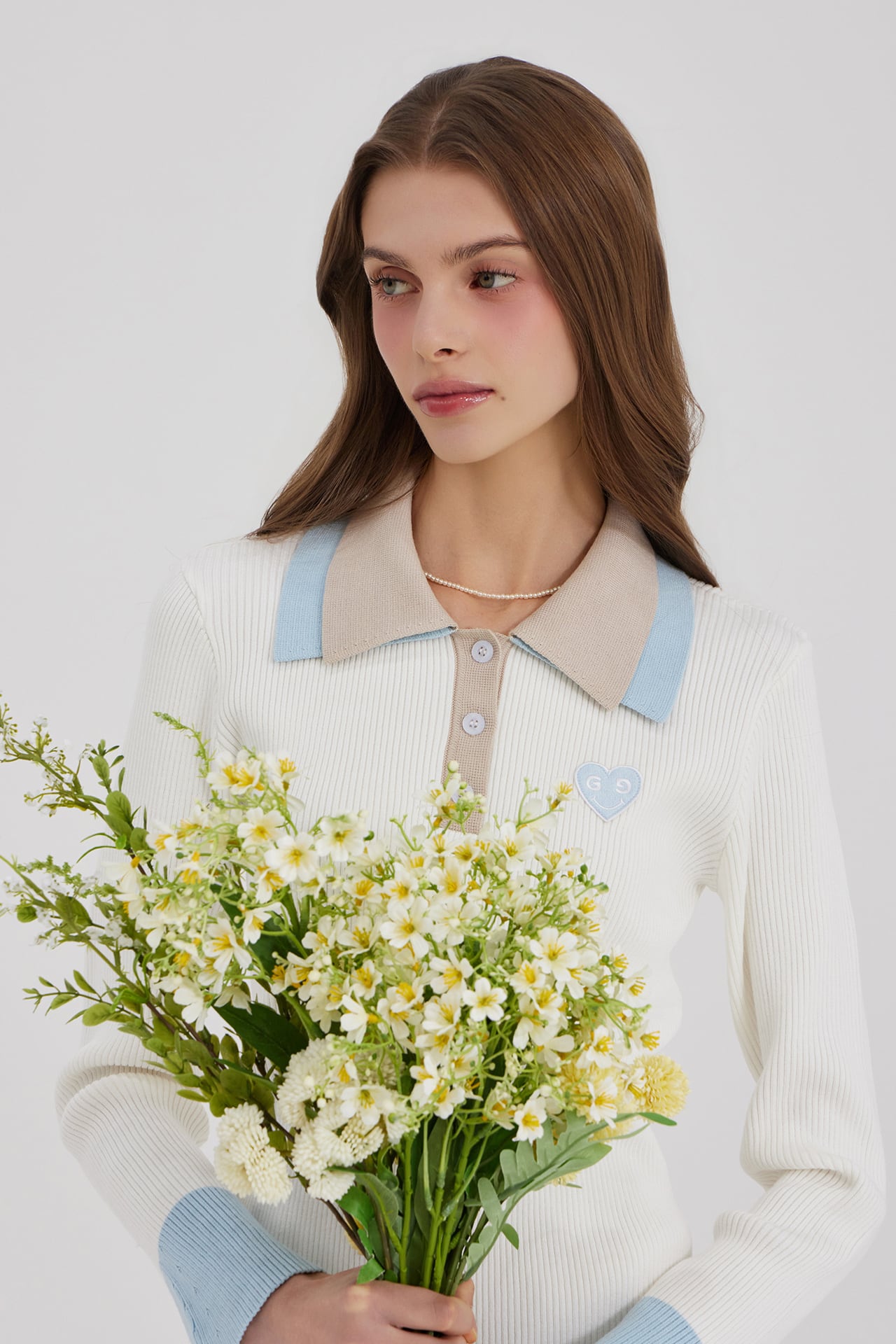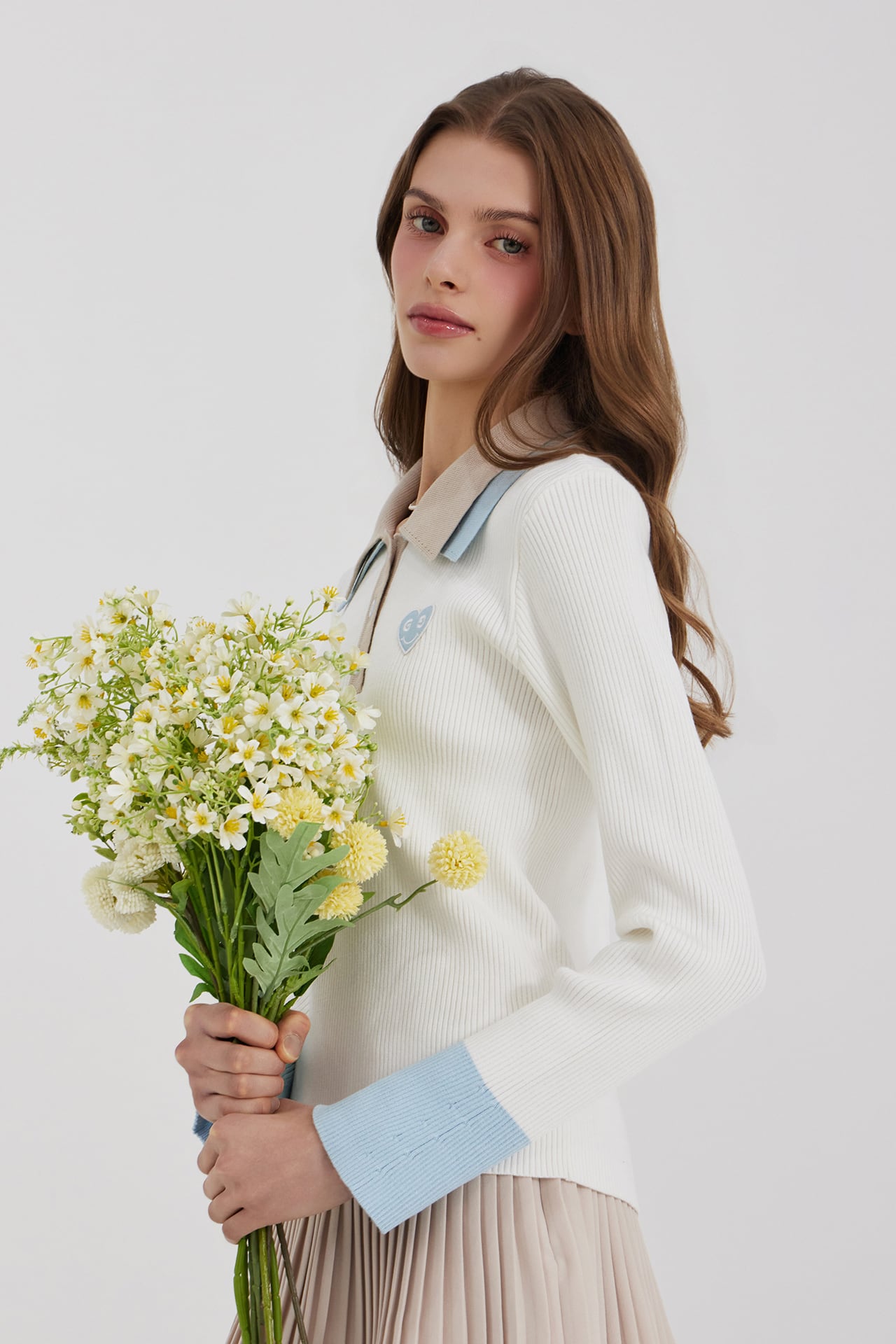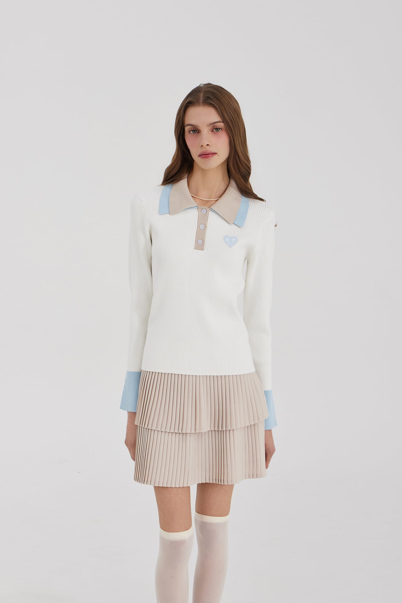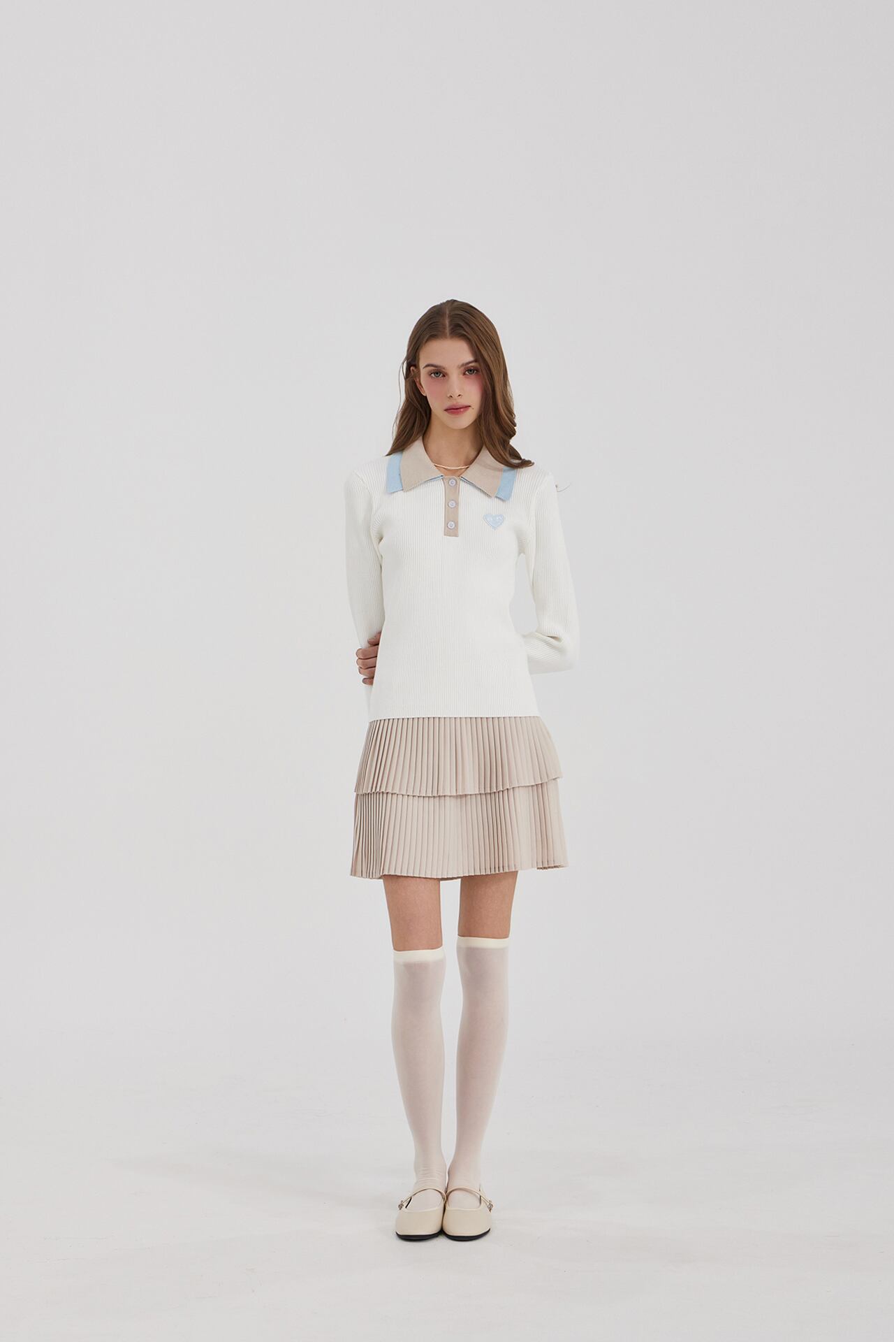 2段の襟の配色がクラシックなムードを自然に完成させ、縦のリブ構造で着用時にシルエットが安定して捉えられます。