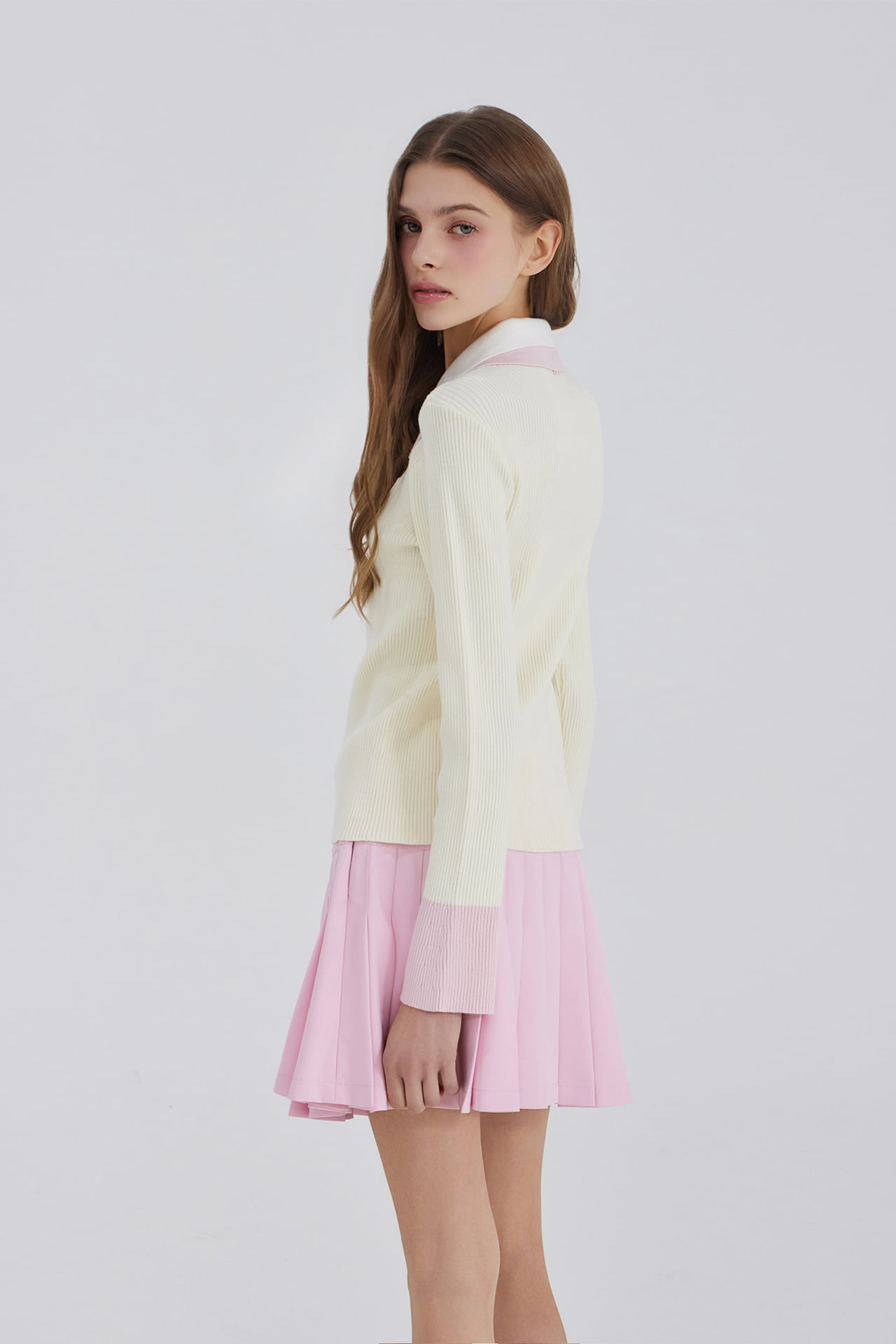 2段の襟の配色がクラシックなムードを自然に完成させ、縦のリブ構造で着用時にシルエットが安定して捉えられます。