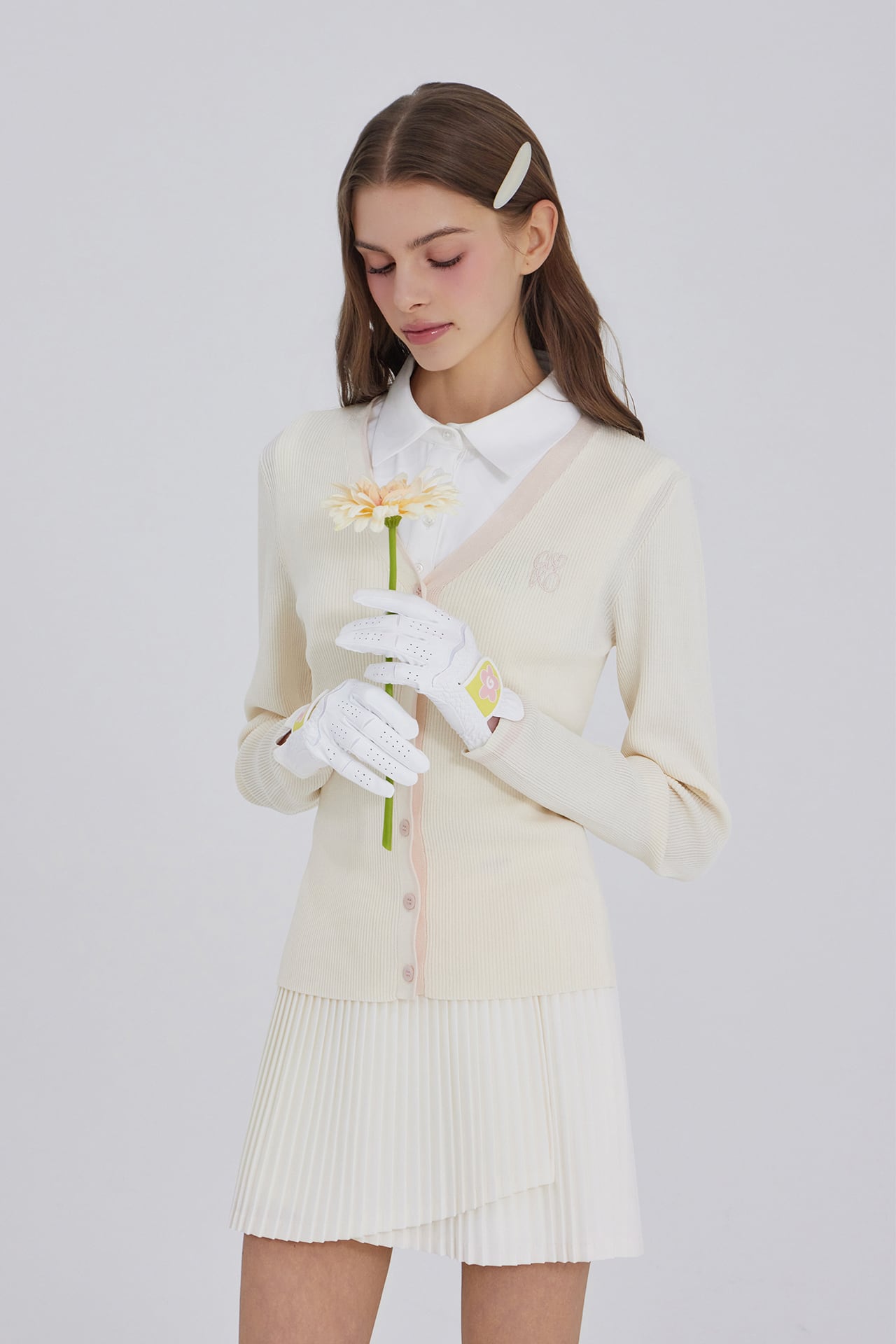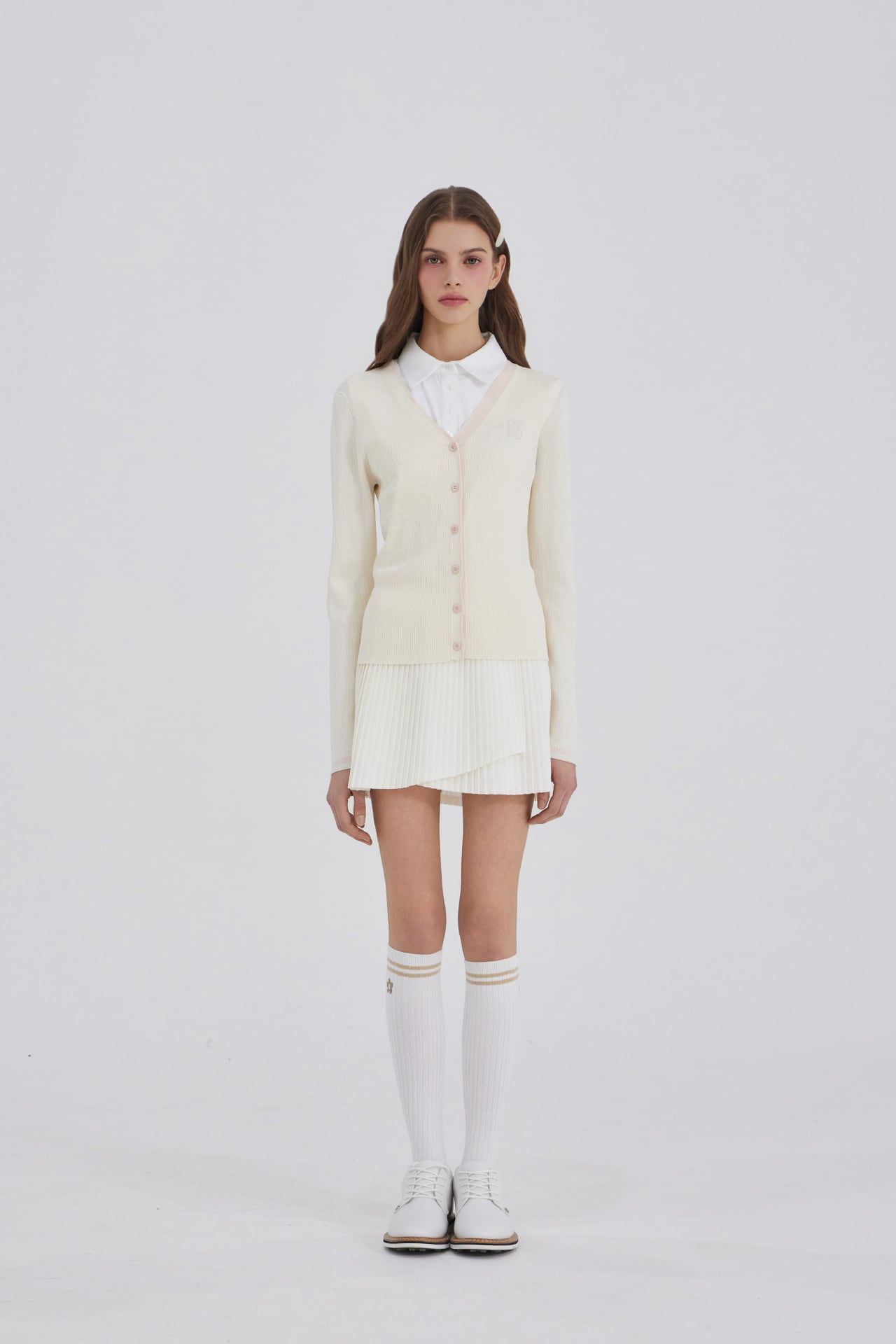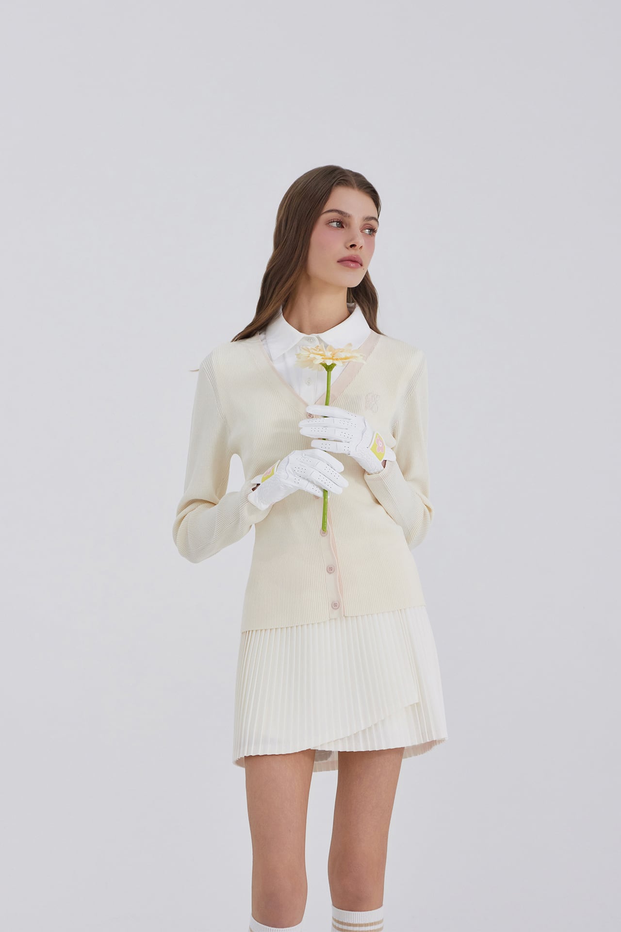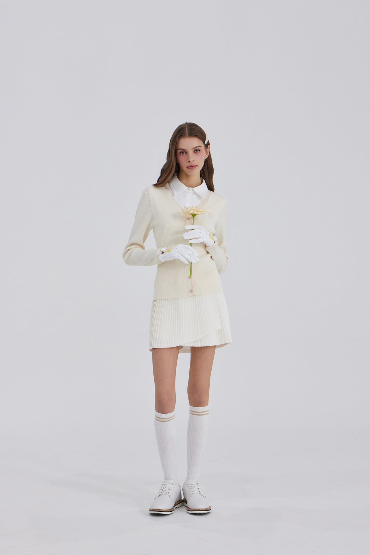 Vネックラインが際立つニットカーディガンで、ゴルフウェア特有の整ったムードをやさしく表現したアイテムです。