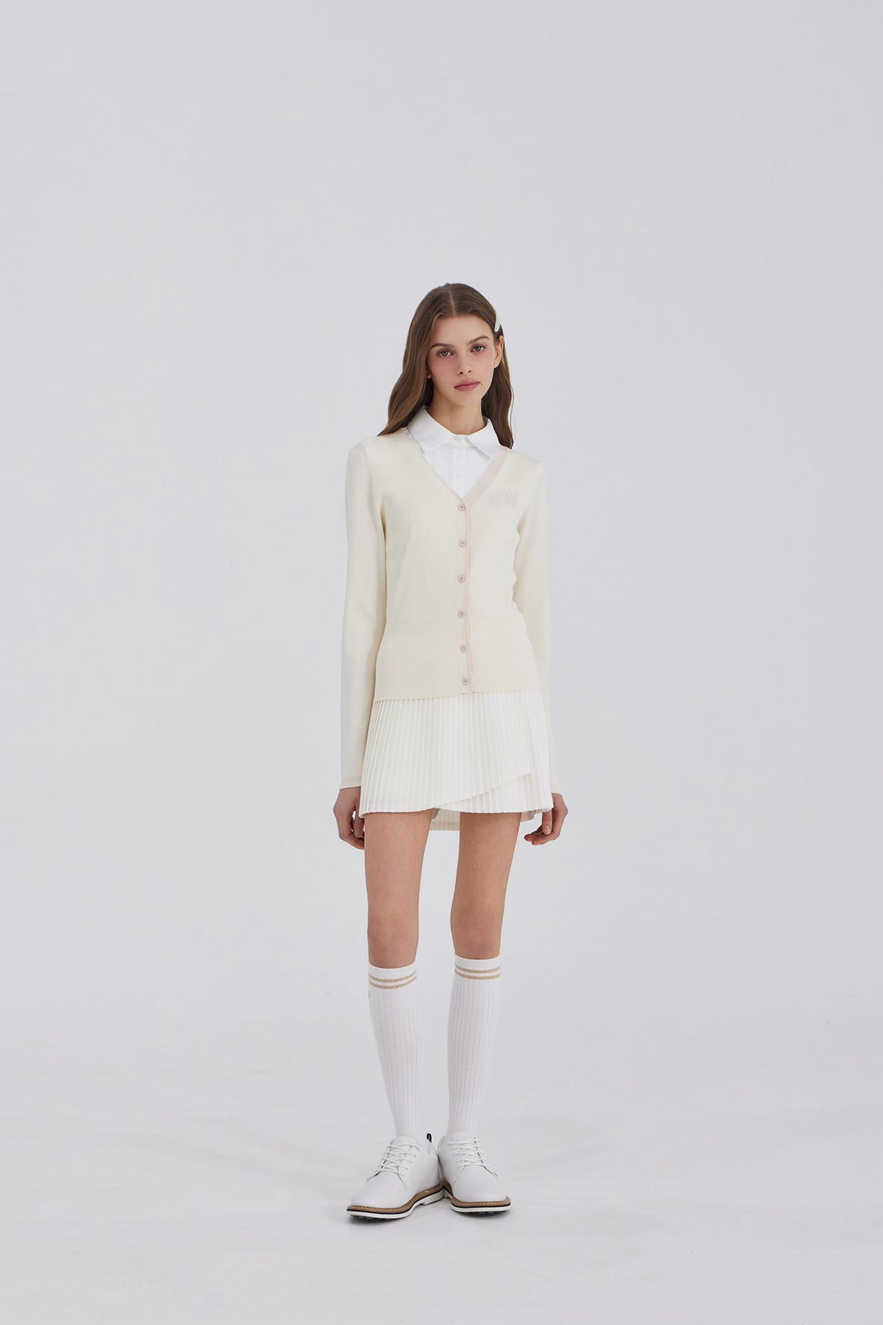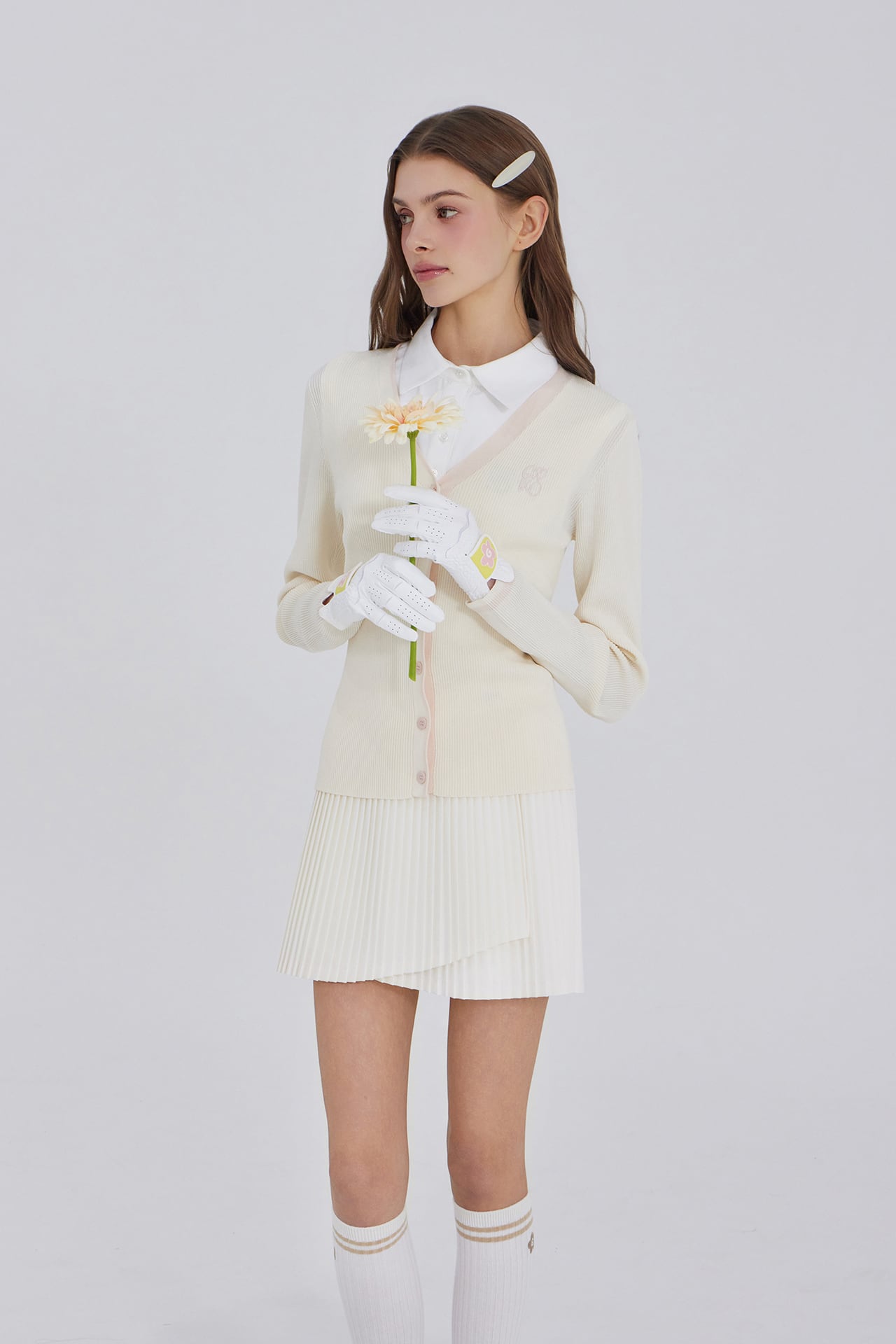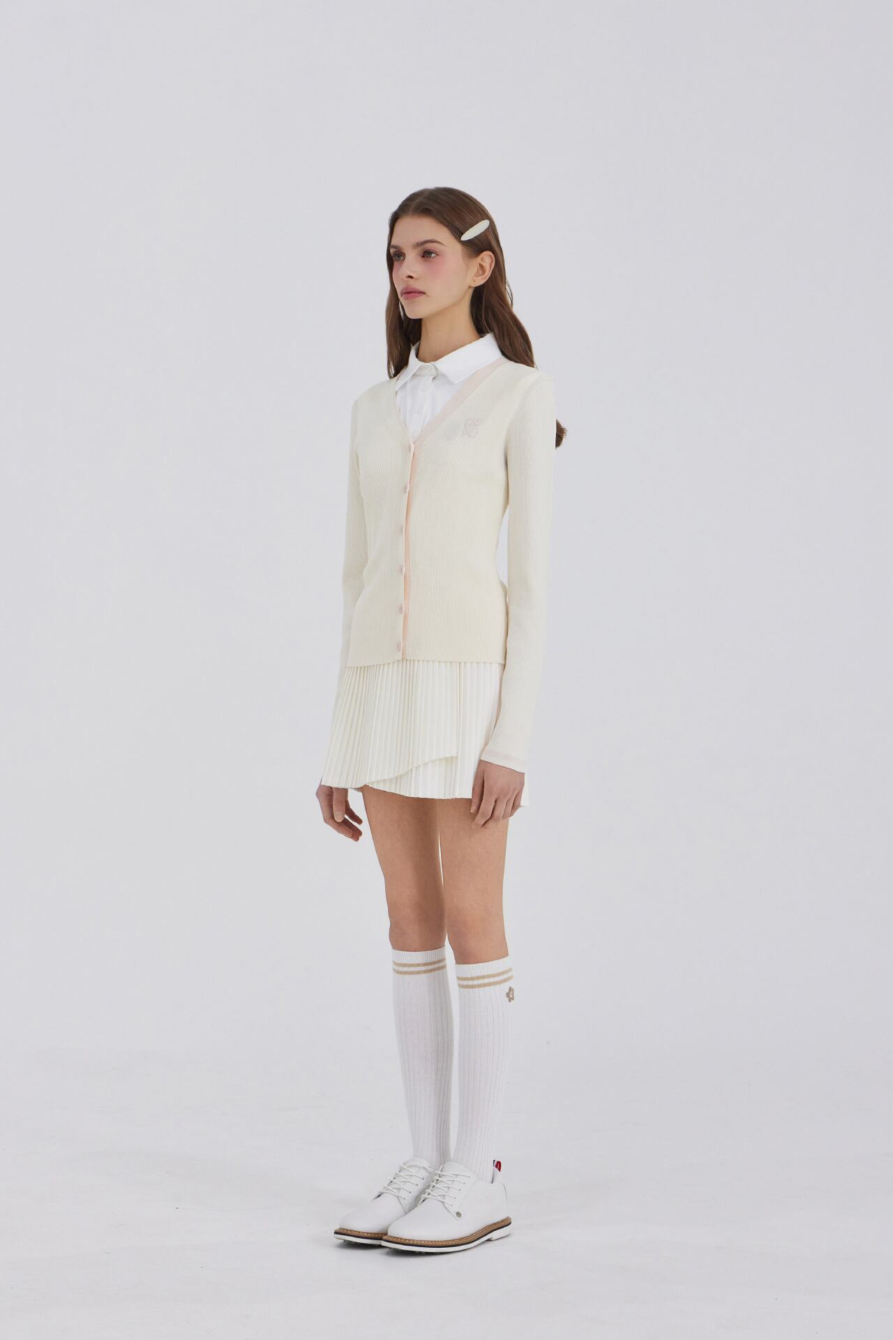 Vネックラインが際立つニットカーディガンで、ゴルフウェア特有の整ったムードをやさしく表現したアイテムです。