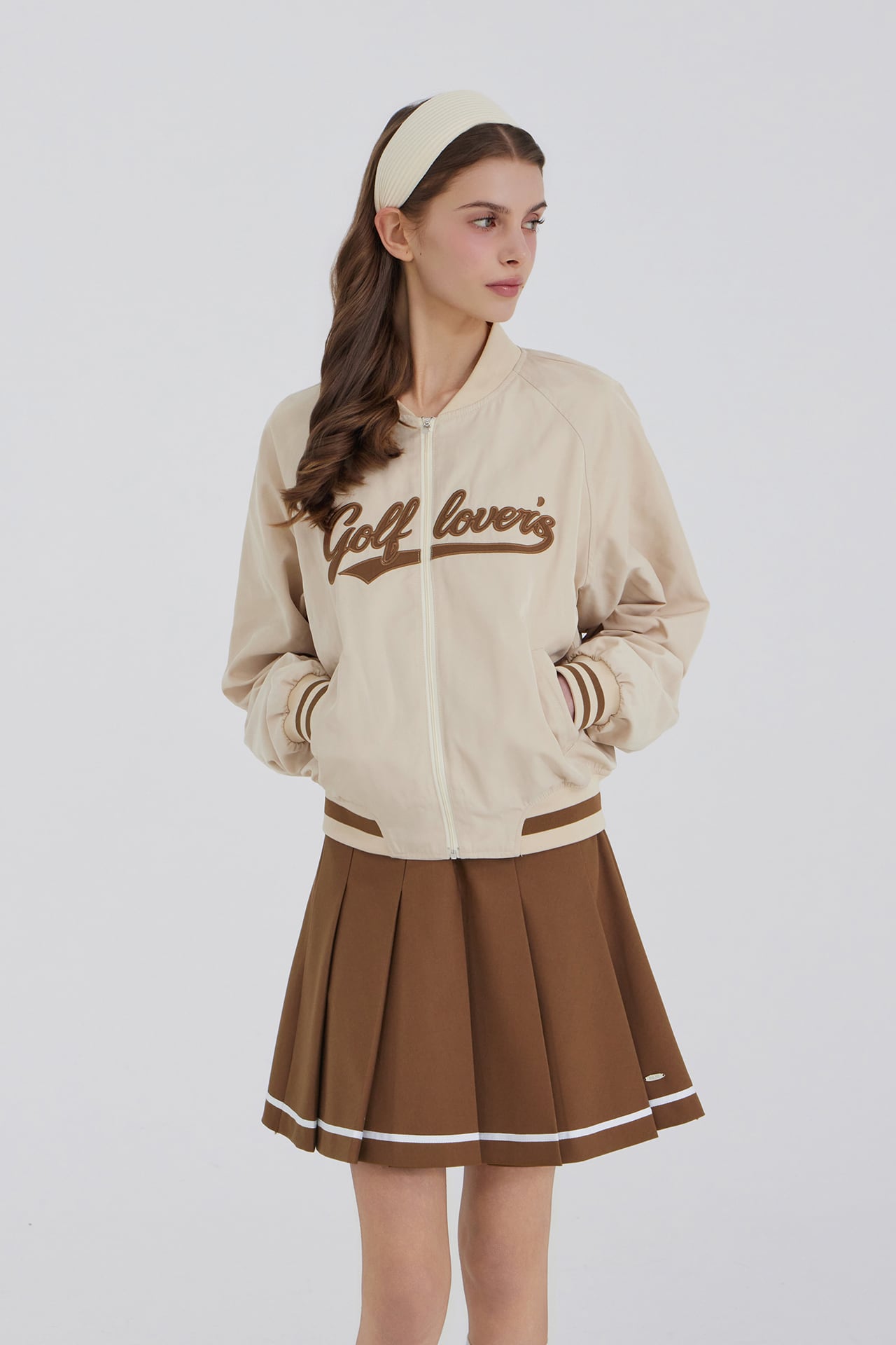 裾に加えられたラインテープのディテールが全体のデザインにアクセントを加え、金属ロゴの装飾でブランドの感性を込めました。