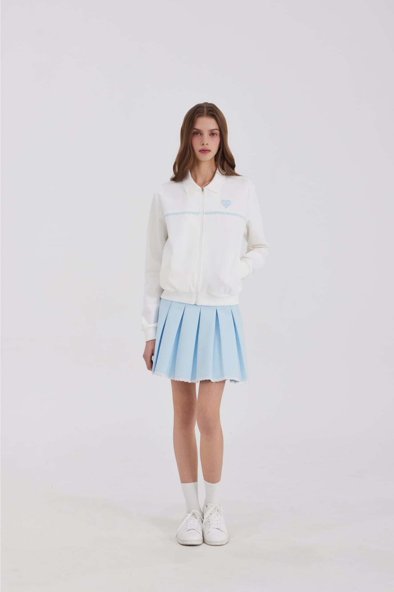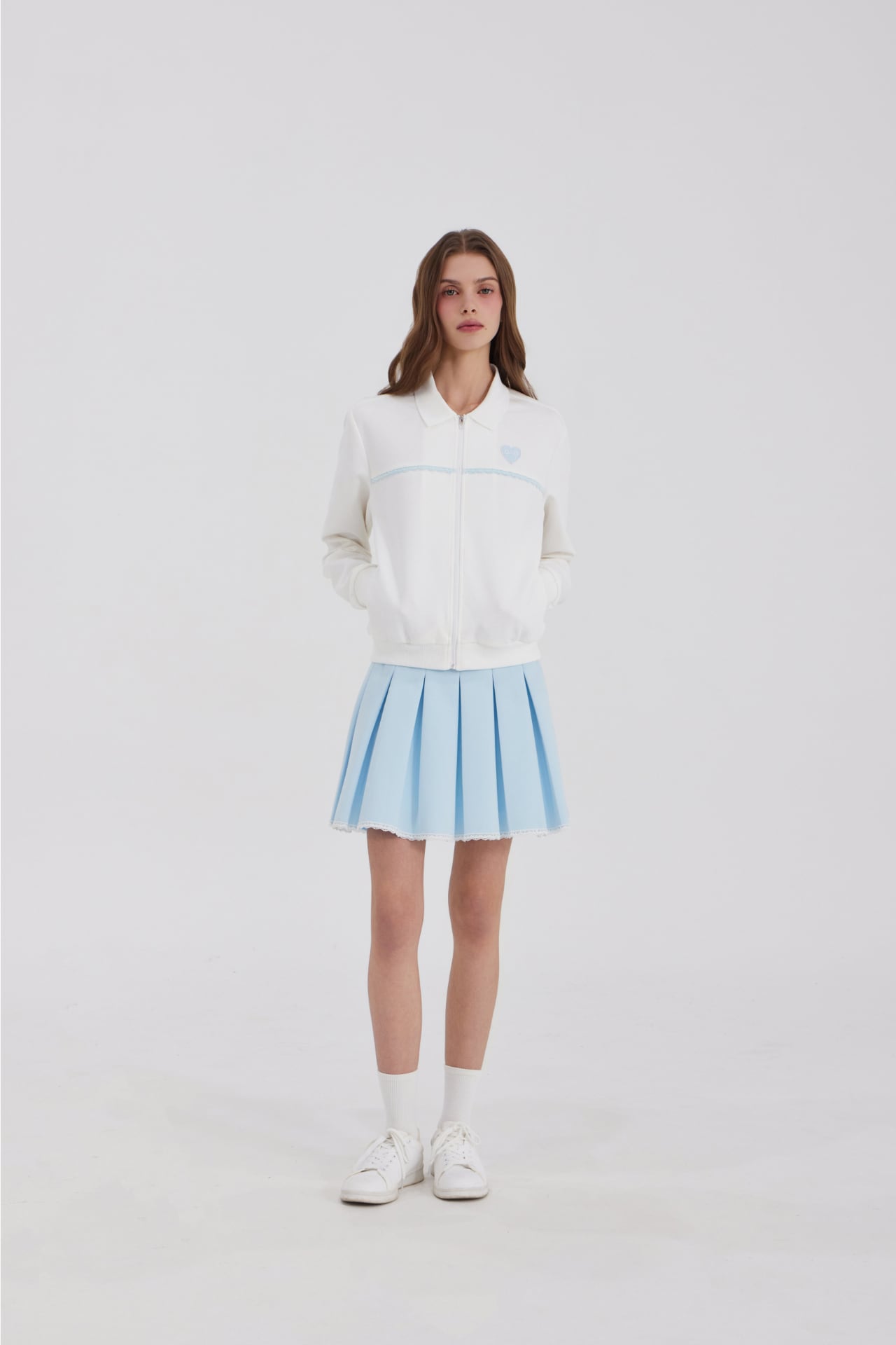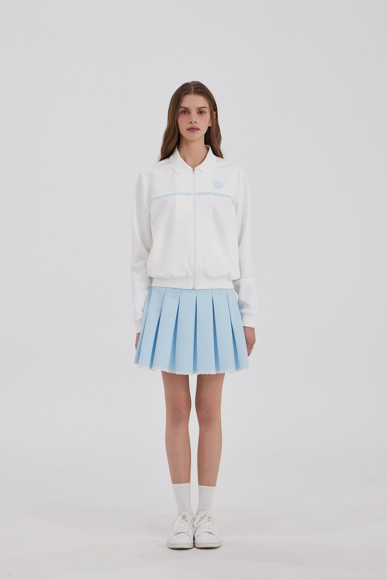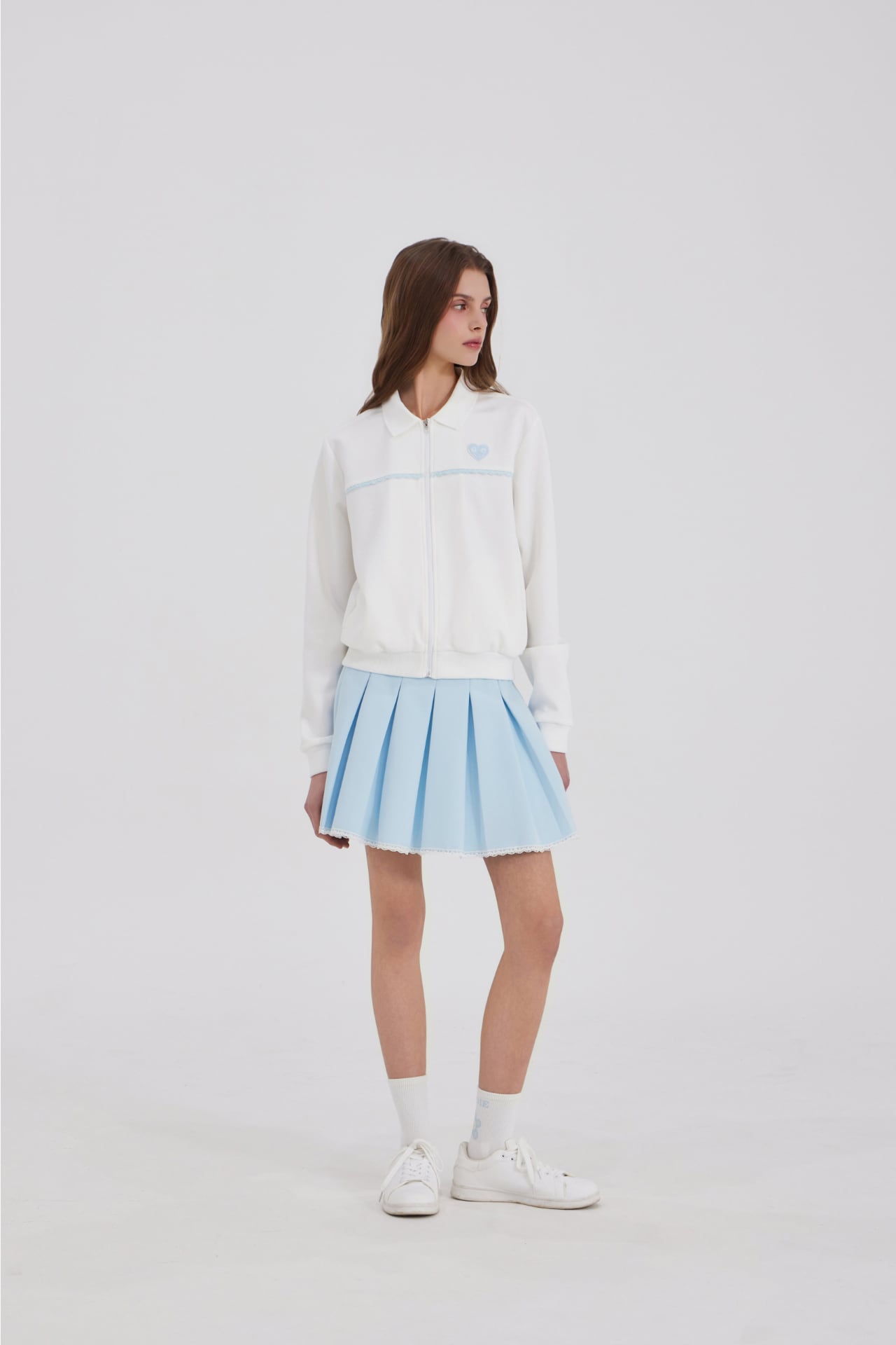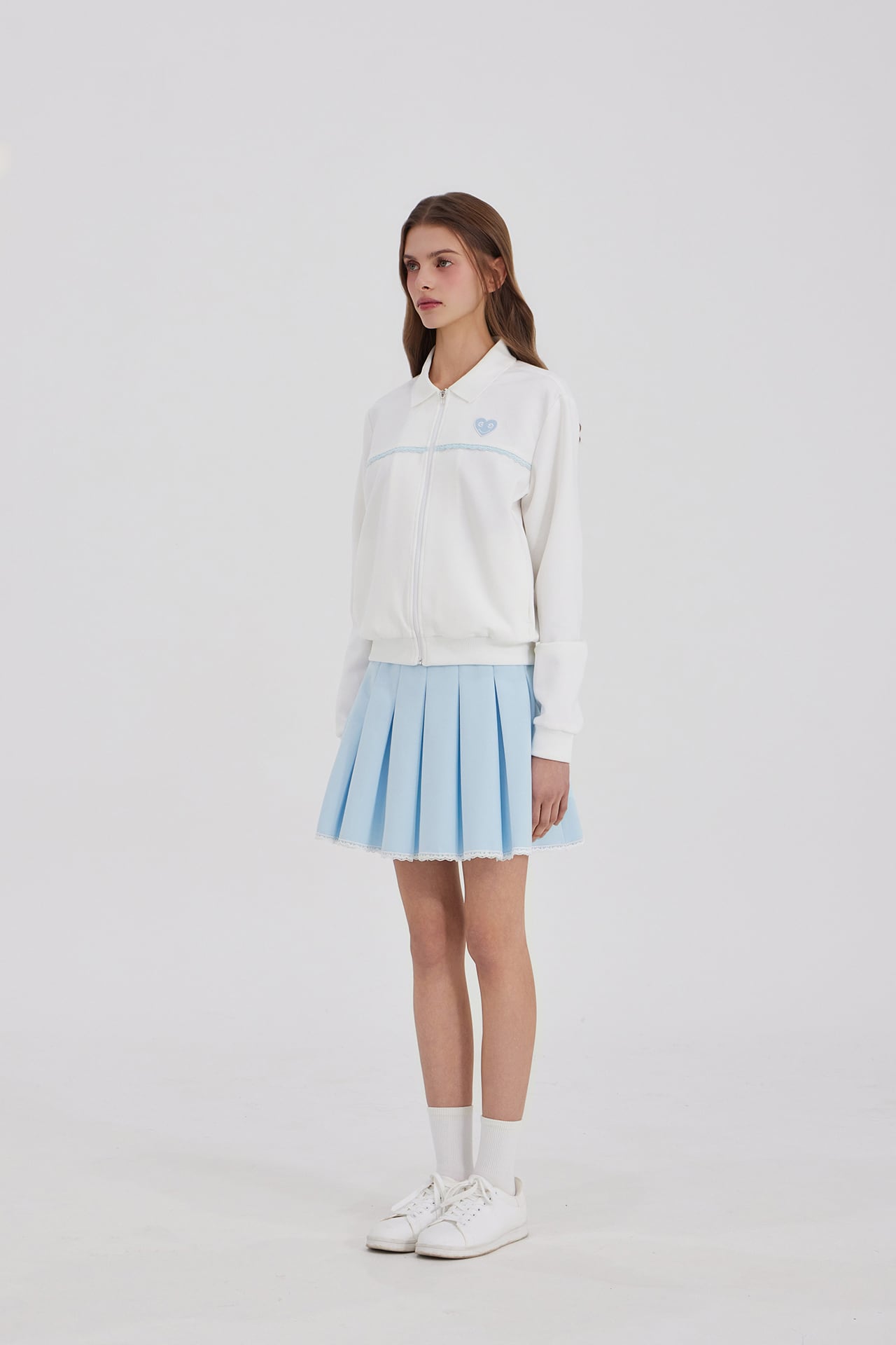 スカートの裾全体にレースの仕上げを加え、動くたびに女性らしく柔らかな雰囲気を演出します。