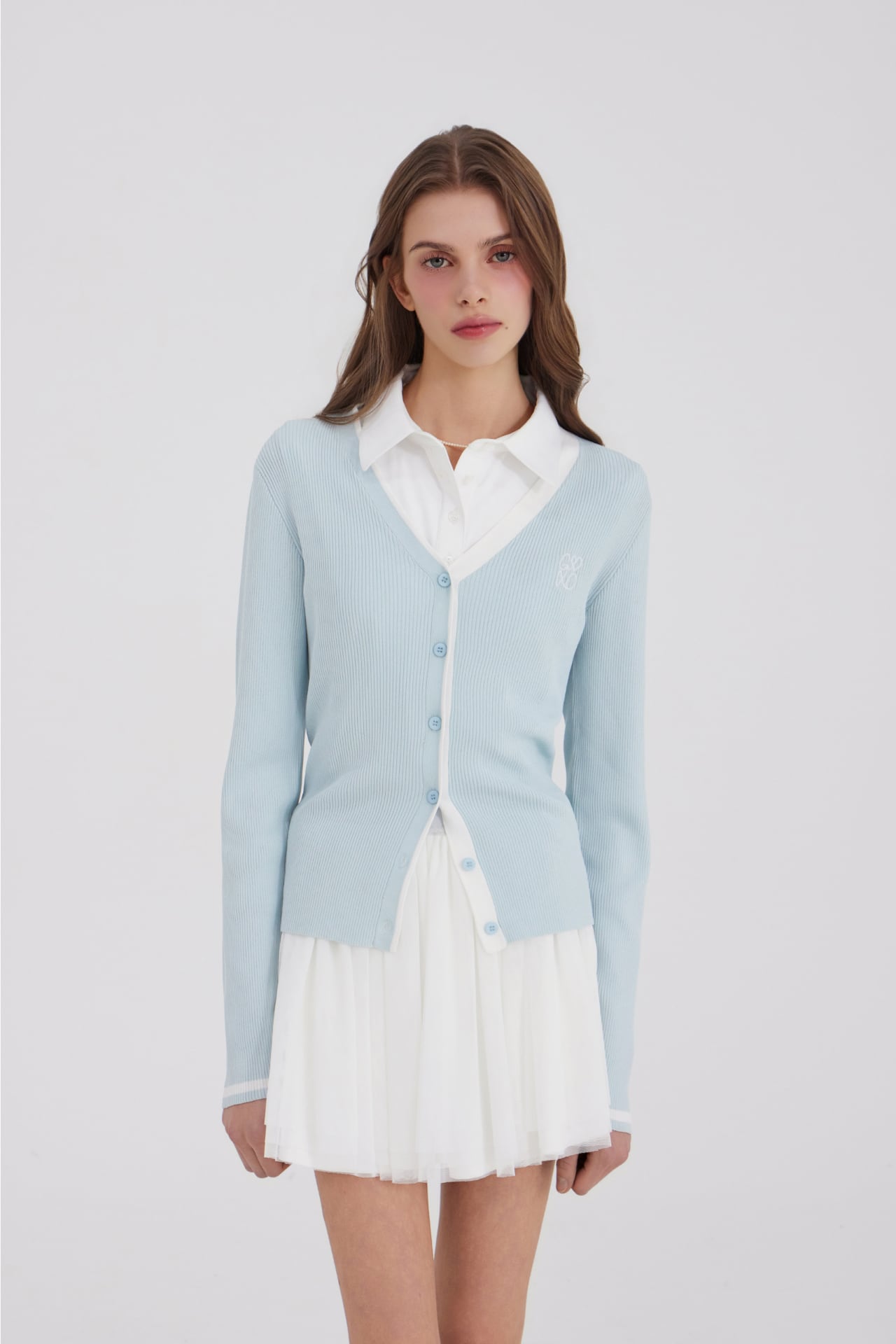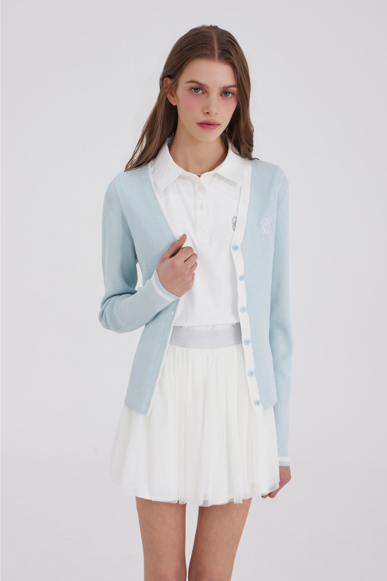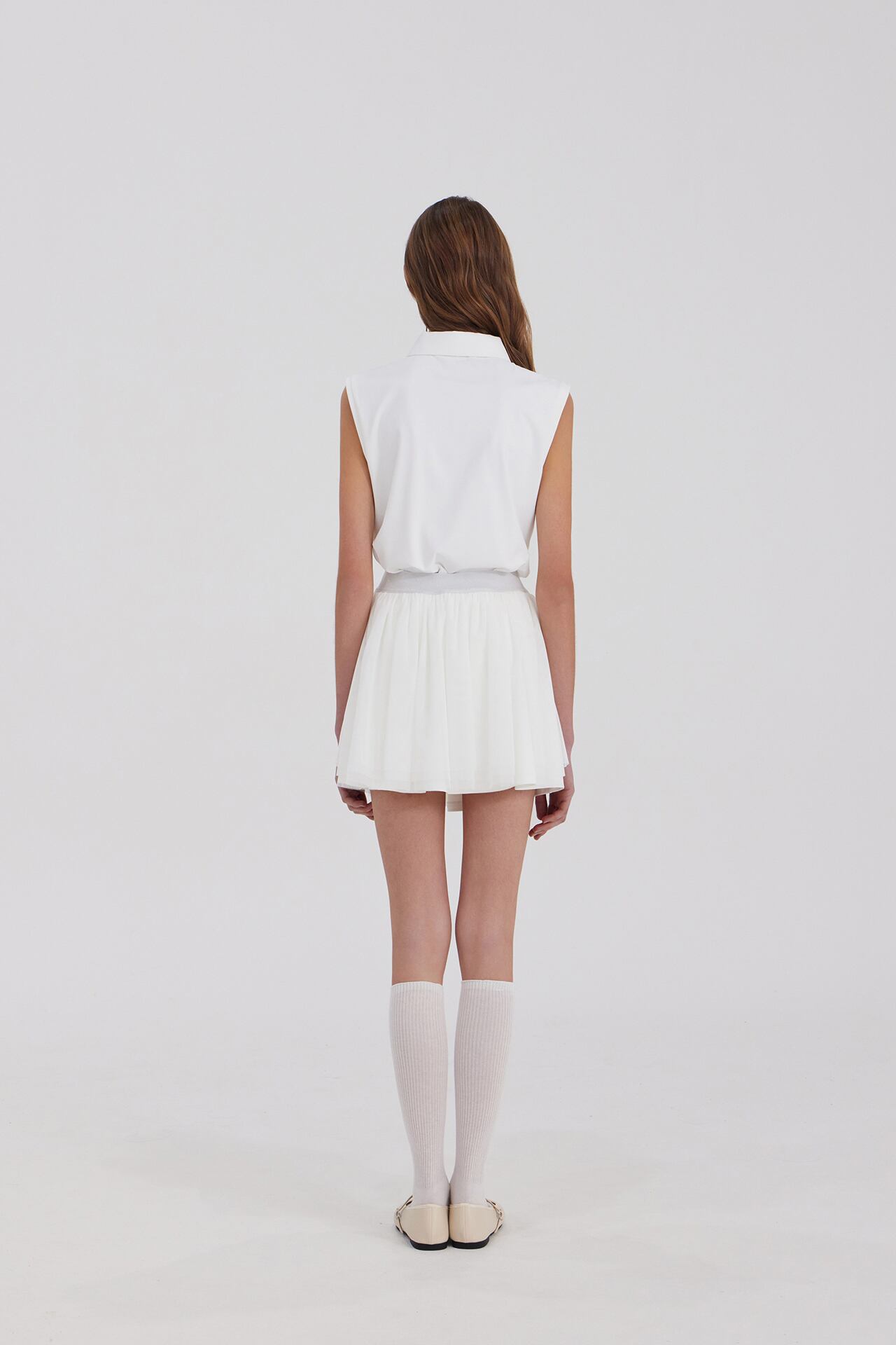 インナーが内蔵された構造で、単独で着用しても安定感を保ち、シャ素材特有の透明感とレイヤードディテールが調和して軽快な印象を完成させます。