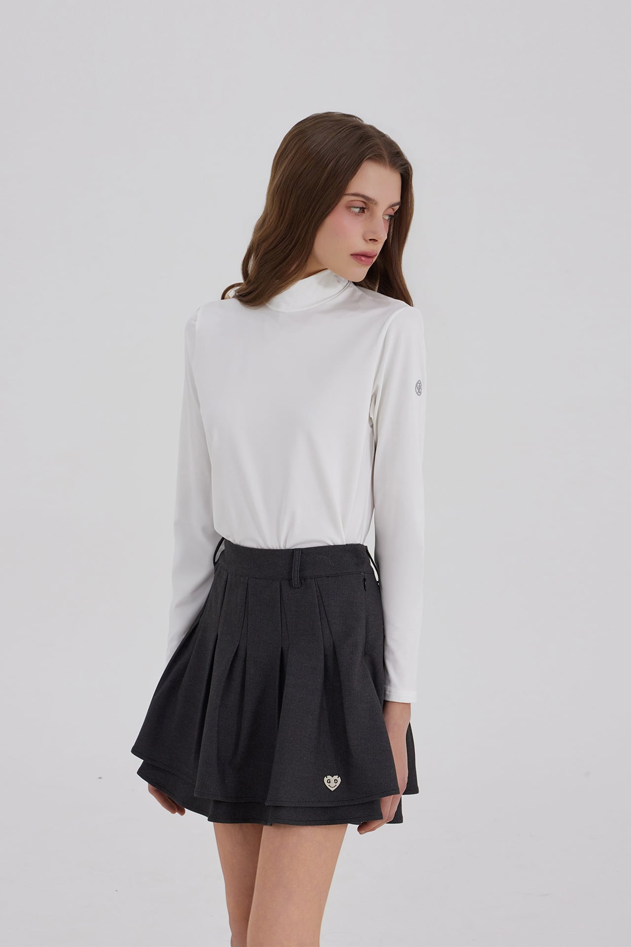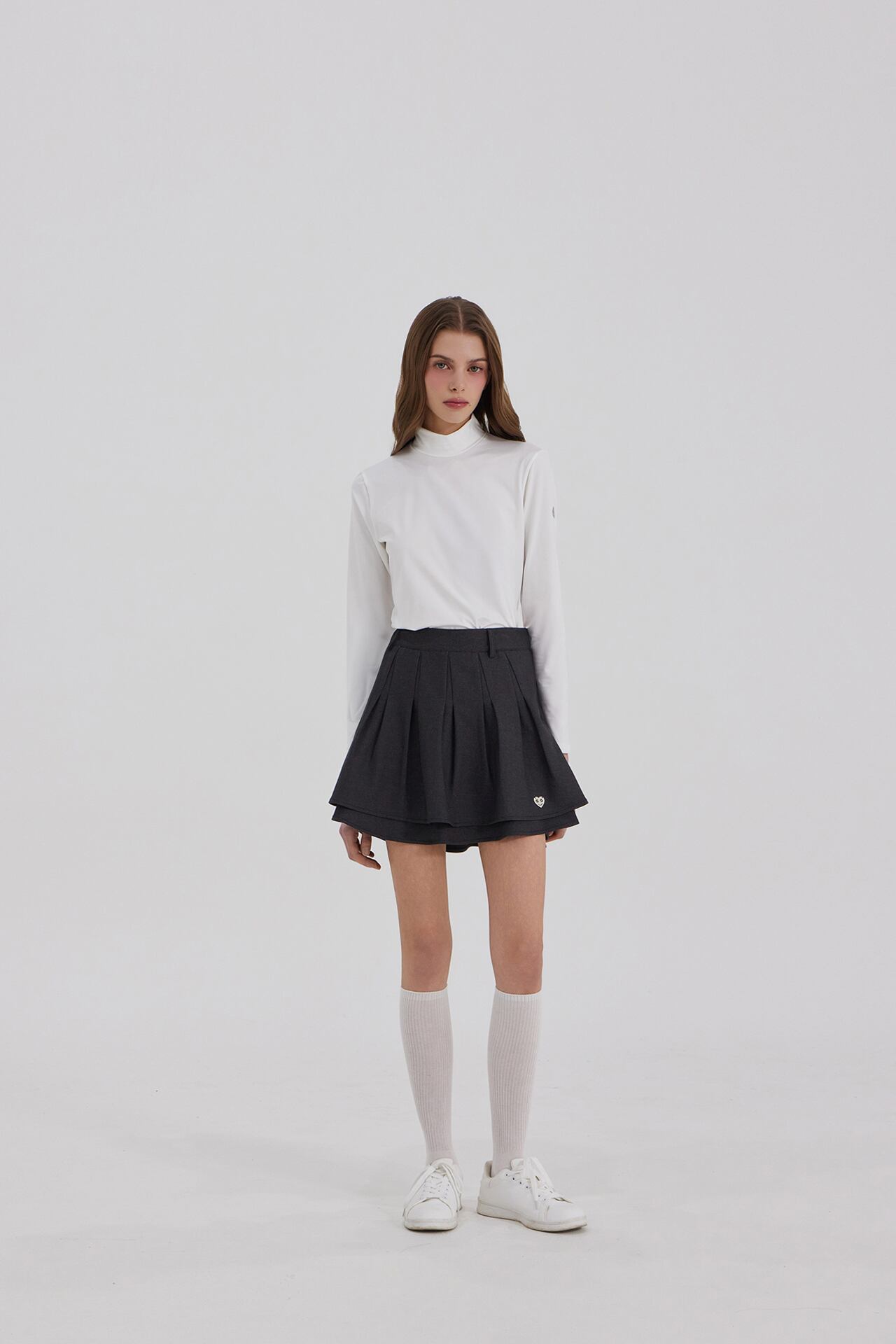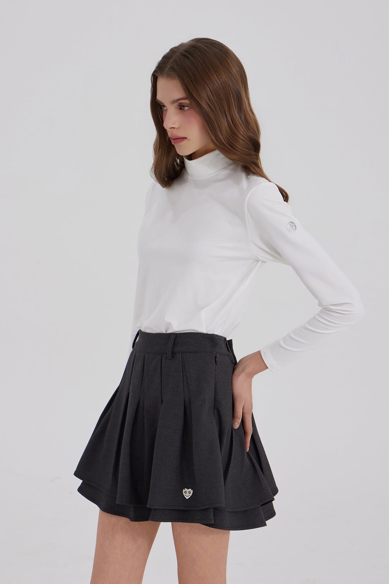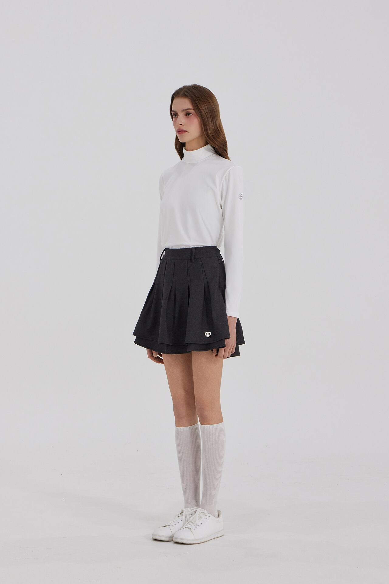 2段レイヤー構造に深いプリーツを加え、シルエットが引き立つゴルフスカートです。